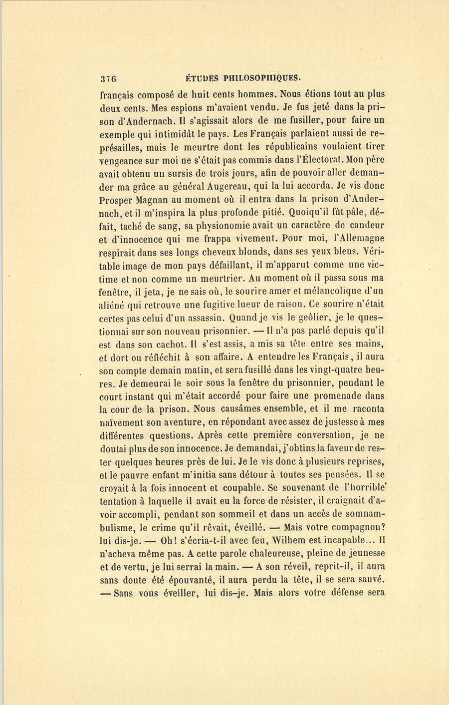 – À la paix d’Amiens, je vins en France pour apporter à la mère cette belle parole : – Il était innocent. J’avais religieusement entrepris ce pèlerinage. Mais madame Magnan était morte de consomption. Ce ne fut pas sans une émotion profonde que je brûlai la lettre dont j’étais porteur. Vous vous moquerez peut-être de mon exaltation germanique, mais je vis un drame de mélancolie sublime dans le secret éternel qui allait ensevelir ces adieux jetés entre deux tombes, ignorés de toute la création, comme un cri poussé au milieu du désert par le voyageur que surprend un lion.