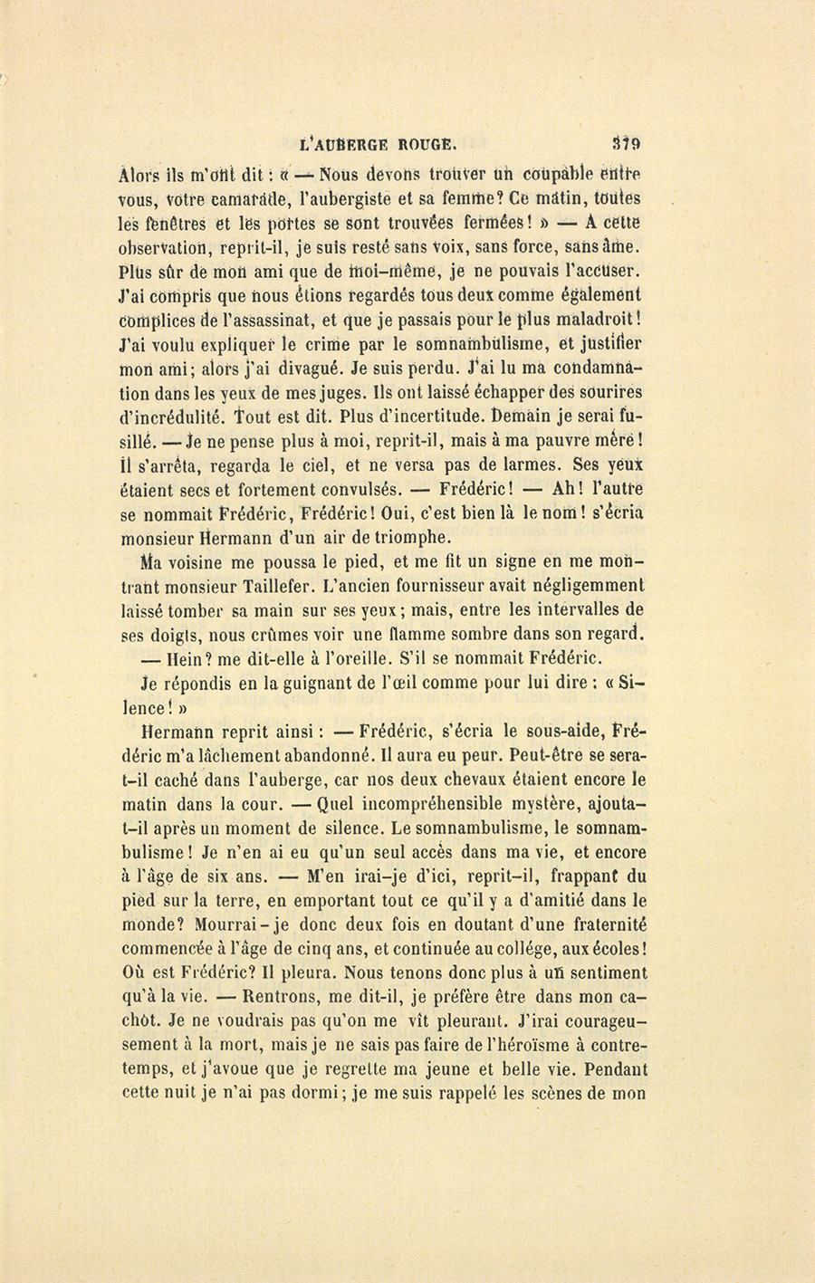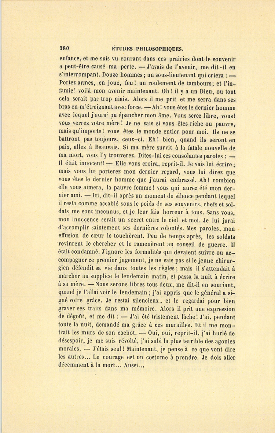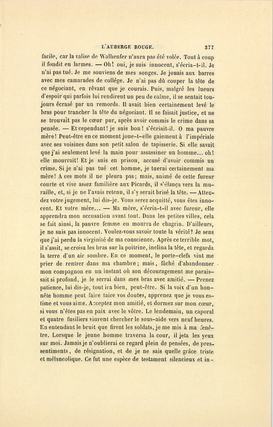 Hermann reprit ainsi : – Frédéric, s’écria le sous-aide, Frédéric m’a lâchement abandonné. Il aura eu peur. Peut-être se sera-t-il caché dans l’auberge, car nos deux chevaux étaient encore le matin dans la cour. – Quel incompréhensible mystère, ajouta-t-il après un moment de silence. Le somnambulisme, le somnambulisme ! Je n’en ai eu qu’un seul accès dans ma vie, et encore à l’âge de six ans. – M’en irai-je d’ici, reprit-il, frappant du pied sur la terre, en emportant tout ce qu’il y a d’amitié dans le monde ? Mourrai-je donc deux fois en doutant d’une fraternité commencée à l’âge de cinq ans, et continuée au collége, aux écoles ! Où est Frédéric ? Il pleura. Nous tenons donc plus à un sentiment qu’à la vie. – Rentrons, me dit-il, je préfère être dans mon cachot. Je ne voudrais pas qu’on me vît pleurant. J’irai courageusement à la mort, mais je ne sais pas faire de l’héroïsme à contretemps, et j’avoue que je regrette ma jeune et belle vie. Pendant cette nuit je n’ai pas dormi ; je me suis rappelé les scènes de mon {p. 380} enfance, et me suis vu courant dans ces prairies dont le souvenir a peut-être causé ma perte. – J’avais de l’avenir, me dit-il en s’interrompant. Douze hommes ; un sous-lieutenant qui criera : – Portez armes, en joue, feu ! un roulement de tambours ; et l’infamie ! voilà mon avenir maintenant. Oh ! il y a un Dieu, ou tout cela serait par trop niais. Alors il me prit et me serra dans ses bras en m’étreignant avec force. – Ah ! vous êtes le dernier homme avec lequel j’aurai pu épancher mon âme. Vous serez libre, vous ! vous verrez votre mère ! Je ne sais si vous êtes riche ou pauvre, mais qu’importe ! vous êtes le monde entier pour moi. Ils ne se battront pas toujours, ceux-ci. Eh ! bien, quand ils seront en paix, allez à Beauvais. Si ma mère survit à la fatale nouvelle de ma mort, vous l’y trouverez. Dites-lui ces consolantes paroles : – Il était innocent ! – Elle vous croira, reprit-il. Je vais lui écrire ; mais vous lui porterez mon dernier regard, vous lui direz que vous êtes le dernier homme que j’aurai embrassé. Ah ! combien elle vous aimera, la pauvre femme ! vous qui aurez été mon dernier ami. – Ici, dit-il après un moment de silence pendant lequel il resta comme accablé sous le poids de ses souvenirs, chefs et soldats me sont inconnus, et je leur fais horreur à tous. Sans vous, mon innocence serait un secret entre le ciel et moi. Je lui jurai d’accomplir saintement ses dernières volontés. Mes paroles, mon effusion de cœur le touchèrent. Peu de temps après, les soldats revinrent le chercher et le ramenèrent au conseil de guerre. Il était condamné. J’ignore les formalités qui devaient suivre ou accompagner ce premier jugement, je ne sais pas si le jeune chirurgien défendit sa vie dans toutes les règles ; mais il s’attendait à marcher au supplice le lendemain matin, et passa la nuit à écrire à sa mère. – Nous serons libres tous deux, me dit-il en souriant, quand je l’allai voir le lendemain ; j’ai appris que le général a signé votre grâce. Je restai silencieux, et le regardai pour bien graver ses traits dans ma mémoire. Alors il prit une expression de dégoût, et me dit : – J’ai été tristement lâche ! J’ai, pendant toute la nuit, demandé ma grâce à ces murailles. Et il me montrait les murs de son cachot. – Oui, oui, reprit-il, j’ai hurlé de désespoir, je me suis révolté, j’ai subi la plus terrible des agonies morales. – J’étais seul ! Maintenant, je pense à ce que vont dire les autres… Le courage est un costume à prendre. Je dois aller décemment à la mort… Aussi…