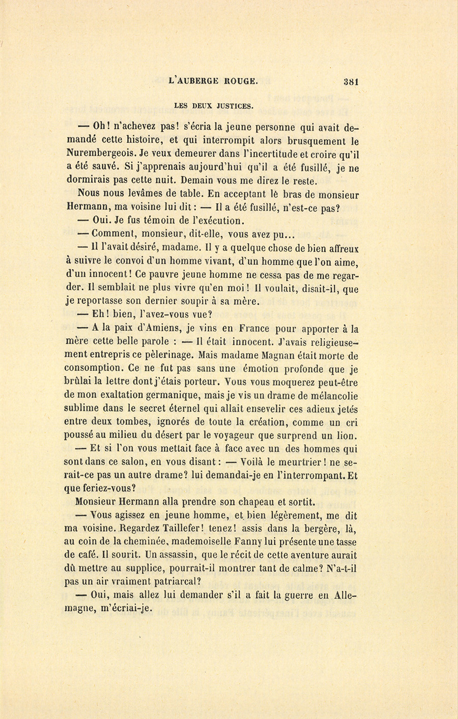 – Oh ! n’achevez pas ! s’écria la jeune personne qui avait demandé cette histoire, et qui interrompit alors brusquement le Nurembergeois. Je veux demeurer dans l’incertitude et croire qu’il a été sauvé. Si j’apprenais aujourd’hui qu’il a été fusillé, je ne dormirais pas cette nuit. Demain vous me direz le reste.