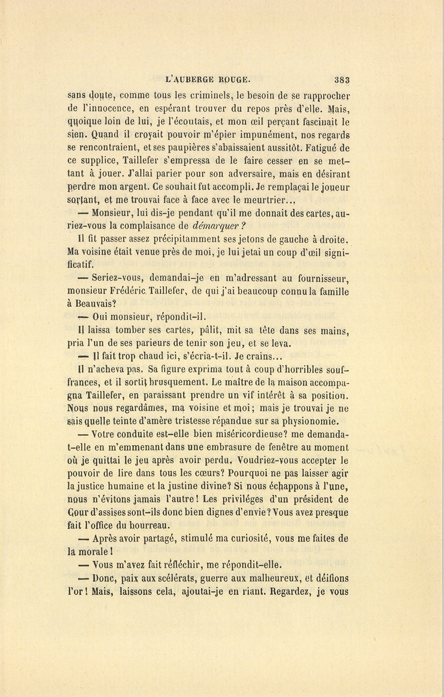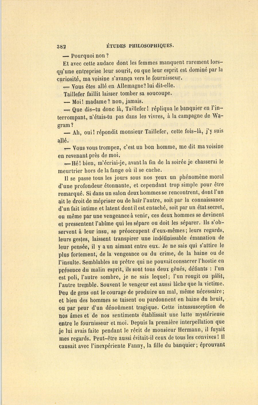 Il se passe tous les jours sous nos yeux un phénomène moral d’une profondeur étonnante, et cependant trop simple pour être remarqué. Si dans un salon deux hommes se rencontrent, dont l’un ait le droit de mépriser ou de haïr l’autre, soit par la connaissance d’un fait intime et latent dont il est entaché, soit par un état secret, ou même par une vengeance à venir, ces deux hommes se devinent et pressentent l’abîme qui les sépare ou doit les séparer. Ils s’observent à leur insu, se préoccupent d’eux-mêmes ; leurs regards, leurs gestes, laissent transpirer une indéfinissable émanation de leur pensée, il y a un aimant entre eux. Je ne sais qui s’attire le plus fortement, de la vengeance ou du crime, de la haine ou de l’insulte. Semblables au prêtre qui ne pouvait consacrer l’hostie en présence du malin esprit, ils sont tous deux gênés, défiants : l’un est poli, l’autre sombre, je ne sais lequel ; l’un rougit ou pâlit, l’autre tremble. Souvent le vengeur est aussi lâche que la victime. Peu de gens ont le courage de produire un mal, même nécessaire ; et bien des hommes se taisent ou pardonnent en haine du bruit, ou par peur d’un dénoûment tragique. Cette intussusception de nos âmes et de nos sentiments établissait une lutte mystérieuse entre le fournisseur et moi. Depuis la première interpellation que je lui avais faite pendant le récit de monsieur Hermann, il fuyait mes regards. Peut-être aussi évitait-il ceux de tous les convives ! Il causait avec l’inexpériente Fanny, la fille du banquier ; éprouvant {p. 383} sans doute, comme tous les criminels, le besoin de se rapprocher de l’innocence, en espérant trouver du repos près d’elle. Mais, quoique loin de lui, je l’écoutais, et mon œil perçant fascinait le sien. Quand il croyait pouvoir m’épier impunément, nos regards se rencontraient, et ses paupières s’abaissaient aussitôt. Fatigué de ce supplice, Taillefer s’empressa de le faire cesser en se mettant à jouer. J’allai parier pour son adversaire, mais en désirant perdre mon argent. Ce souhait fut accompli. Je remplaçai le joueur sortant, et me trouvai face à face avec le meurtrier…