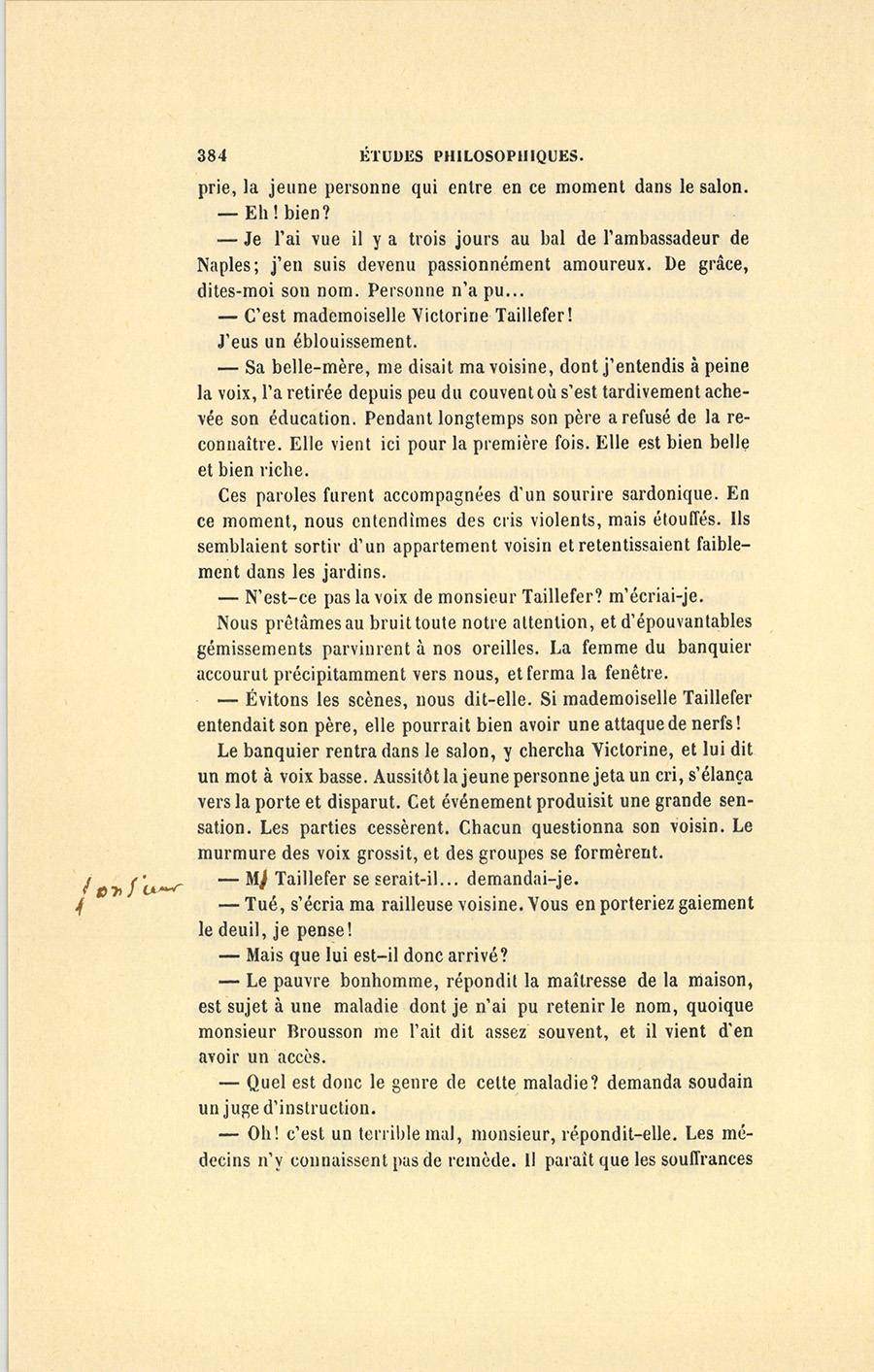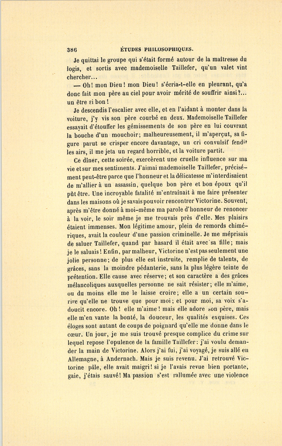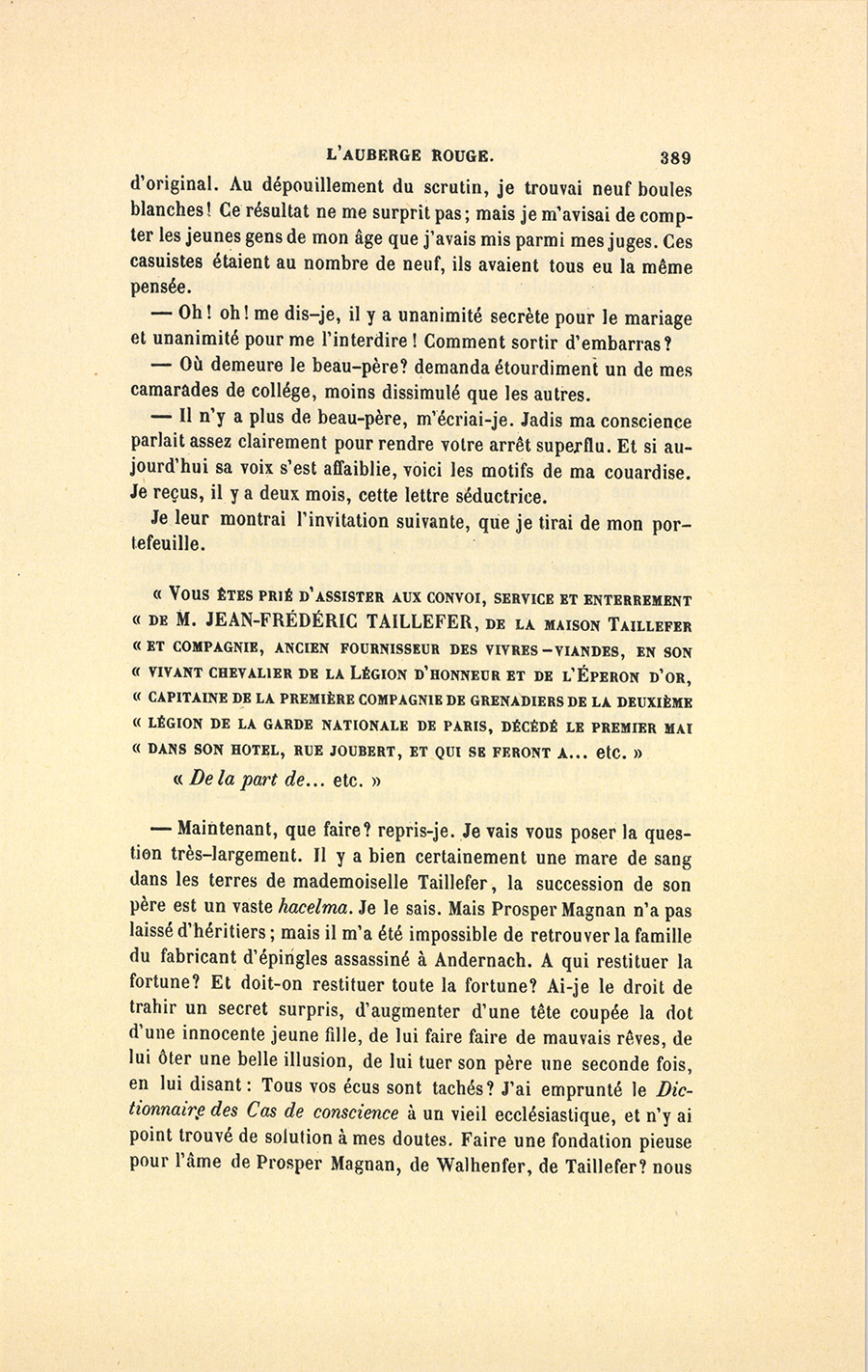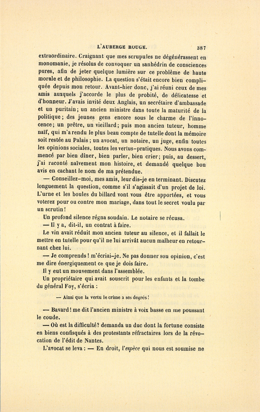 Ce dîner, cette soirée, exercèrent une cruelle influence sur ma vie et sur mes sentiments. J’aimai mademoiselle Taillefer, précisément peut-être parce que l’honneur et la délicatesse m’interdisaient de m’allier à un assassin, quelque bon père et bon époux qu’il pût être. Une incroyable fatalité m’entraînait à me faire présenter dans les maisons où je savais pouvoir rencontrer Victorine. Souvent, après m’être donné à moi-même ma parole d’honneur de renoncer à la voir, le soir même je me trouvais près d’elle. Mes plaisirs étaient immenses. Mon légitime amour, plein de remords chimériques, avait la couleur d’une passion criminelle. Je me méprisais de saluer Taillefer, quand par hasard il était avec sa fille ; mais je le saluais ! Enfin, par malheur, Victorine n’est pas seulement une jolie personne ; de plus elle est instruite, remplie de talents, de grâces, sans la moindre pédanterie, sans la plus légère teinte de prétention. Elle cause avec réserve ; et son caractère a des grâces mélancoliques auxquelles personne ne sait résister ; elle m’aime, ou du moins elle me le laisse croire ; elle a un certain sourire qu’elle ne trouve que pour moi ; et pour moi, sa voix s’adoucit encore. Oh ! elle m’aime ! mais elle adore son père, mais elle m’en vante la bonté, la douceur, les qualités exquises. Ces éloges sont autant de coups de poignard qu’elle me donne dans le cœur. Un jour, je me suis trouvé presque complice du crime sur lequel repose l’opulence de la famille Taillefer : j’ai voulu demander la main de Victorine. Alors j’ai fui, j’ai voyagé, je suis allé en Allemagne, à Andernach. Mais je suis revenu. J’ai retrouvé Victorine pâle, elle avait maigri ! si je l’avais revue bien portante, gaie, j’étais sauvé ! Ma passion s’est rallumée avec une violence {p. 387} extraordinaire. Craignant que mes scrupules ne dégénérassent en monomanie, je résolus de convoquer un sanhédrin de consciences pures, afin de jeter quelque lumière sur ce problème de haute morale et de philosophie. La question s’était encore bien compliquée depuis mon retour. Avant-hier donc, j’ai réuni ceux de mes amis auxquels j’accorde le plus de probité, de délicatesse et d’honneur. J’avais invité deux Anglais, un secrétaire d’ambassade et un puritain ; un ancien ministre dans toute la maturité de la politique ; des jeunes gens encore sous le charme de l’innocence ; un prêtre, un vieillard ; puis mon ancien tuteur, homme naïf, qui m’a rendu le plus beau compte de tutelle dont la mémoire soit restée au Palais ; un avocat, un notaire, un juge, enfin toutes les opinions sociales, toutes les vertus pratiques. Nous avons commencé par bien dîner, bien parler, bien crier ; puis, au dessert, j’ai raconté naïvement mon histoire, et demandé quelque bon avis en cachant le nom de ma prétendue.