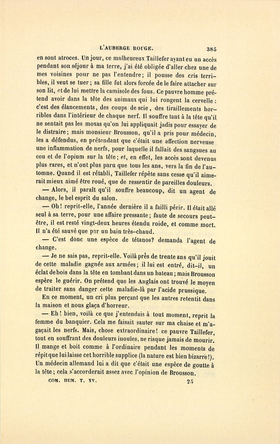– Oh ! c’est un terrible mal, monsieur, répondit-elle. Les médecins n’y connaissent pas de remède. Il paraît que les souffrances {p. 385} en sont atroces. Un jour, ce malheureux Taillefer ayant eu un accès pendant son séjour à ma terre, j’ai été obligée d’aller chez une de mes voisines pour ne pas l’entendre ; il pousse des cris terribles, il veut se tuer ; sa fille fut alors forcée de le faire attacher sur son lit, et de lui mettre la camisole des fous. Ce pauvre homme prétend avoir dans la tête des animaux qui lui rongent la cervelle : c’est des élancements, des coups de scie, des tiraillements horribles dans l’intérieur de chaque nerf. Il souffre tant à la tête qu’il ne sentait pas les moxas qu’on lui appliquait jadis pour essayer de le distraire ; mais monsieur Brousson, qu’il a pris pour médecin, les a défendus, en prétendant que c’était une affection nerveuse, une inflammation de nerfs, pour laquelle il fallait des sangsues au cou et de l’opium sur la tête ; et, en effet, les accès sont devenus plus rares, et n’ont plus paru que tous les ans, vers la fin de l’automne. Quand il est rétabli, Taillefer répète sans cesse qu’il aurait mieux aimé3 être roué, que de ressentir de pareilles douleurs.