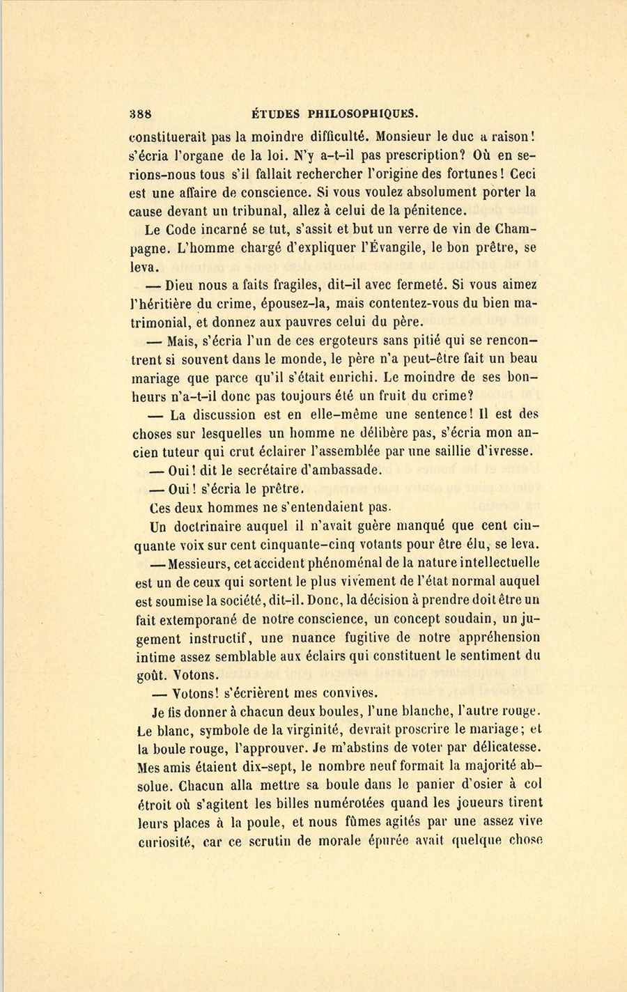 Je fis donner à chacun deux boules, l’une blanche, l’autre rouge. Le blanc, symbole de la virginité, devrait proscrire le mariage ; et la boule rouge, l’approuver. Je m’abstins de voter par délicatesse. Mes amis étaient dix-sept, le nombre neuf formait la majorité absolue. Chacun alla mettre sa boule dans le panier d’osier à col étroit où s’agitent les billes numérotées quand les joueurs tirent leurs places à la poule, et nous fûmes agités par une assez vive curiosité, car ce scrutin de morale épurée avait quelque chose {p. 389} d’original. Au dépouillement du scrutin, je trouvai neuf boules blanches ! Ce résultat ne me surprit pas ; mais je m’avisai de compter les jeunes gens de mon âge que j’avais mis parmi mes juges. Ces casuistes étaient au nombre de neuf, ils avaient tous eu la même pensée.