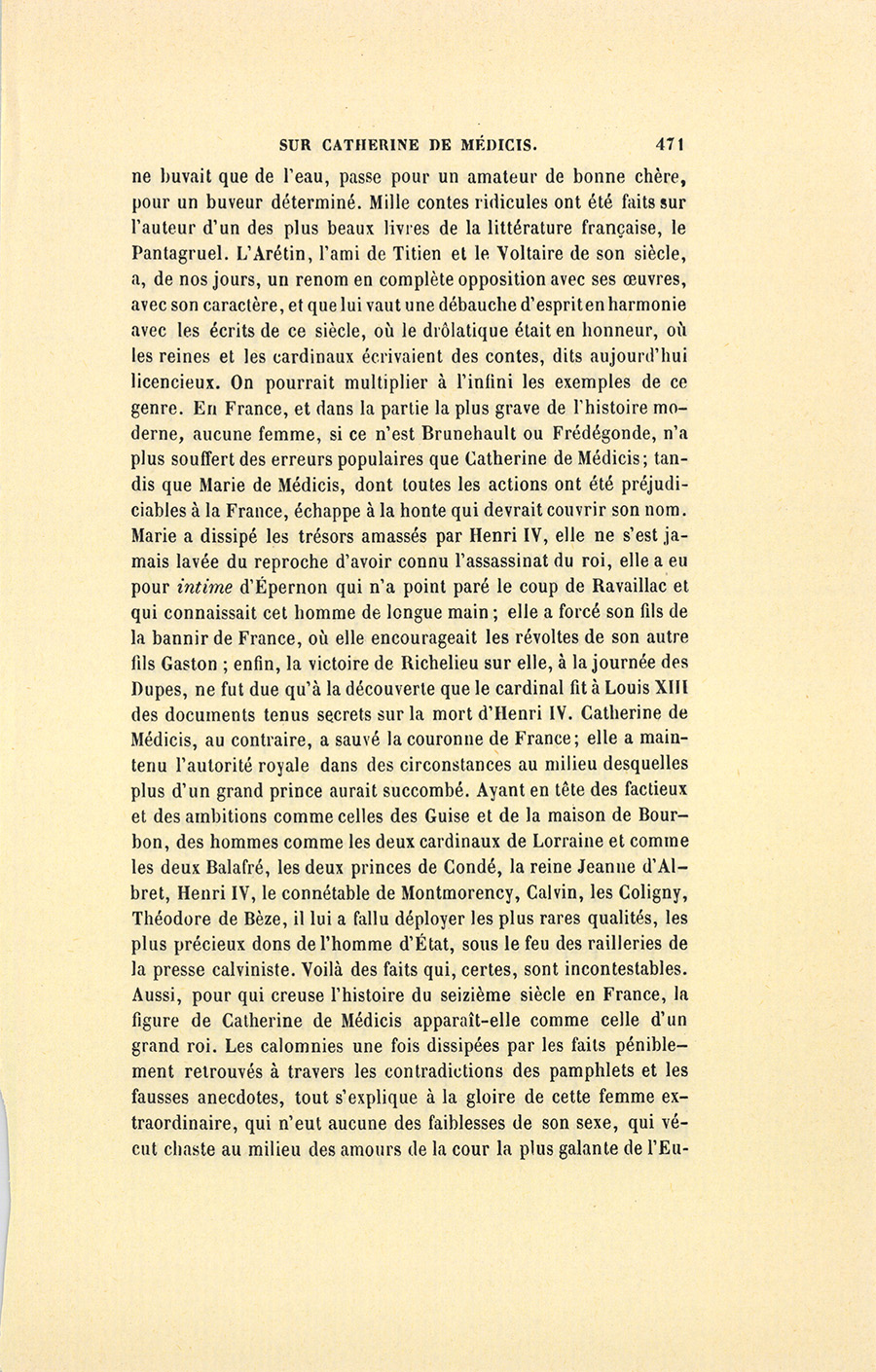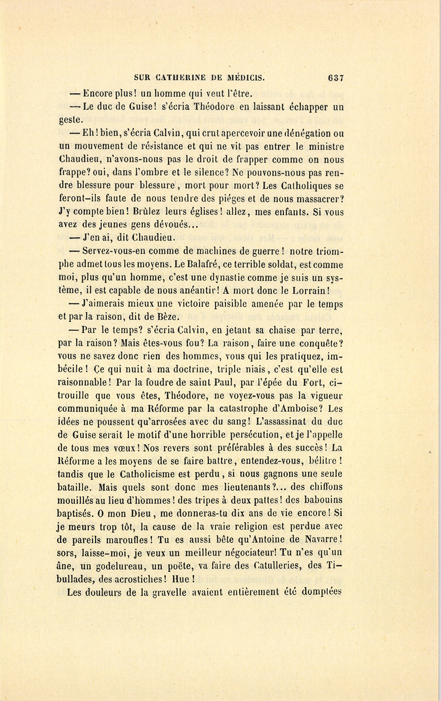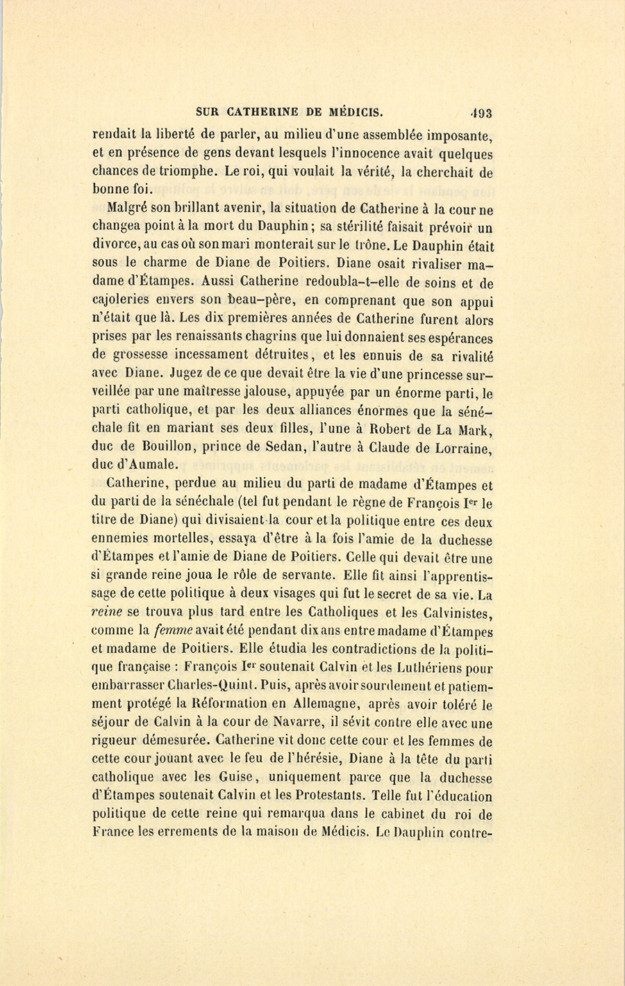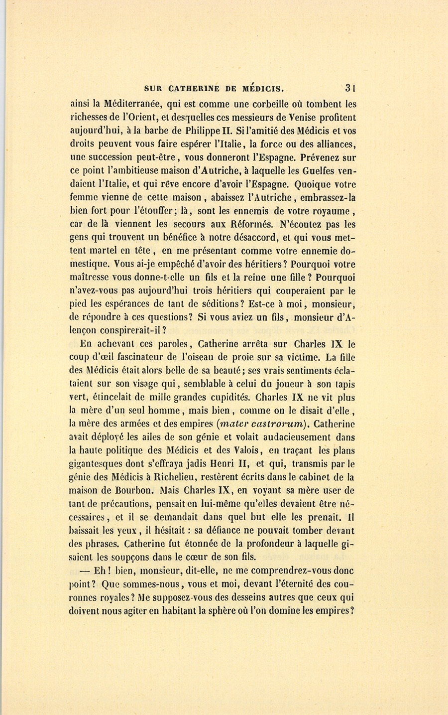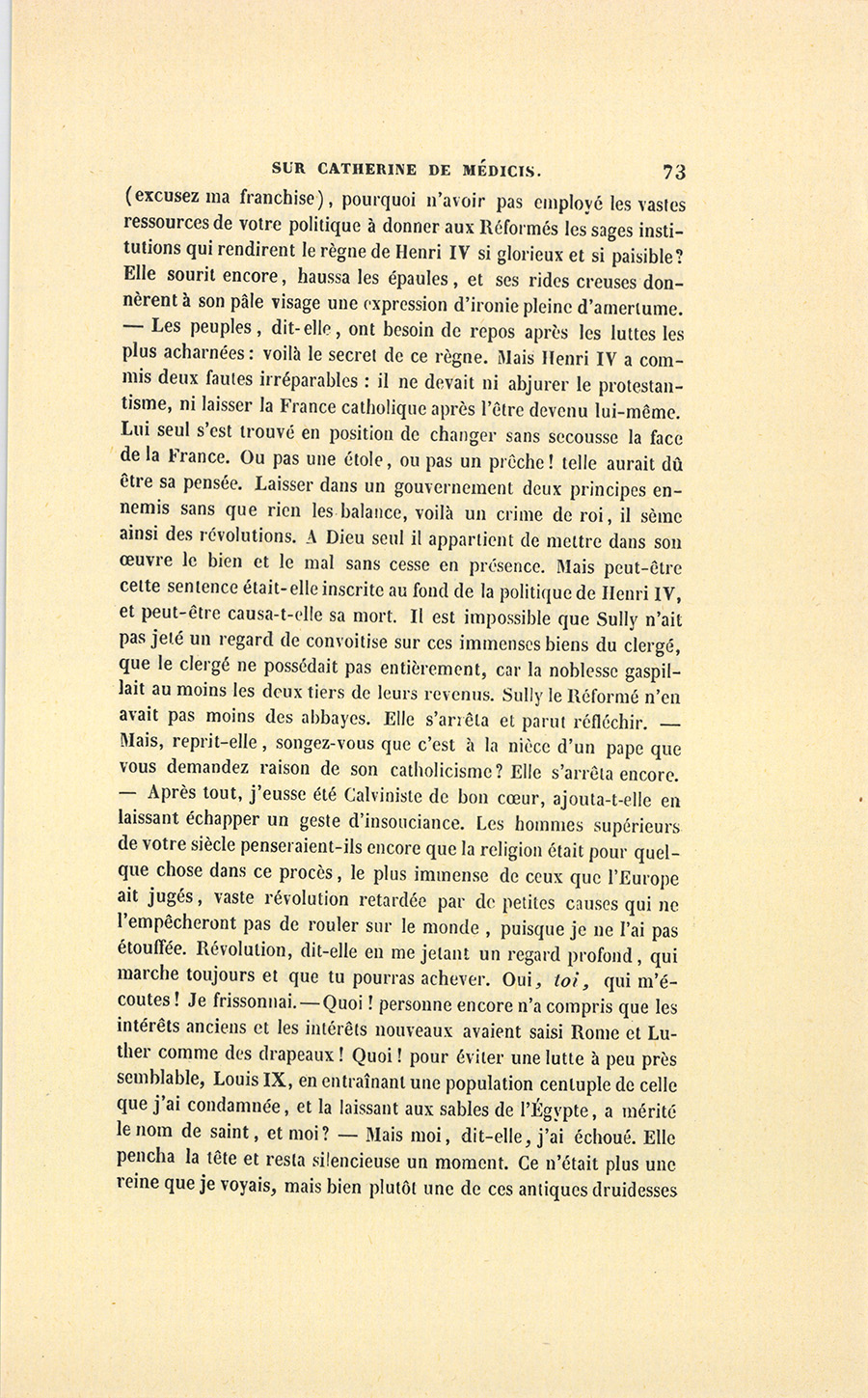 Une autre considération explique la défaveur historique et populaire de Catherine. L’Opposition en France a toujours été protestante, parce qu’elle n’a jamais eu que la négation pour politique ; elle a hérité des théories des Luthériens, des Calvinistes et des Protestants sur les mots terribles de liberté, de tolérance, de progrès et de philosophie. Deux siècles ont été employés par les opposants au pouvoir à établir la douteuse doctrine du libre arbitre. Deux autres siècles ont été employés à développer le premier corollaire du libre arbitre, la liberté de conscience. Notre siècle essaye d’établir le second, la liberté politique.
