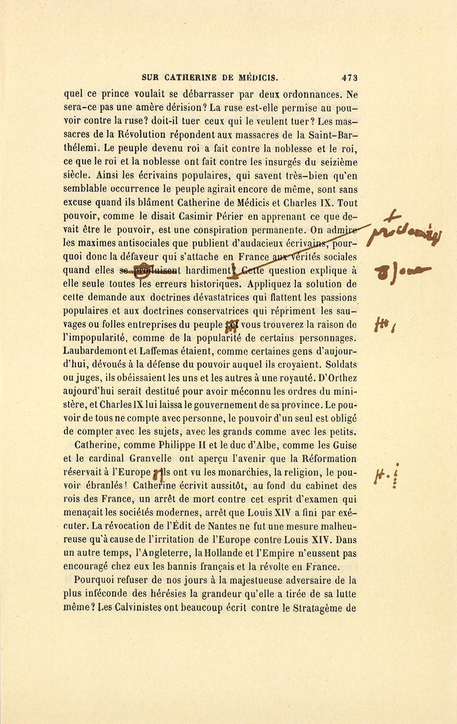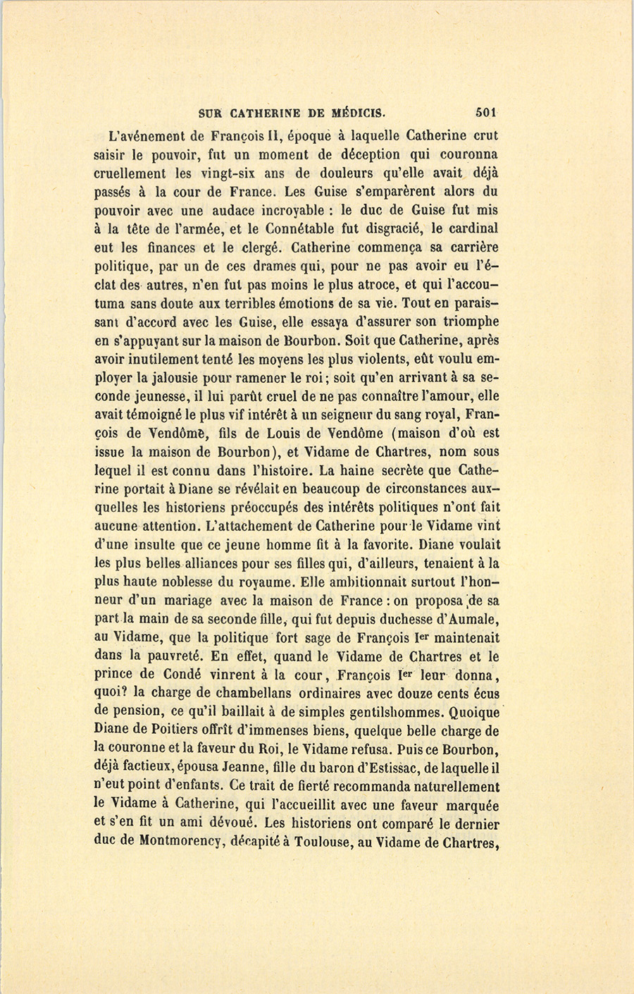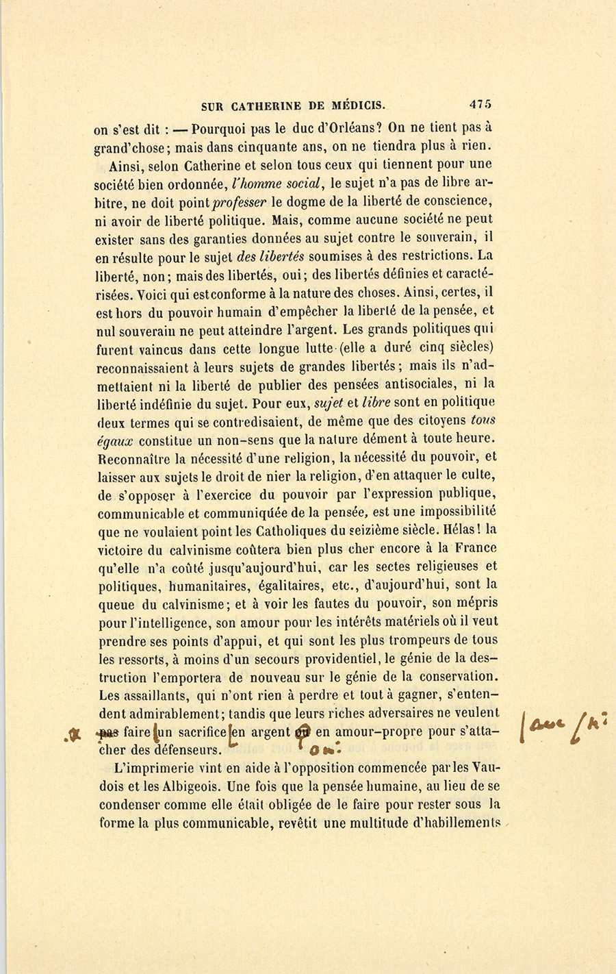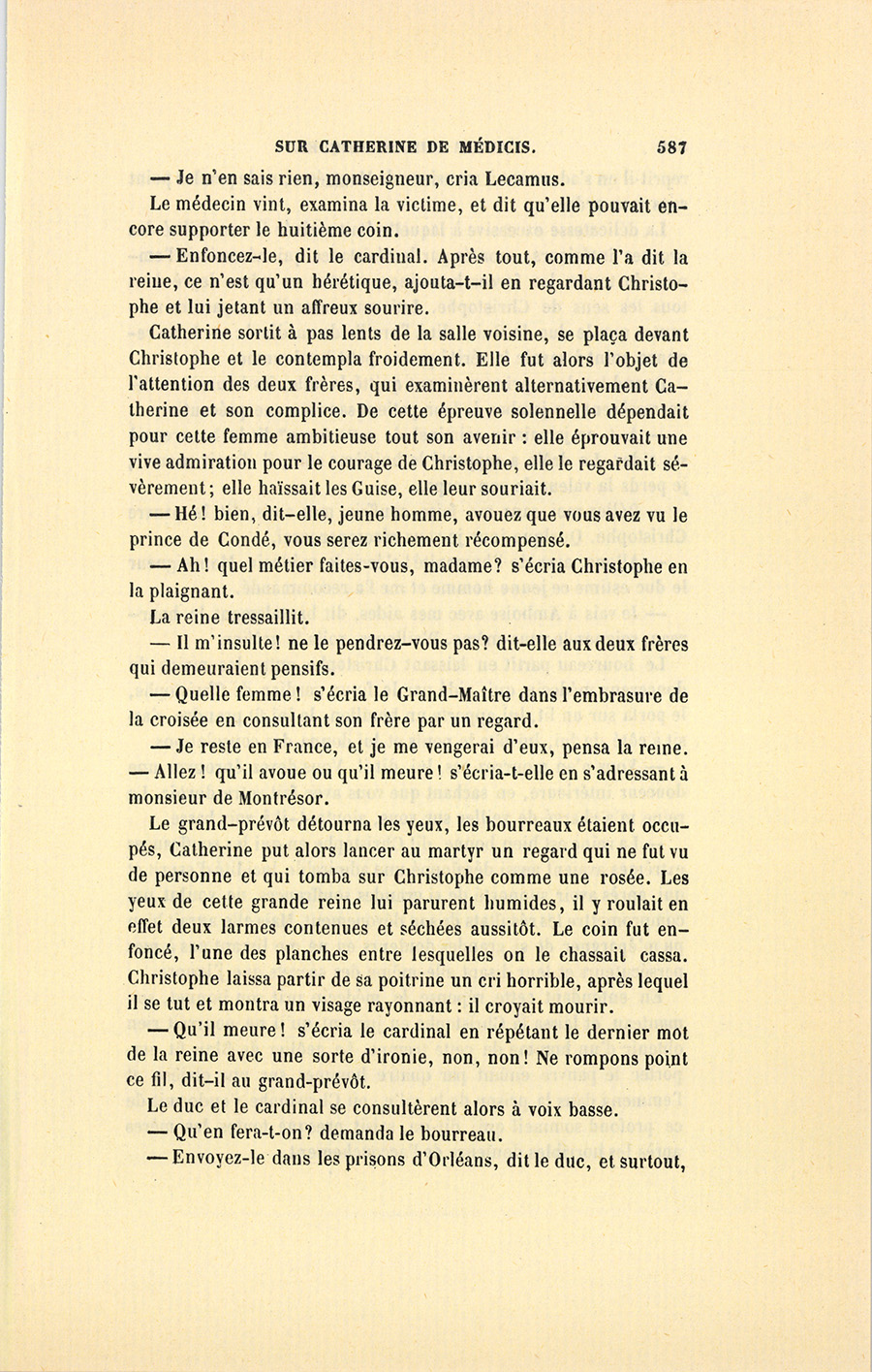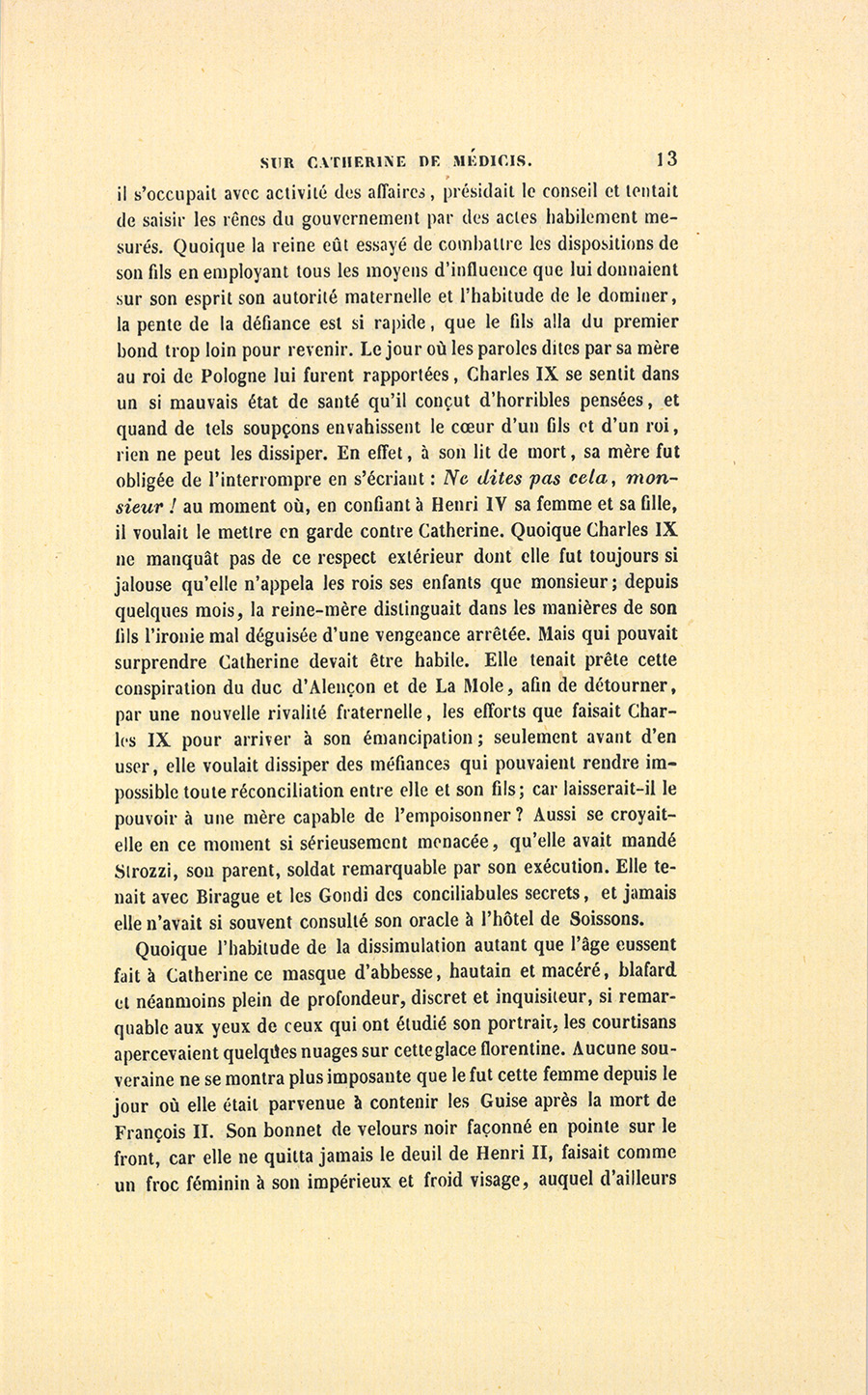 Une autre considération explique la défaveur historique et populaire de Catherine. L’Opposition en France a toujours été protestante, parce qu’elle n’a jamais eu que la négation pour politique ; elle a hérité des théories des Luthériens, des Calvinistes et des Protestants sur les mots terribles de liberté, de tolérance, de progrès et de philosophie. Deux siècles ont été employés par les opposants au pouvoir à établir la douteuse doctrine du libre arbitre. Deux autres siècles ont été employés à développer le premier corollaire du libre arbitre, la liberté de conscience. Notre siècle essaye d’établir le second, la liberté politique.
