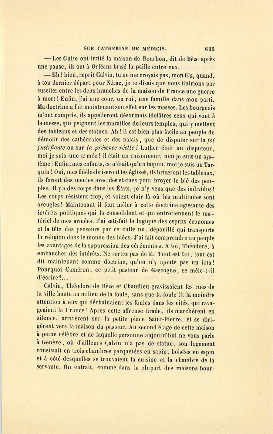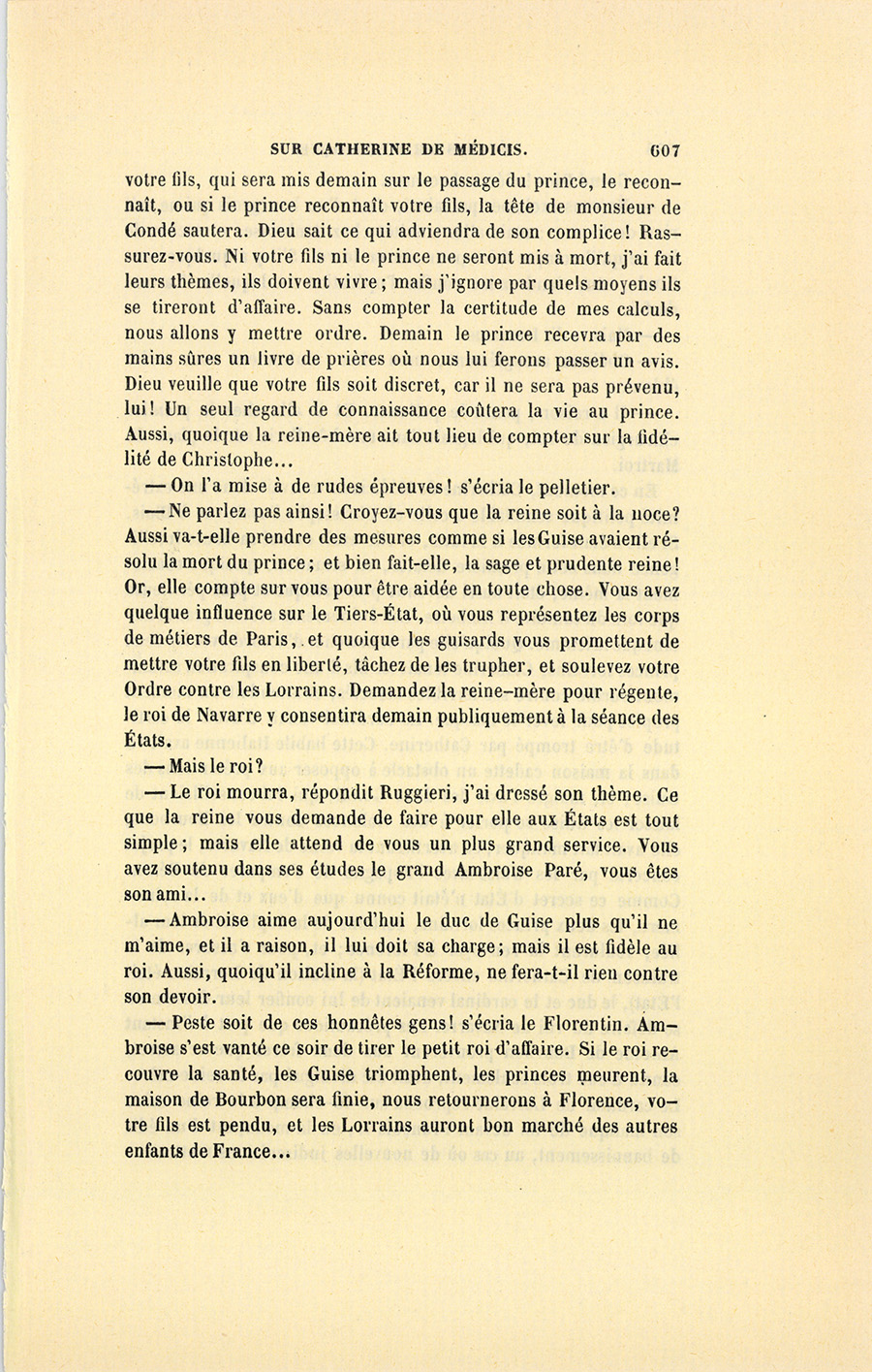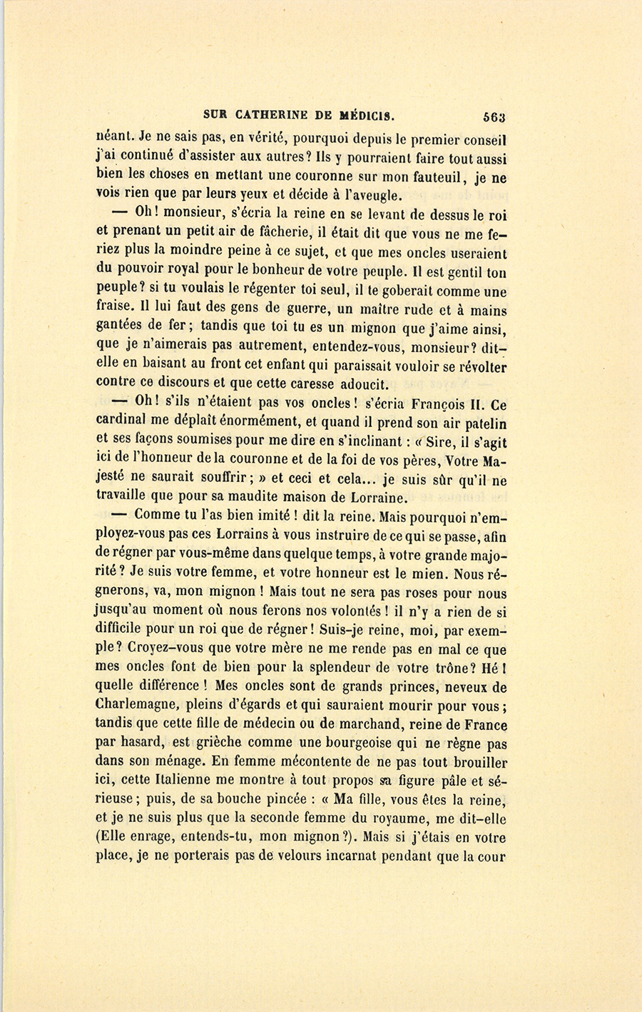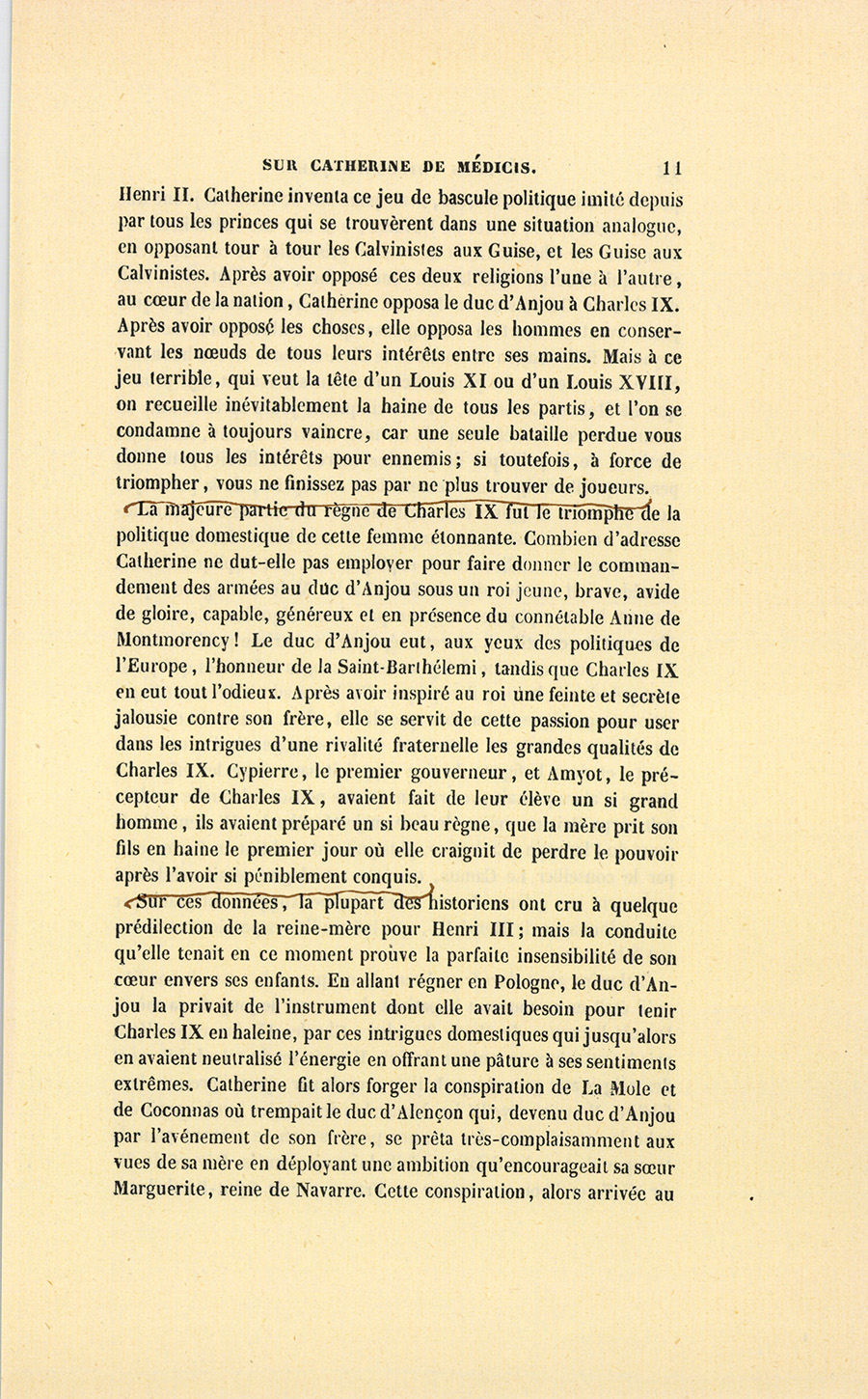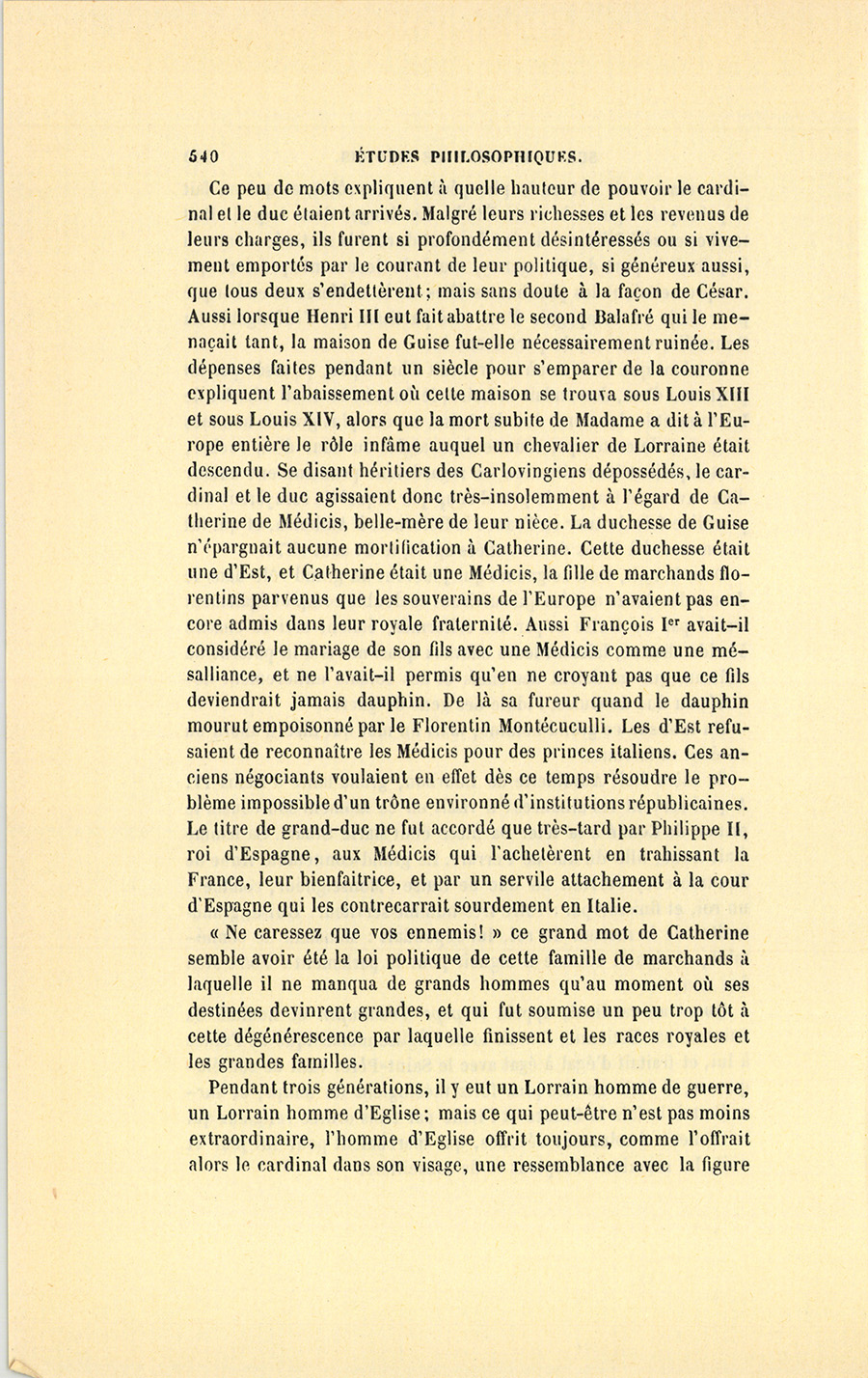 Une autre considération explique la défaveur historique et populaire de Catherine. L’Opposition en France a toujours été protestante, parce qu’elle n’a jamais eu que la négation pour politique ; elle a hérité des théories des Luthériens, des Calvinistes et des Protestants sur les mots terribles de liberté, de tolérance, de progrès et de philosophie. Deux siècles ont été employés par les opposants au pouvoir à établir la douteuse doctrine du libre arbitre. Deux autres siècles ont été employés à développer le premier corollaire du libre arbitre, la liberté de conscience. Notre siècle essaye d’établir le second, la liberté politique.
