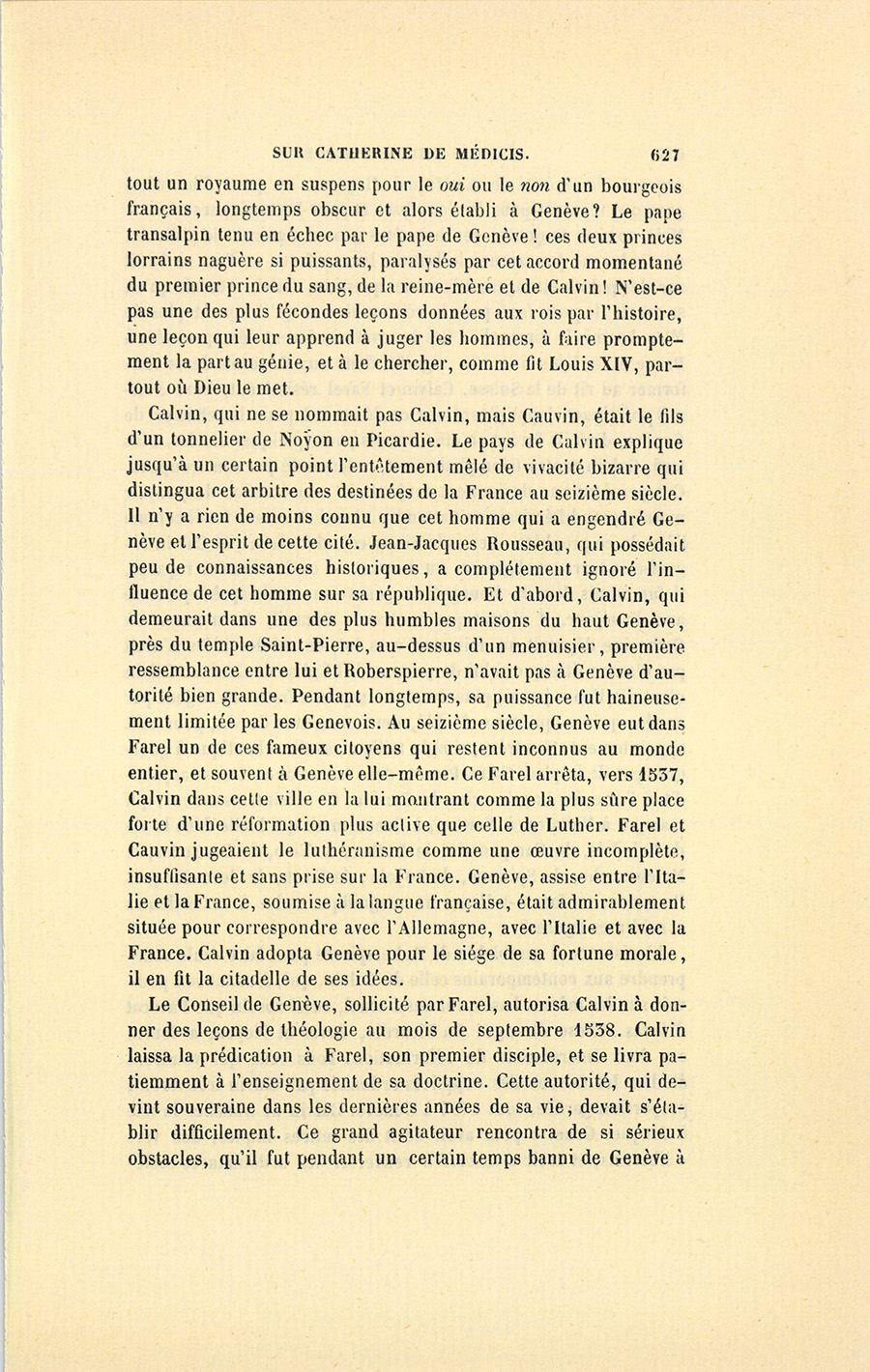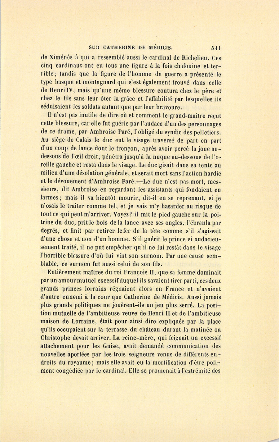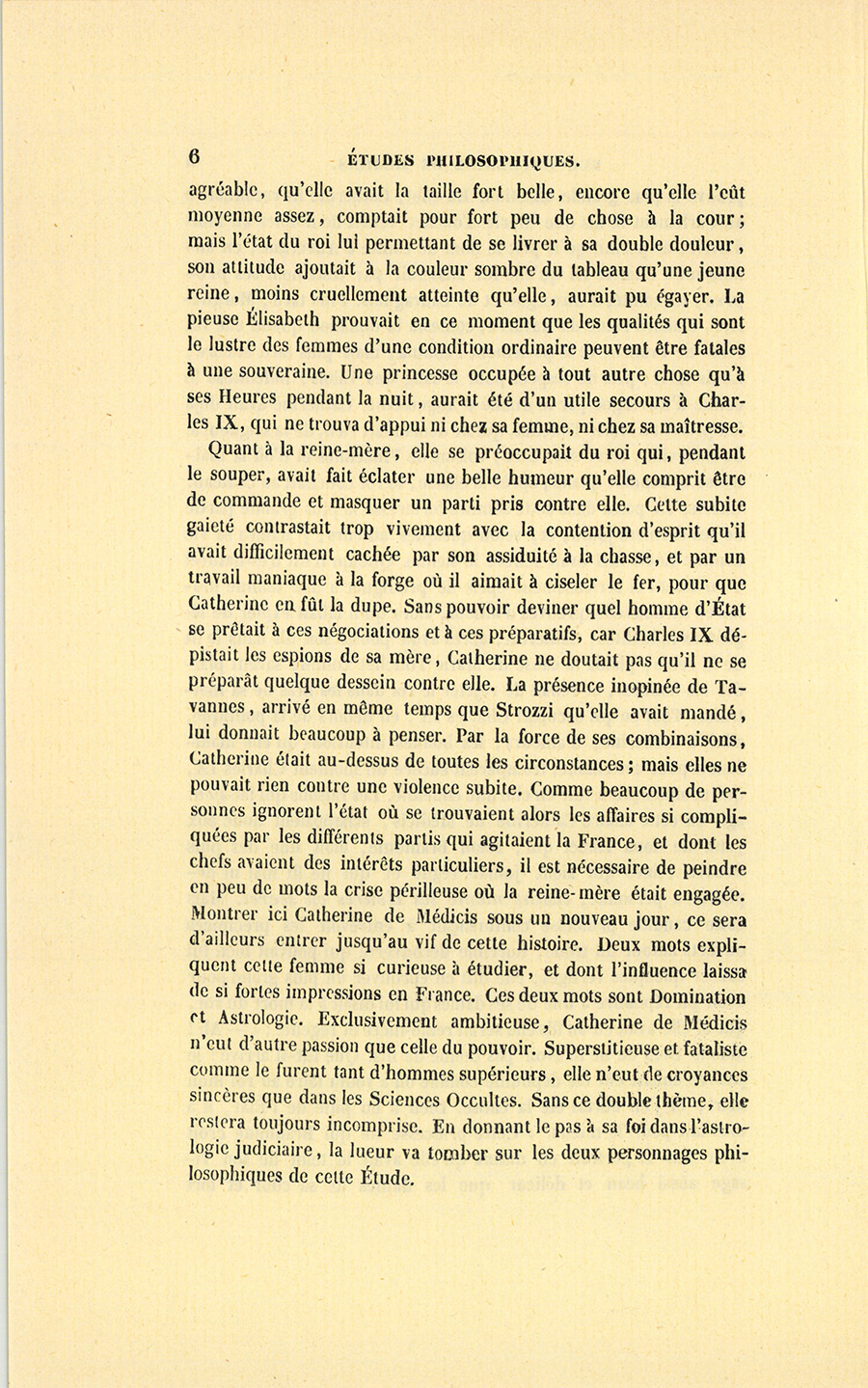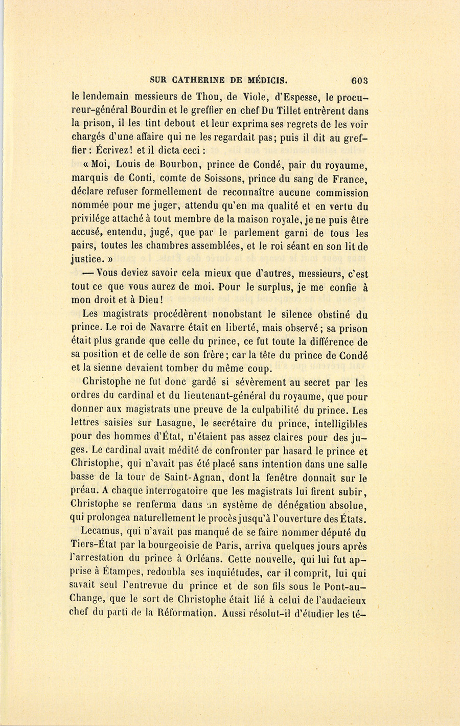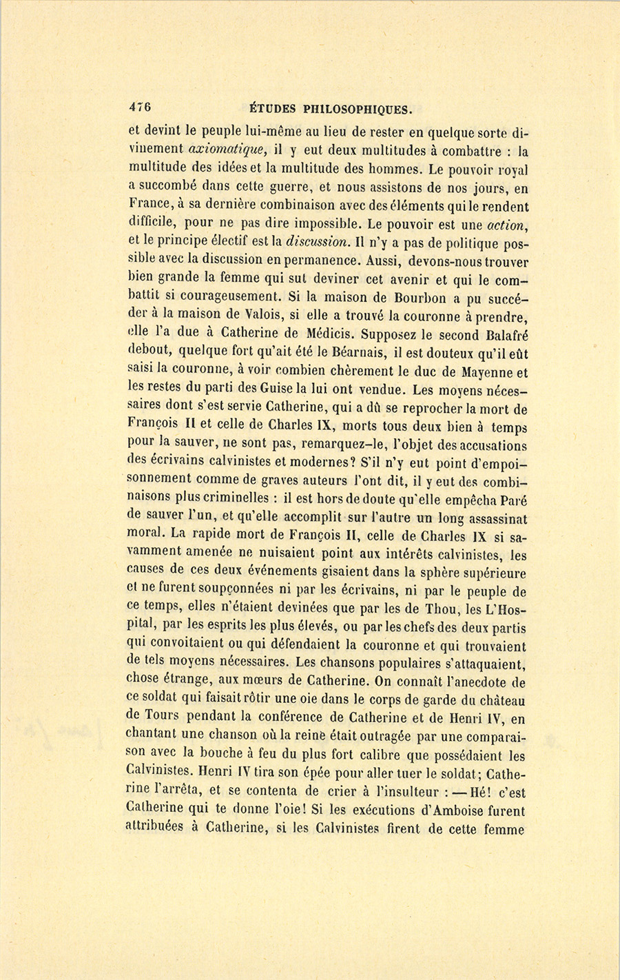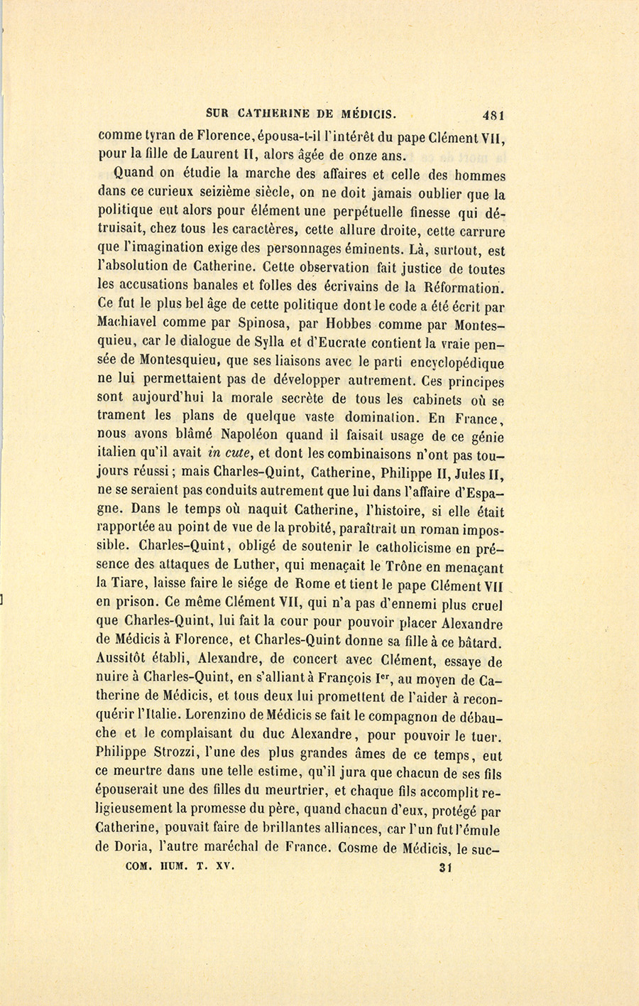 Une autre considération explique la défaveur historique et populaire de Catherine. L’Opposition en France a toujours été protestante, parce qu’elle n’a jamais eu que la négation pour politique ; elle a hérité des théories des Luthériens, des Calvinistes et des Protestants sur les mots terribles de liberté, de tolérance, de progrès et de philosophie. Deux siècles ont été employés par les opposants au pouvoir à établir la douteuse doctrine du libre arbitre. Deux autres siècles ont été employés à développer le premier corollaire du libre arbitre, la liberté de conscience. Notre siècle essaye d’établir le second, la liberté politique.