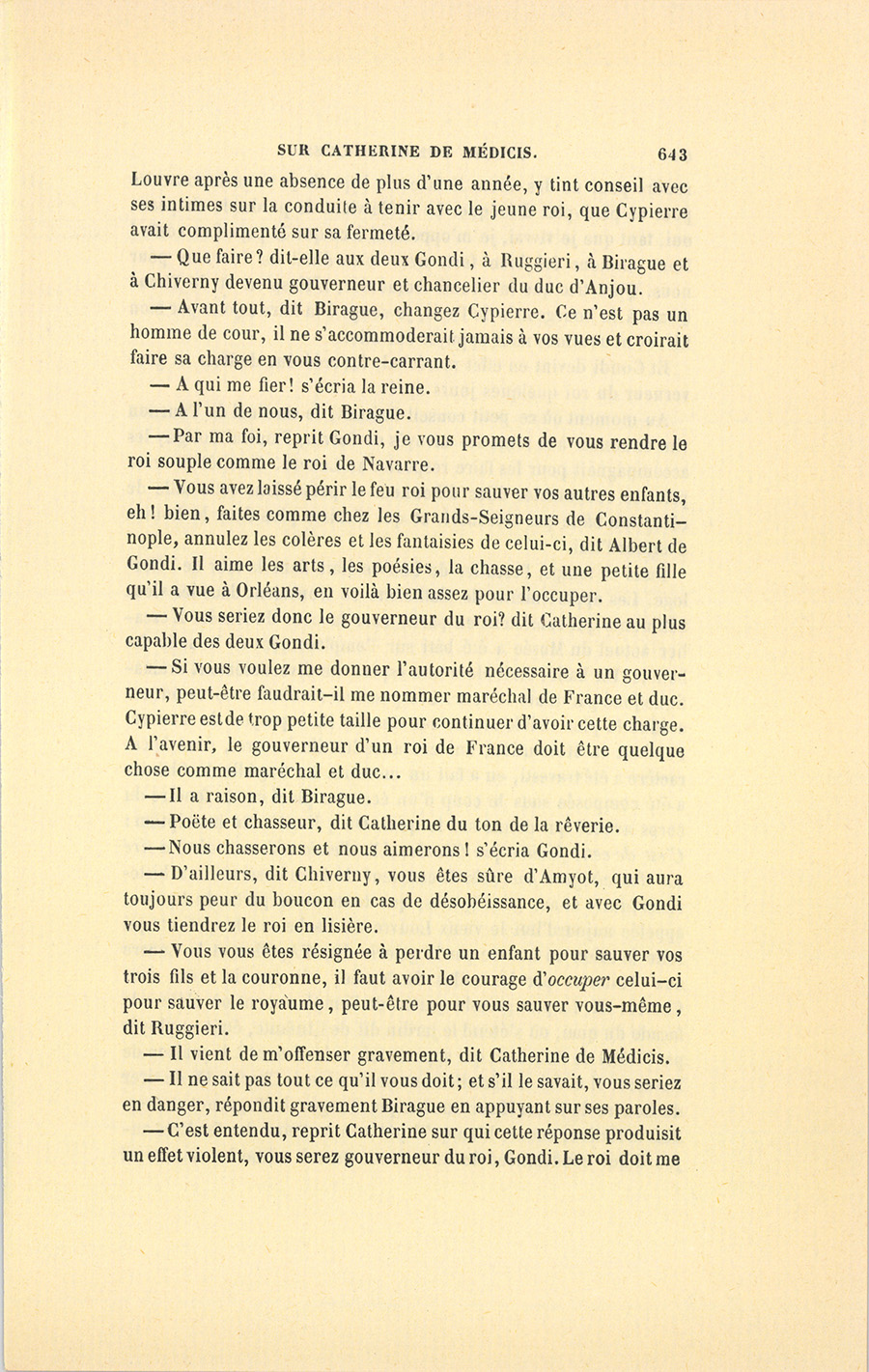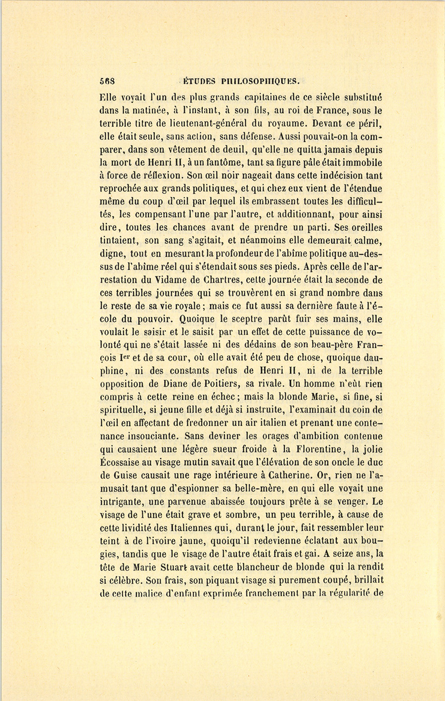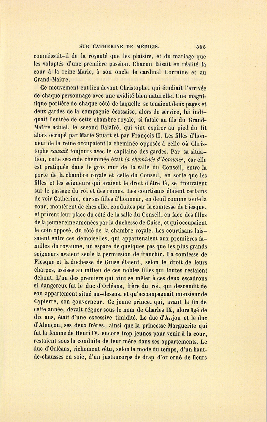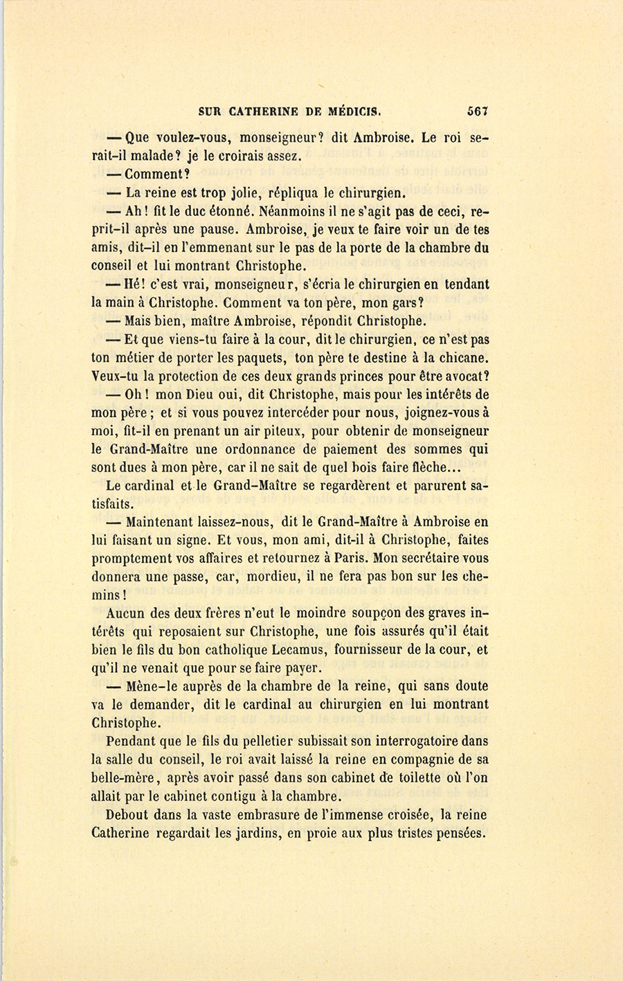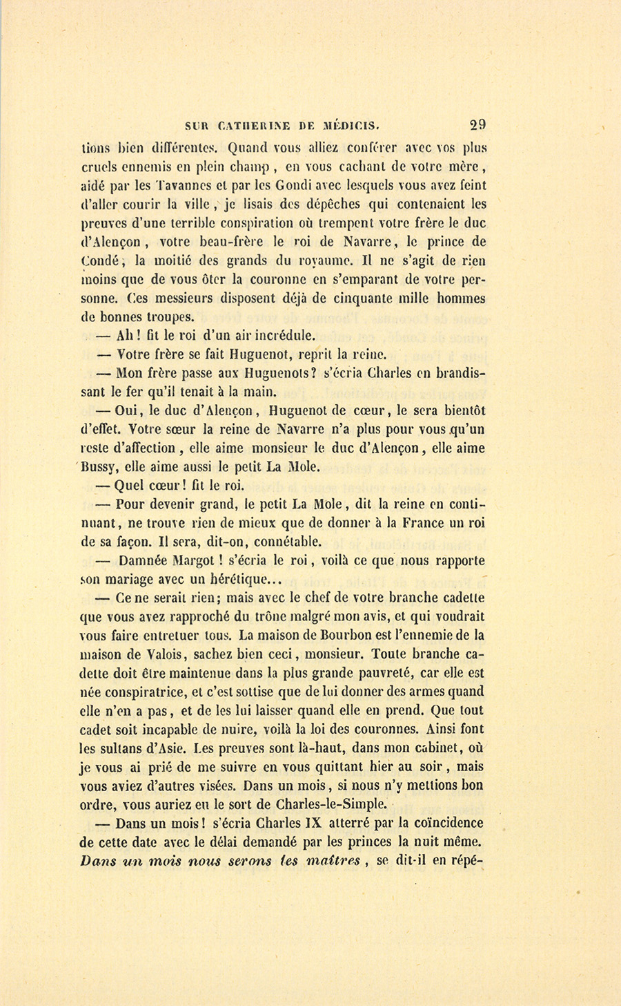 Une autre considération explique la défaveur historique et populaire de Catherine. L’Opposition en France a toujours été protestante, parce qu’elle n’a jamais eu que la négation pour politique ; elle a hérité des théories des Luthériens, des Calvinistes et des Protestants sur les mots terribles de liberté, de tolérance, de progrès et de philosophie. Deux siècles ont été employés par les opposants au pouvoir à établir la douteuse doctrine du libre arbitre. Deux autres siècles ont été employés à développer le premier corollaire du libre arbitre, la liberté de conscience. Notre siècle essaye d’établir le second, la liberté politique.