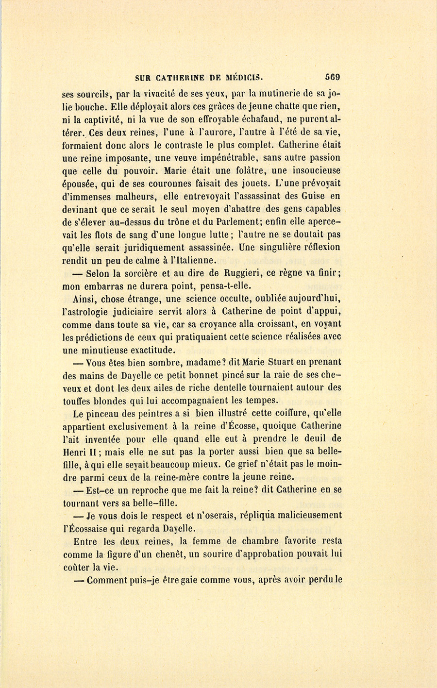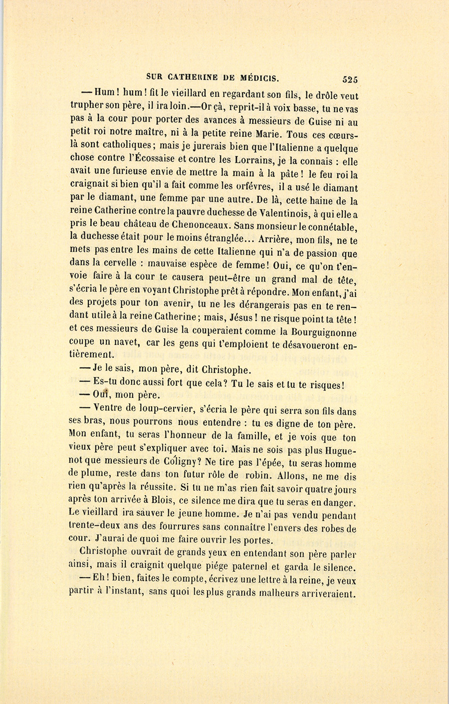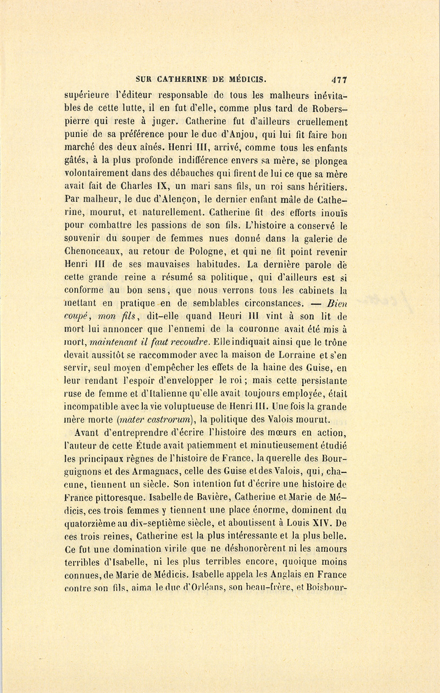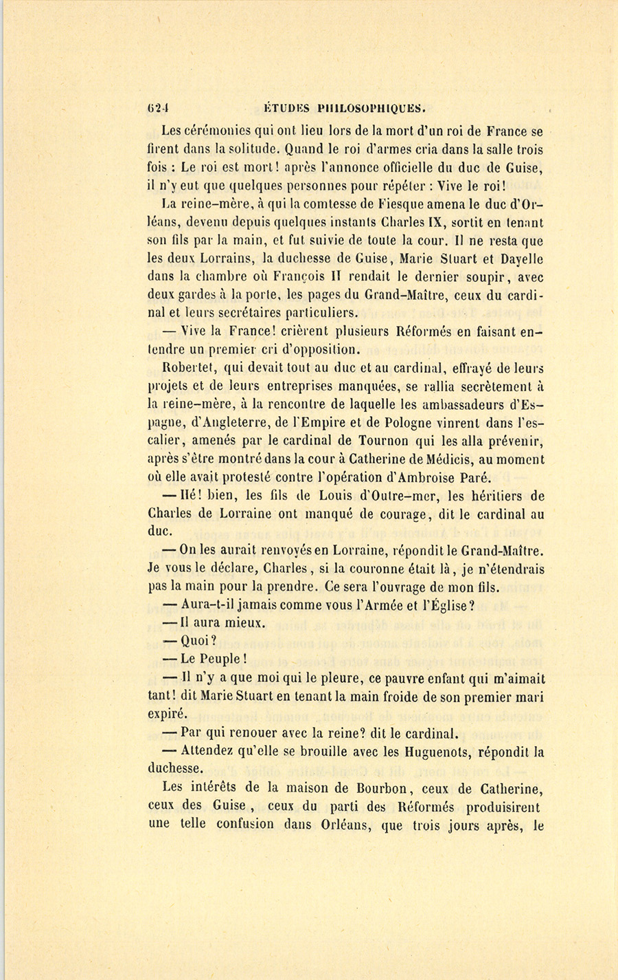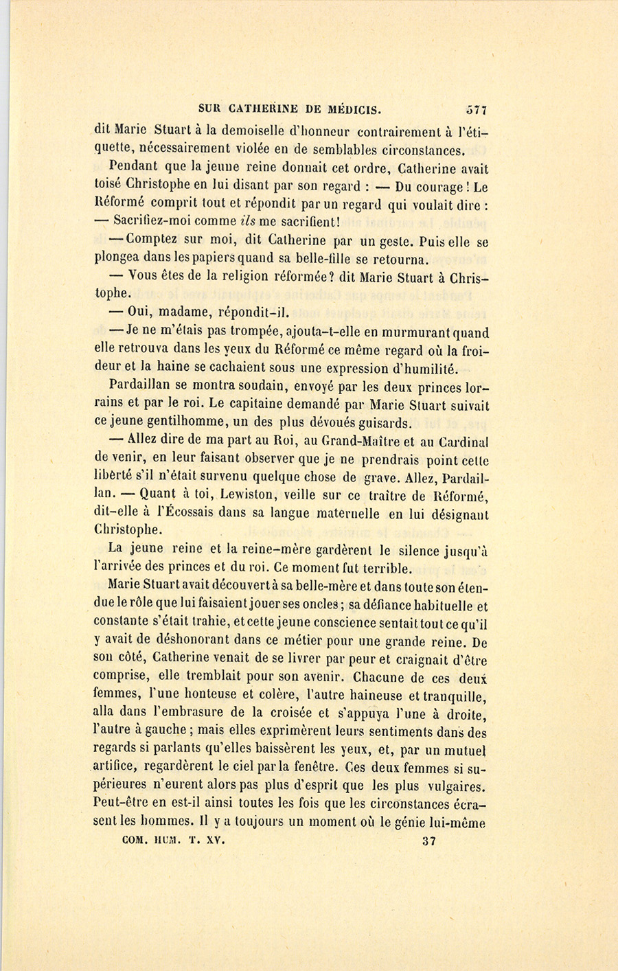 Une autre considération explique la défaveur historique et populaire de Catherine. L’Opposition en France a toujours été protestante, parce qu’elle n’a jamais eu que la négation pour politique ; elle a hérité des théories des Luthériens, des Calvinistes et des Protestants sur les mots terribles de liberté, de tolérance, de progrès et de philosophie. Deux siècles ont été employés par les opposants au pouvoir à établir la douteuse doctrine du libre arbitre. Deux autres siècles ont été employés à développer le premier corollaire du libre arbitre, la liberté de conscience. Notre siècle essaye d’établir le second, la liberté politique.