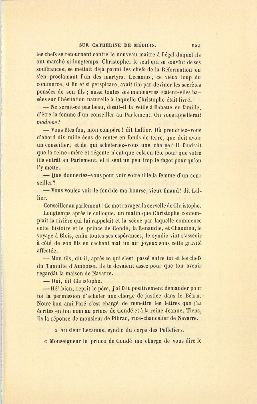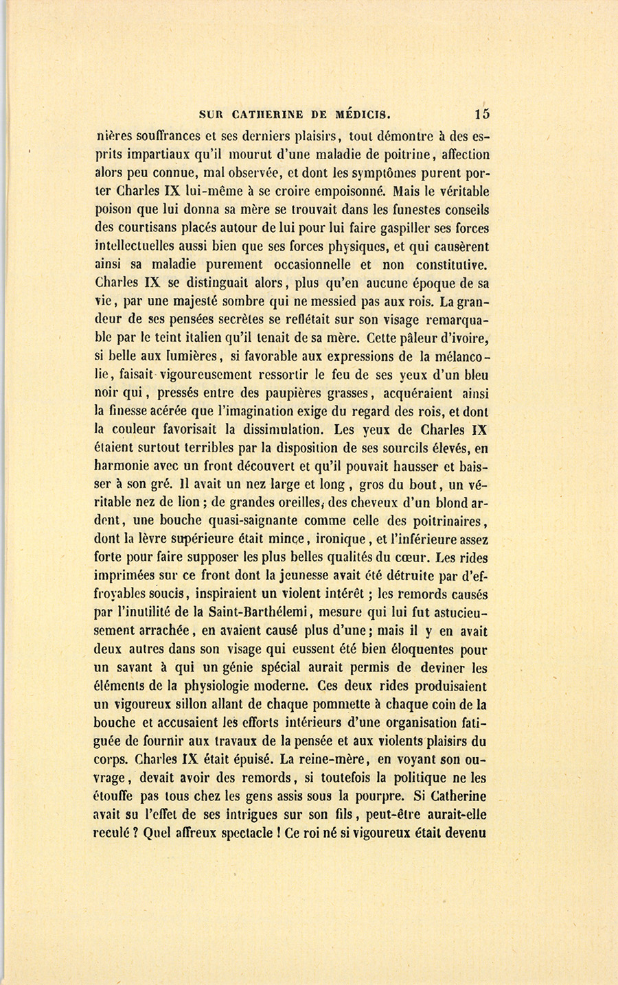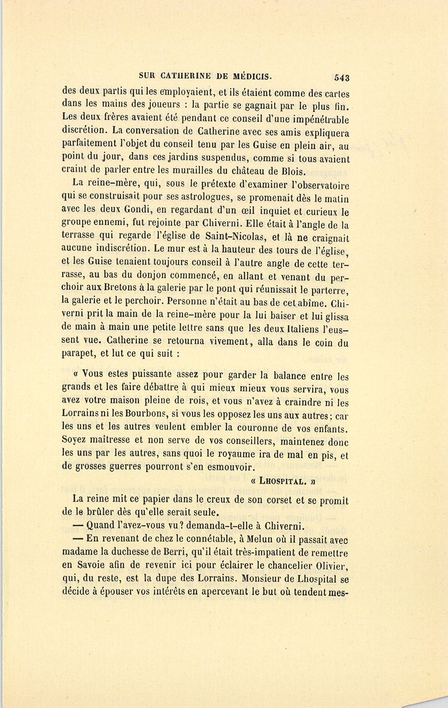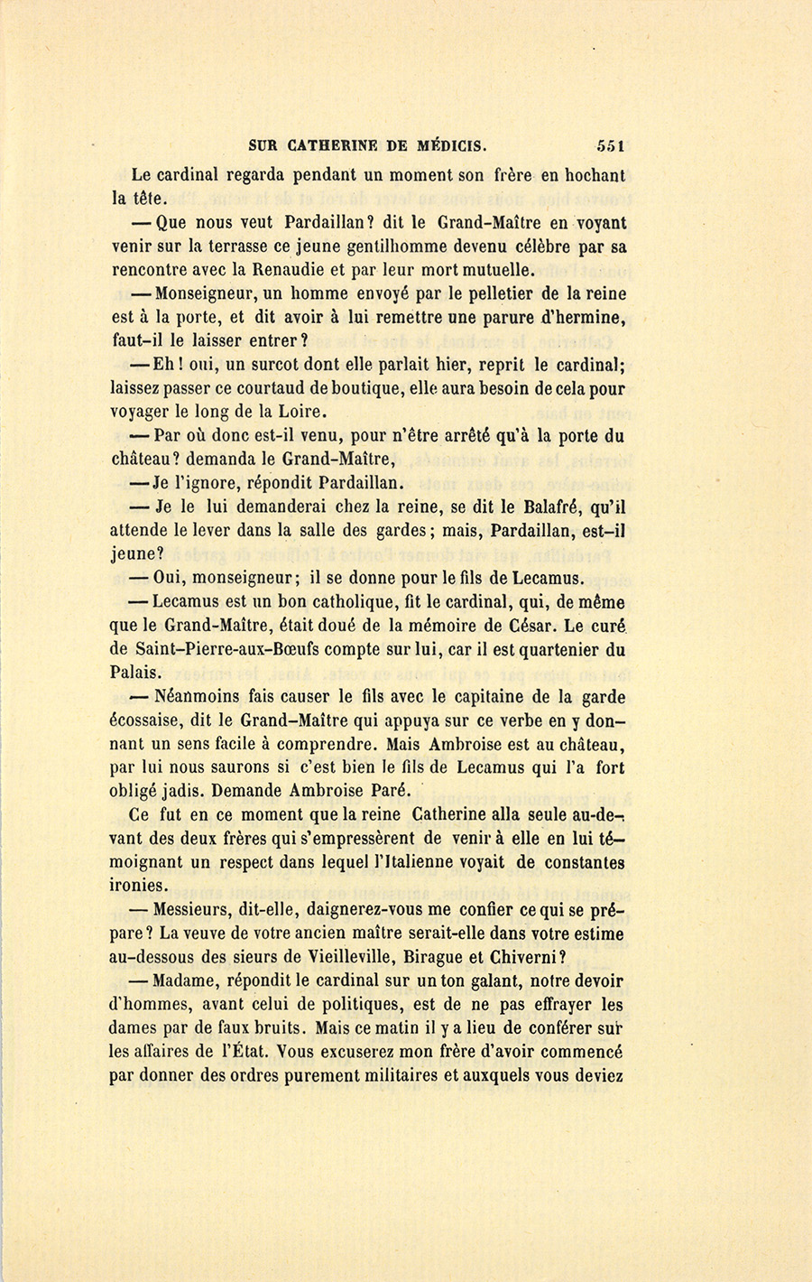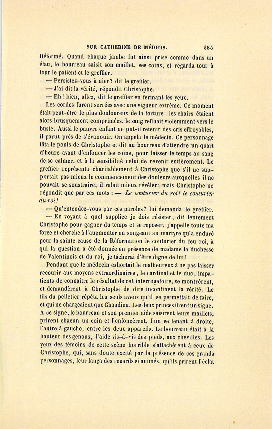 Une autre considération explique la défaveur historique et populaire de Catherine. L’Opposition en France a toujours été protestante, parce qu’elle n’a jamais eu que la négation pour politique ; elle a hérité des théories des Luthériens, des Calvinistes et des Protestants sur les mots terribles de liberté, de tolérance, de progrès et de philosophie. Deux siècles ont été employés par les opposants au pouvoir à établir la douteuse doctrine du libre arbitre. Deux autres siècles ont été employés à développer le premier corollaire du libre arbitre, la liberté de conscience. Notre siècle essaye d’établir le second, la liberté politique.