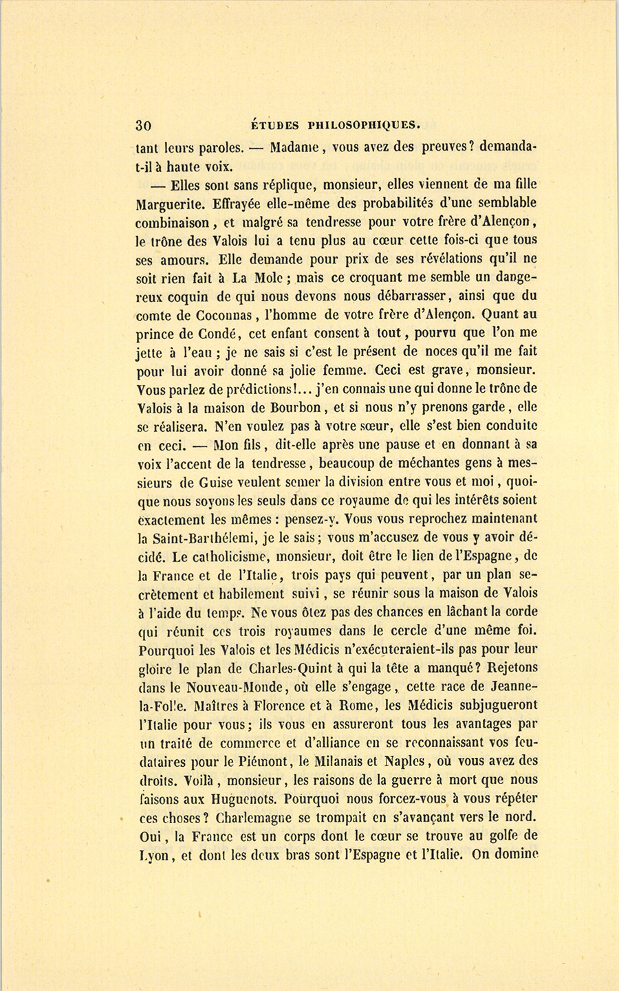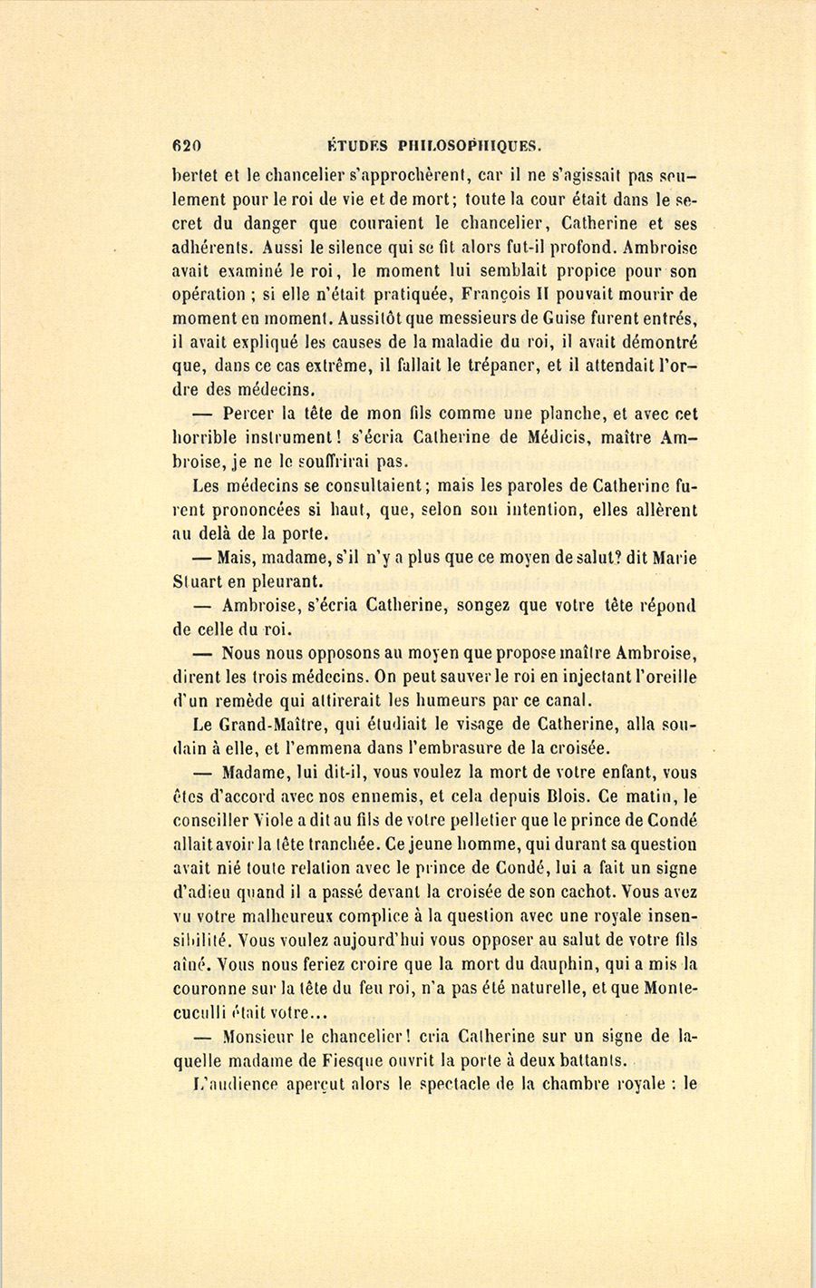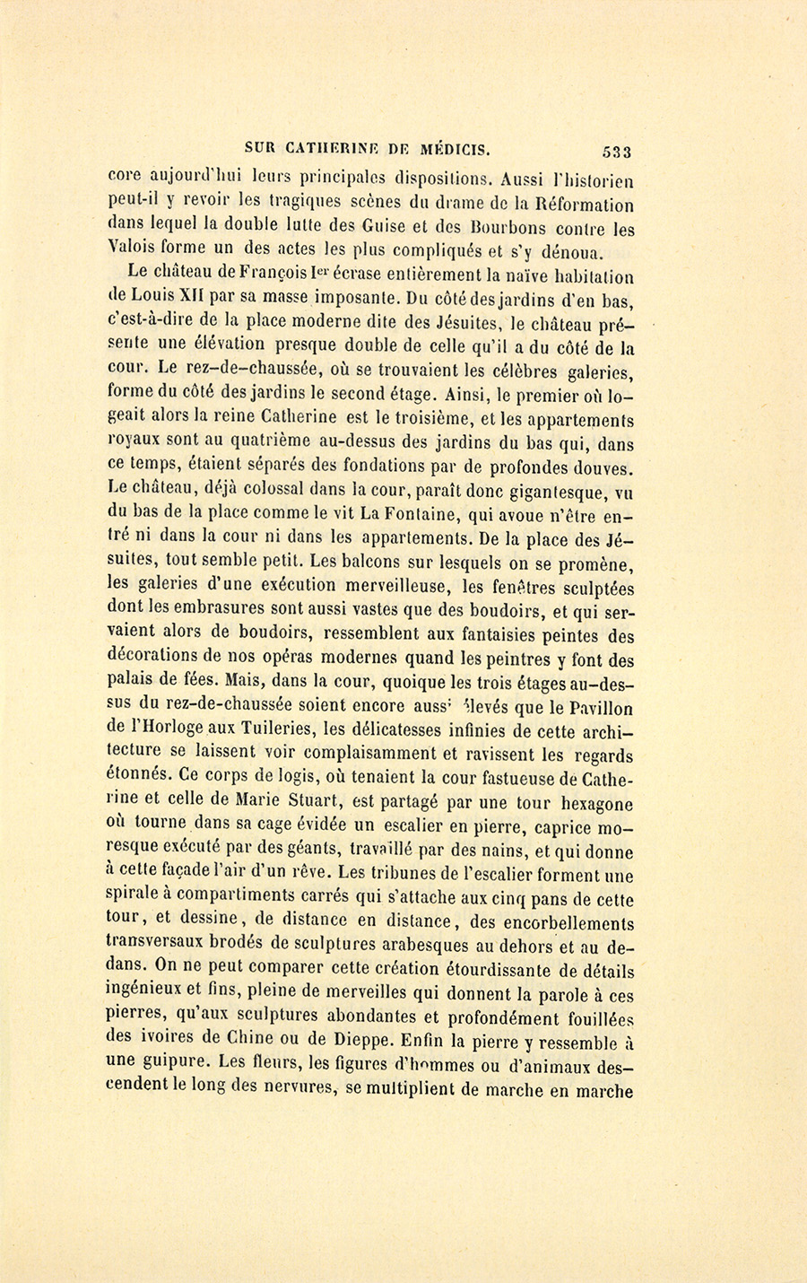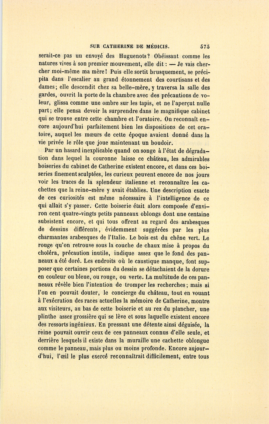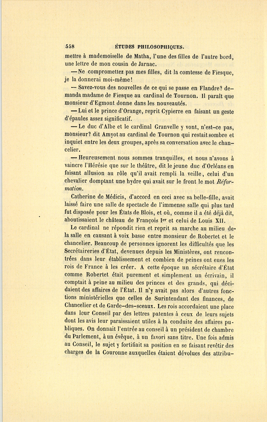 Une autre considération explique la défaveur historique et populaire de Catherine. L’Opposition en France a toujours été protestante, parce qu’elle n’a jamais eu que la négation pour politique ; elle a hérité des théories des Luthériens, des Calvinistes et des Protestants sur les mots terribles de liberté, de tolérance, de progrès et de philosophie. Deux siècles ont été employés par les opposants au pouvoir à établir la douteuse doctrine du libre arbitre. Deux autres siècles ont été employés à développer le premier corollaire du libre arbitre, la liberté de conscience. Notre siècle essaye d’établir le second, la liberté politique.