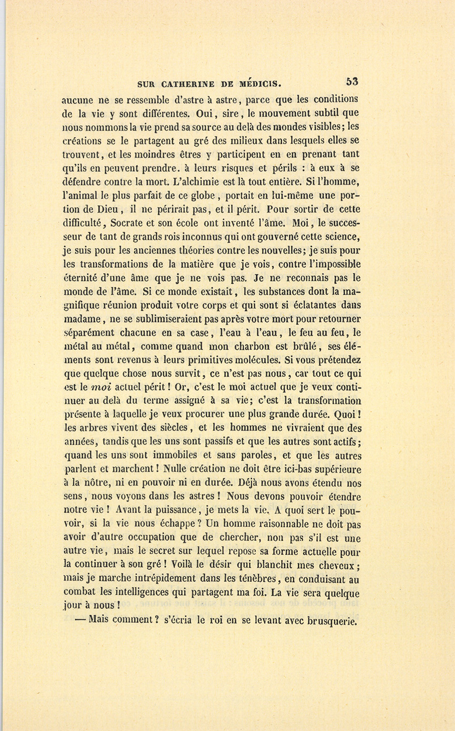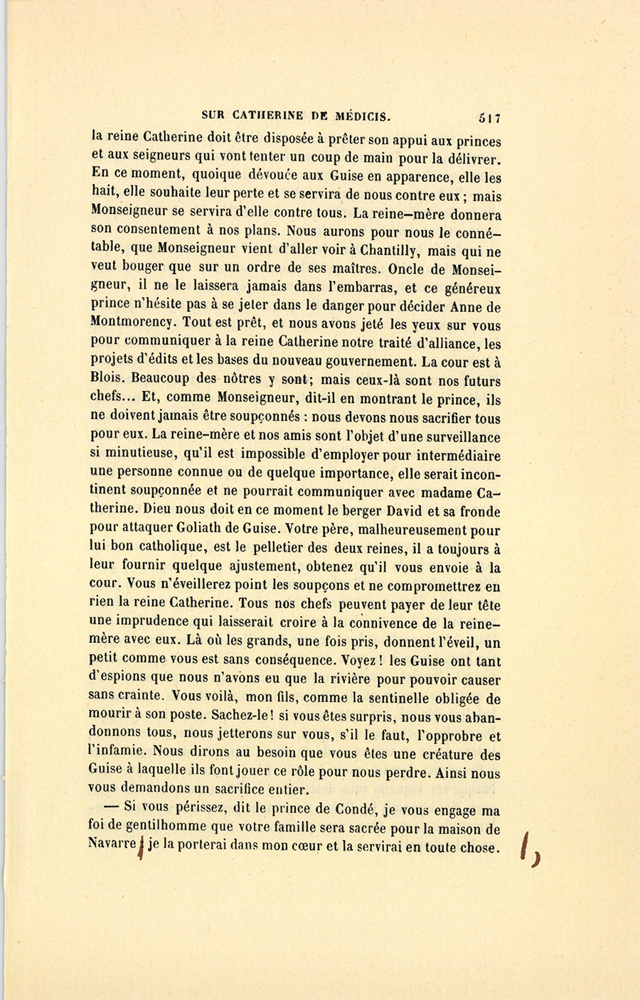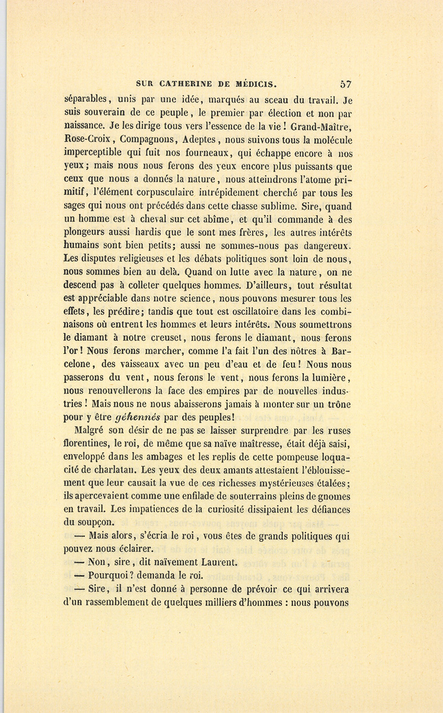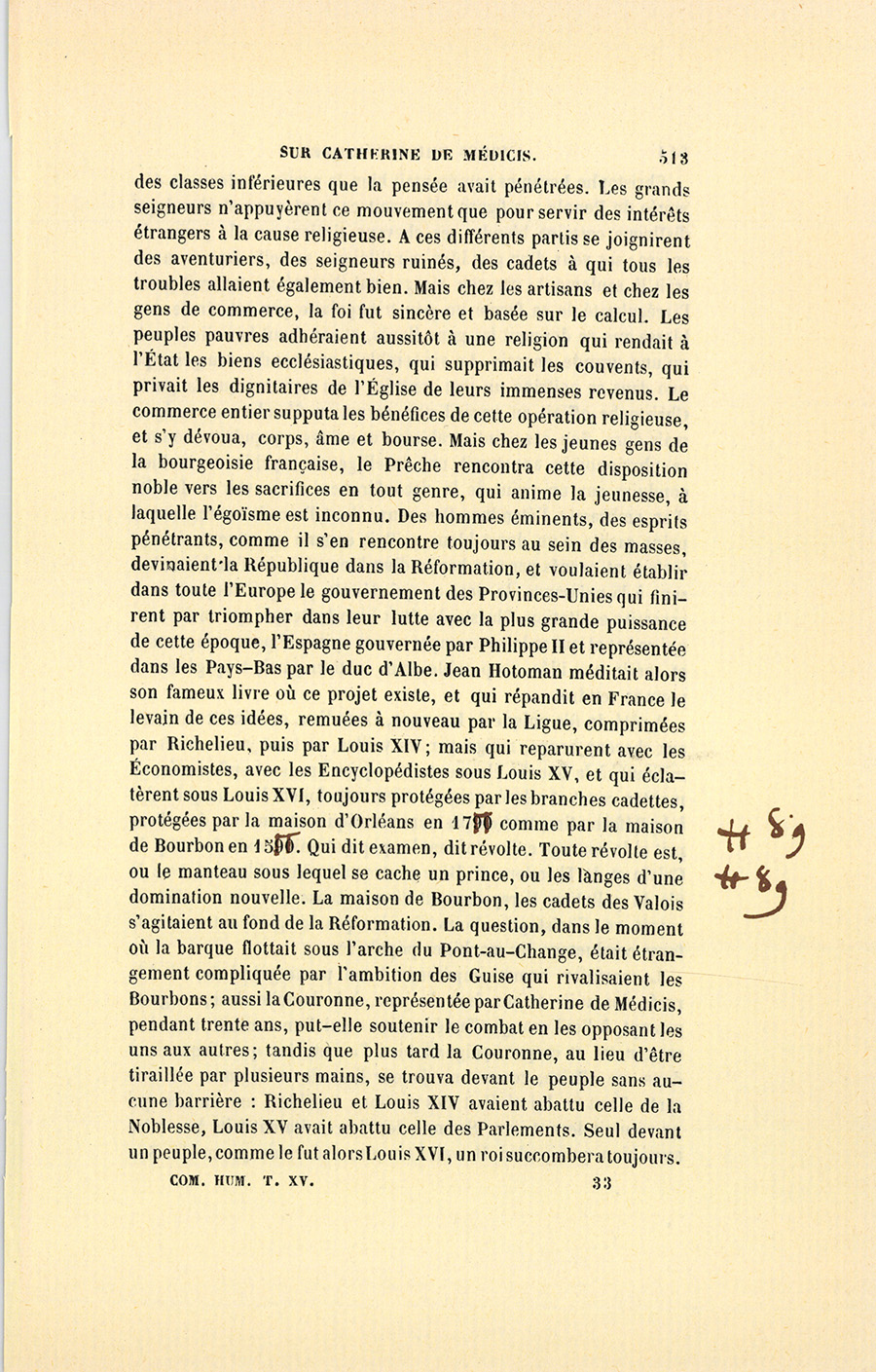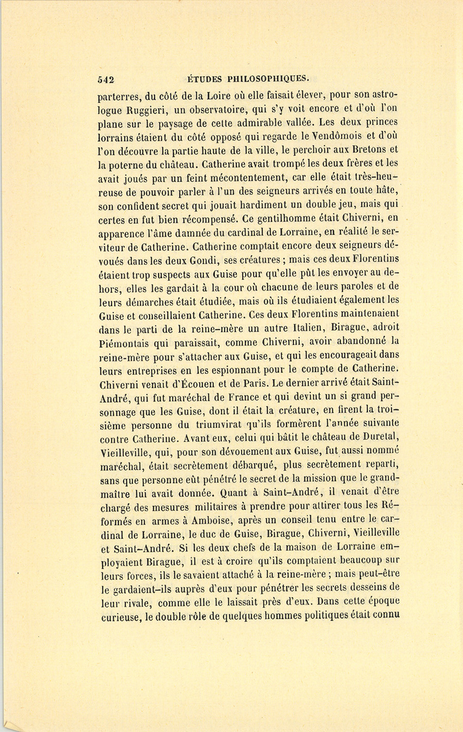 Une autre considération explique la défaveur historique et populaire de Catherine. L’Opposition en France a toujours été protestante, parce qu’elle n’a jamais eu que la négation pour politique ; elle a hérité des théories des Luthériens, des Calvinistes et des Protestants sur les mots terribles de liberté, de tolérance, de progrès et de philosophie. Deux siècles ont été employés par les opposants au pouvoir à établir la douteuse doctrine du libre arbitre. Deux autres siècles ont été employés à développer le premier corollaire du libre arbitre, la liberté de conscience. Notre siècle essaye d’établir le second, la liberté politique.