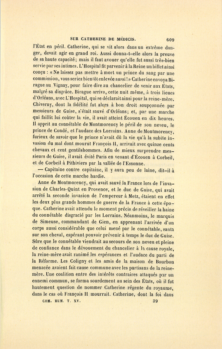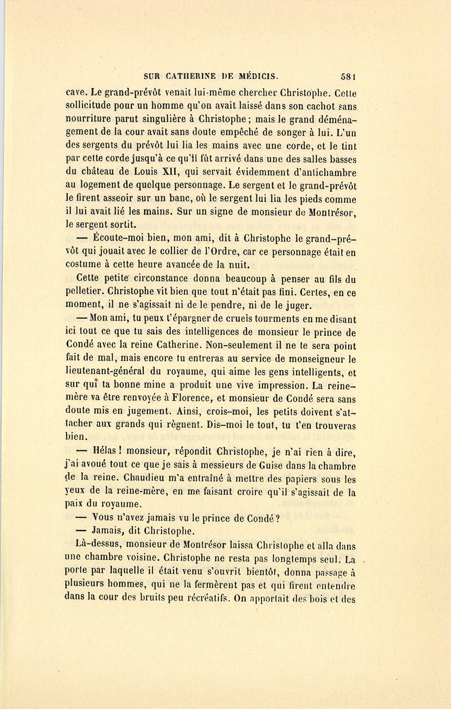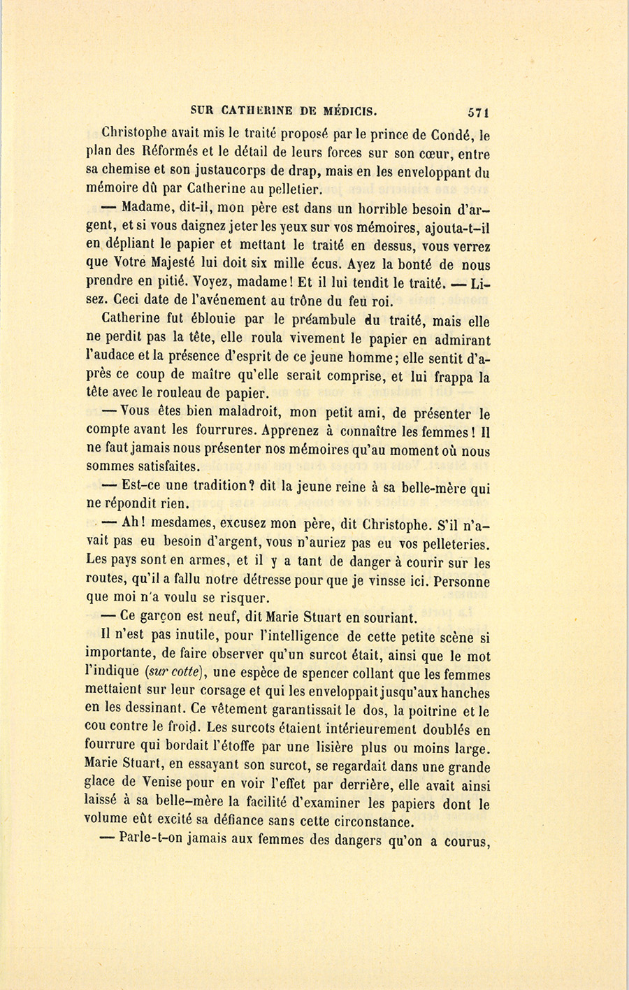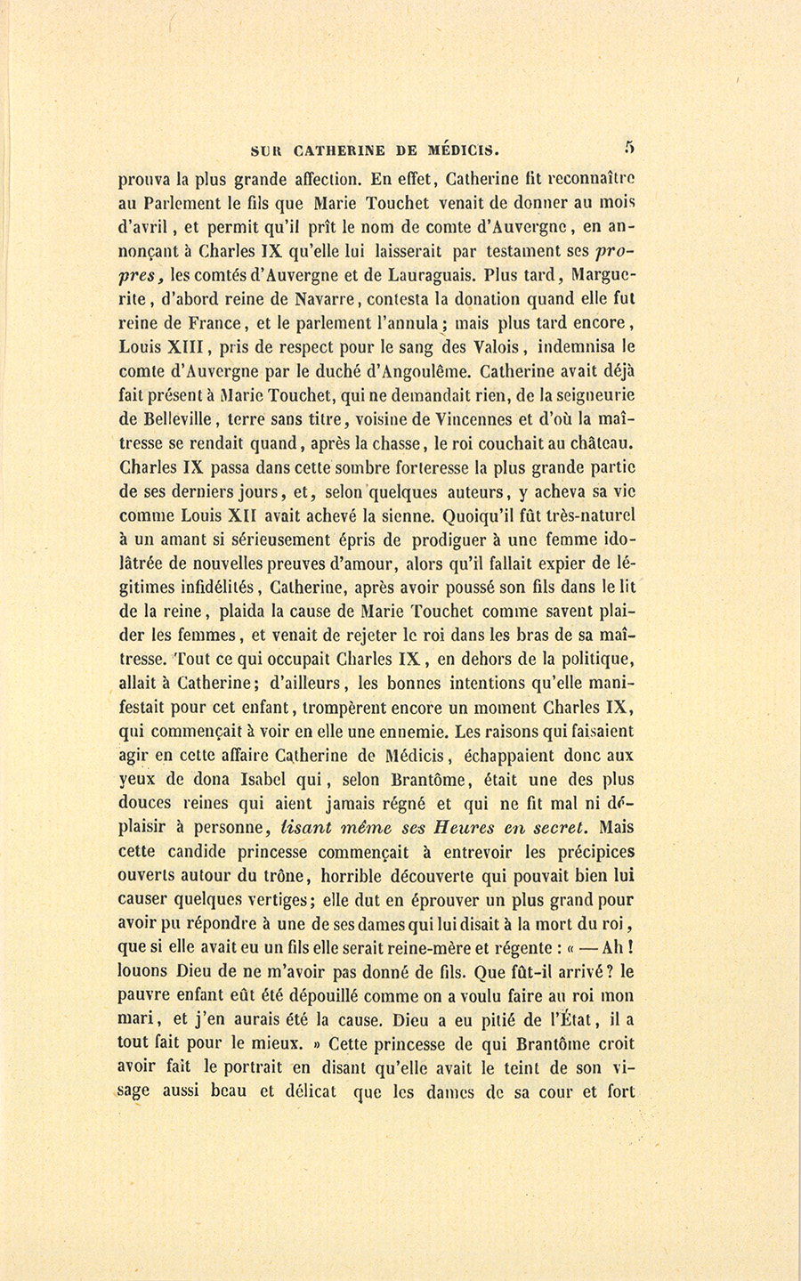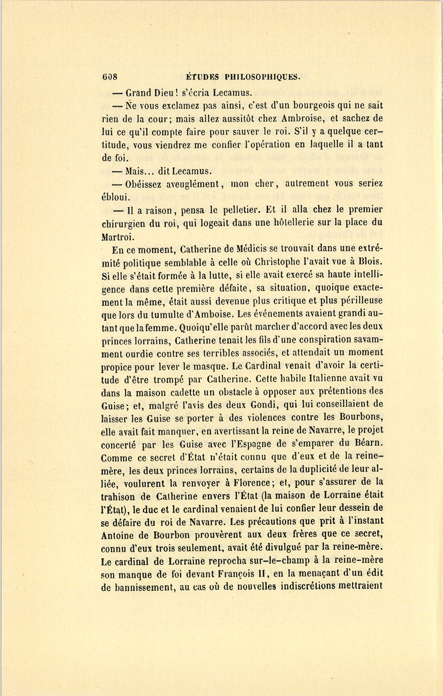 Une autre considération explique la défaveur historique et populaire de Catherine. L’Opposition en France a toujours été protestante, parce qu’elle n’a jamais eu que la négation pour politique ; elle a hérité des théories des Luthériens, des Calvinistes et des Protestants sur les mots terribles de liberté, de tolérance, de progrès et de philosophie. Deux siècles ont été employés par les opposants au pouvoir à établir la douteuse doctrine du libre arbitre. Deux autres siècles ont été employés à développer le premier corollaire du libre arbitre, la liberté de conscience. Notre siècle essaye d’établir le second, la liberté politique.