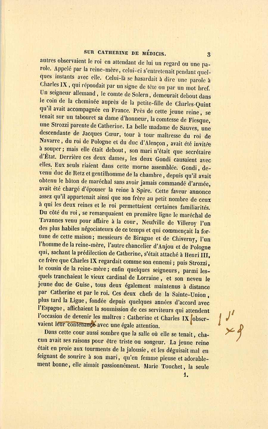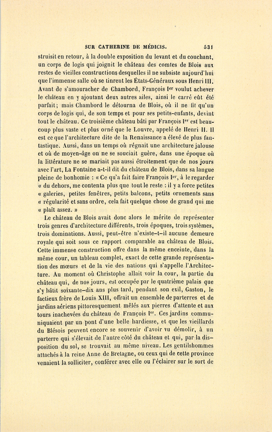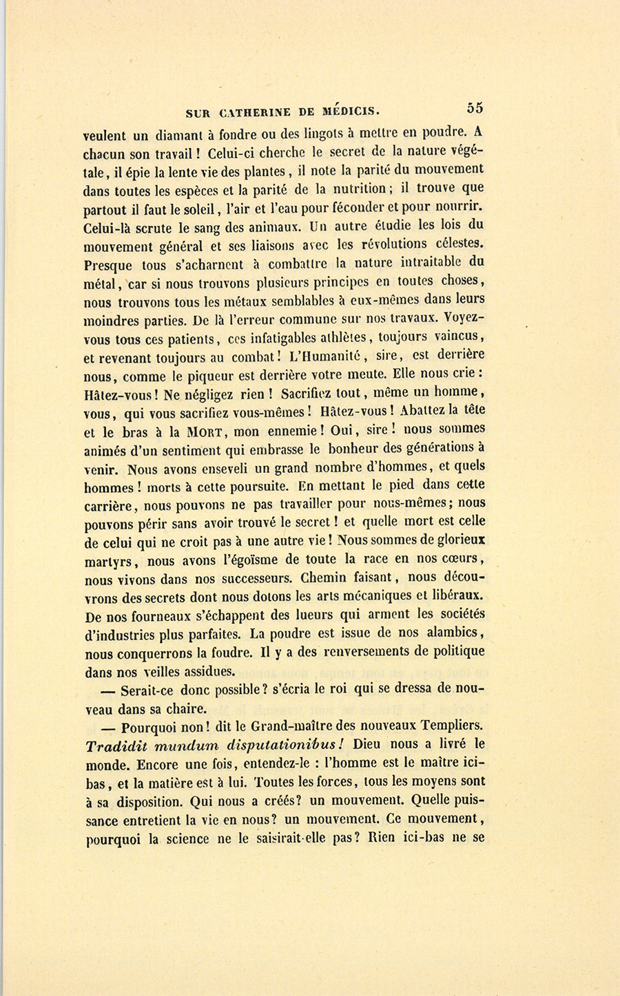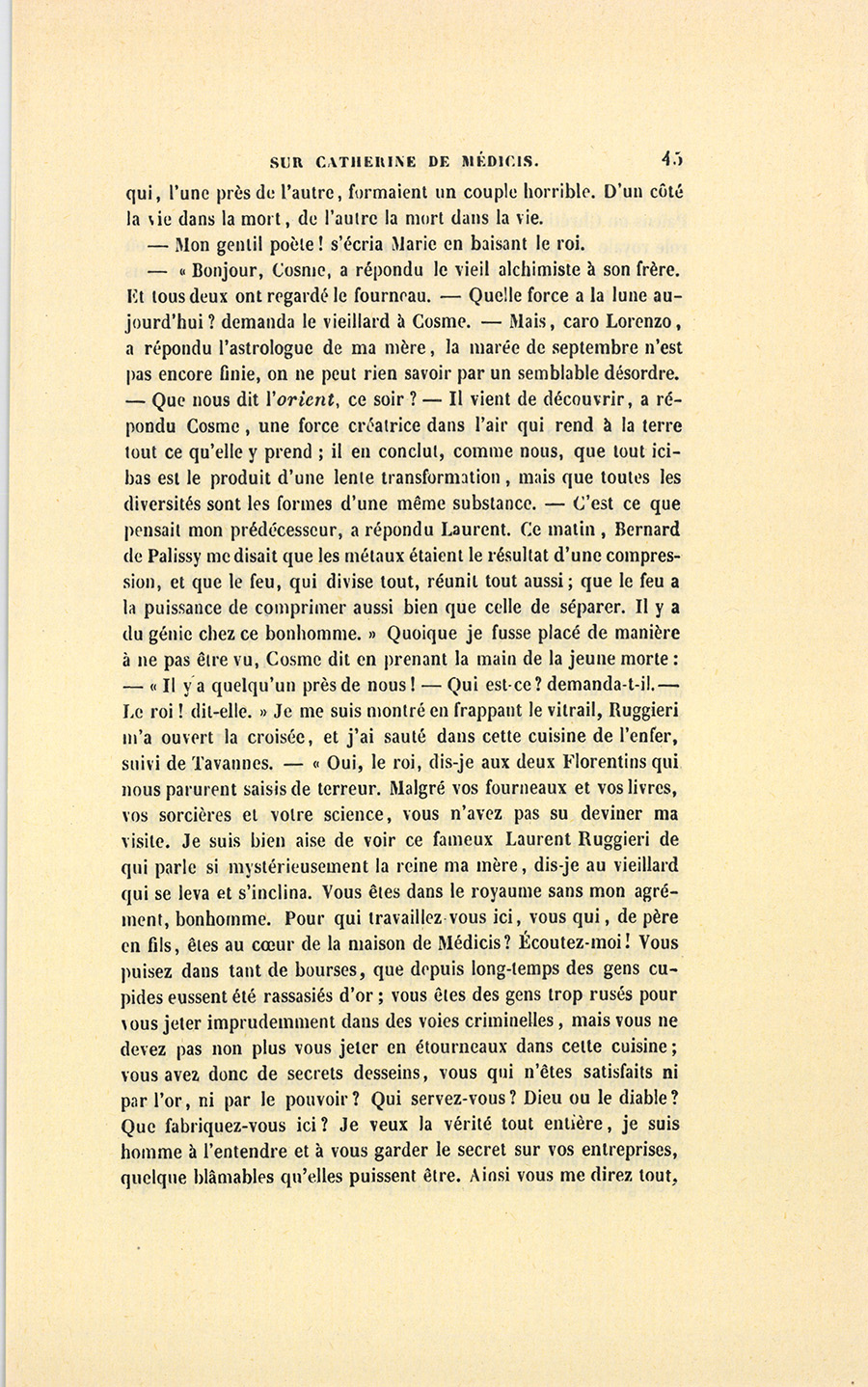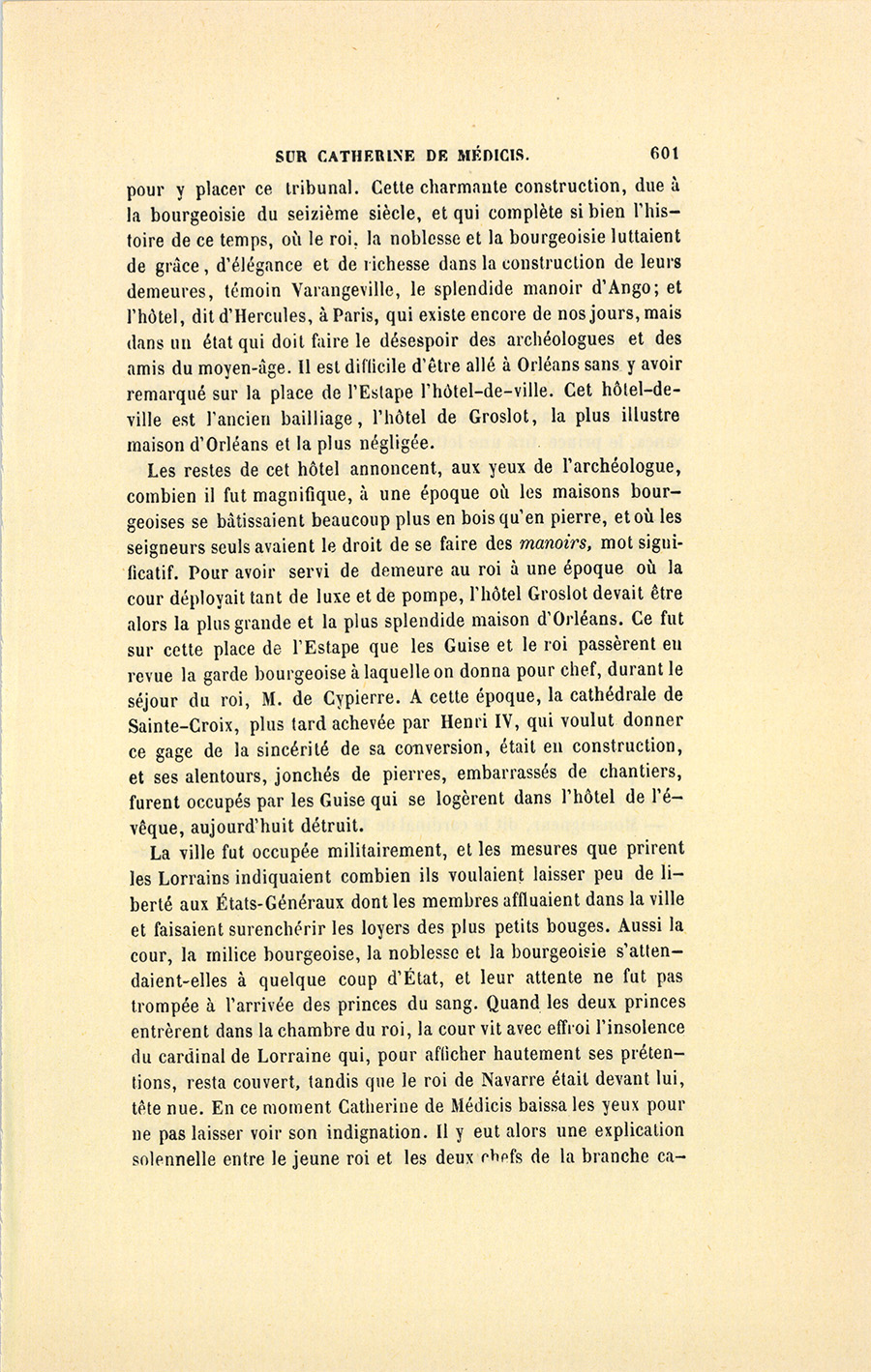 Une autre considération explique la défaveur historique et populaire de Catherine. L’Opposition en France a toujours été protestante, parce qu’elle n’a jamais eu que la négation pour politique ; elle a hérité des théories des Luthériens, des Calvinistes et des Protestants sur les mots terribles de liberté, de tolérance, de progrès et de philosophie. Deux siècles ont été employés par les opposants au pouvoir à établir la douteuse doctrine du libre arbitre. Deux autres siècles ont été employés à développer le premier corollaire du libre arbitre, la liberté de conscience. Notre siècle essaye d’établir le second, la liberté politique.