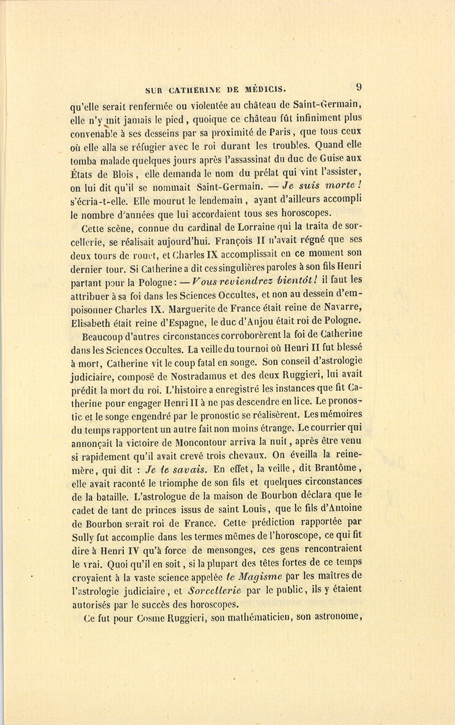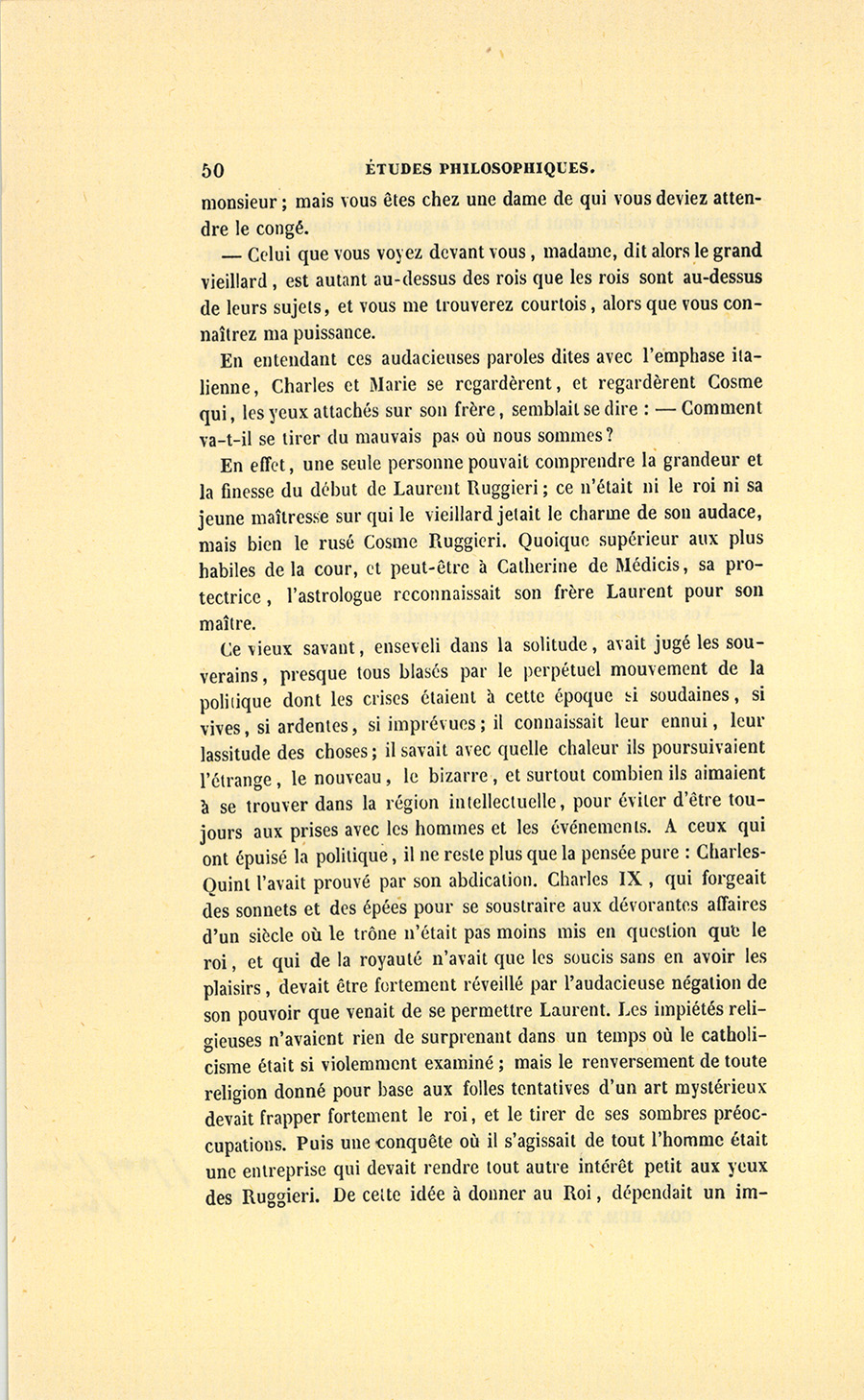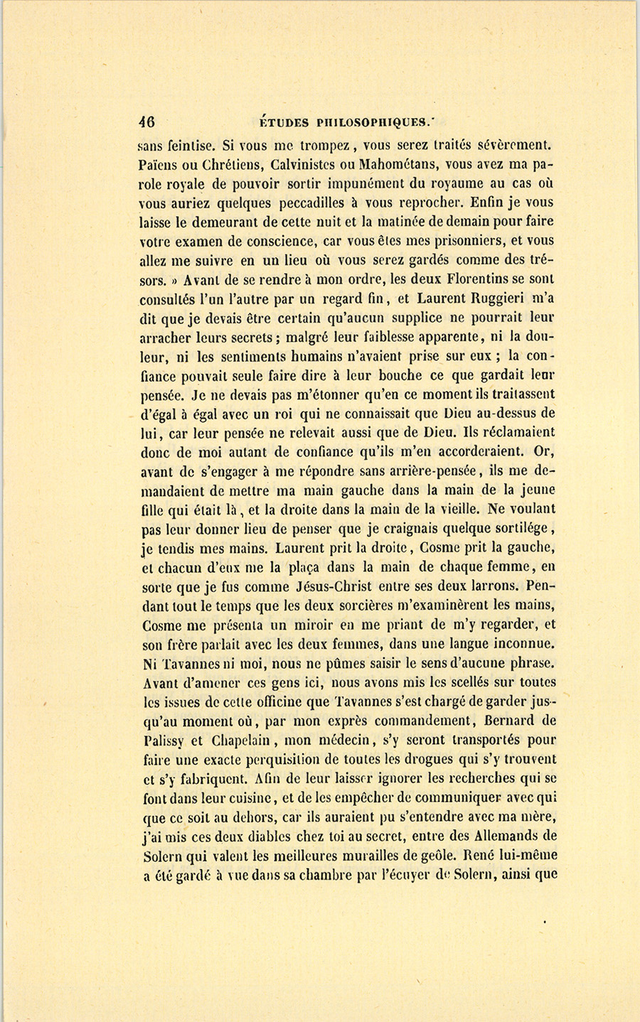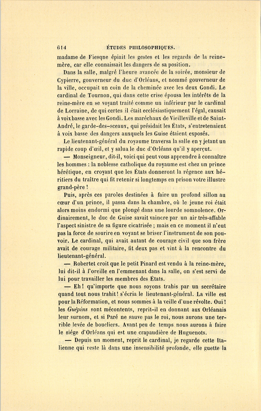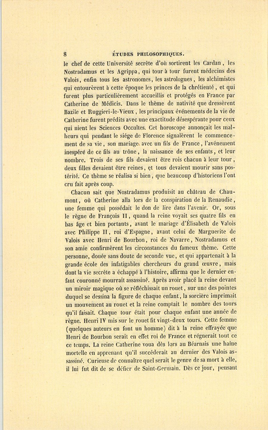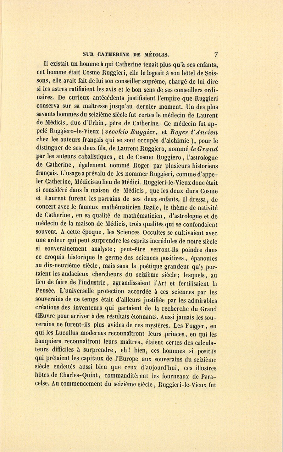 Une autre considération explique la défaveur historique et populaire de Catherine. L’Opposition en France a toujours été protestante, parce qu’elle n’a jamais eu que la négation pour politique ; elle a hérité des théories des Luthériens, des Calvinistes et des Protestants sur les mots terribles de liberté, de tolérance, de progrès et de philosophie. Deux siècles ont été employés par les opposants au pouvoir à établir la douteuse doctrine du libre arbitre. Deux autres siècles ont été employés à développer le premier corollaire du libre arbitre, la liberté de conscience. Notre siècle essaye d’établir le second, la liberté politique.
