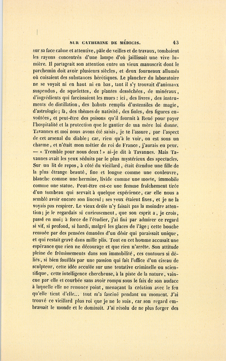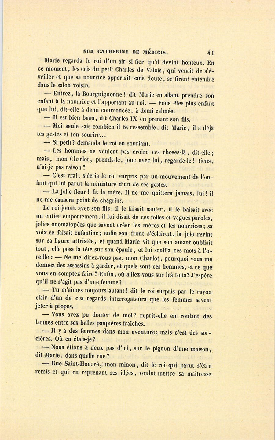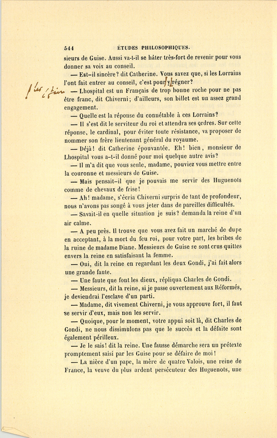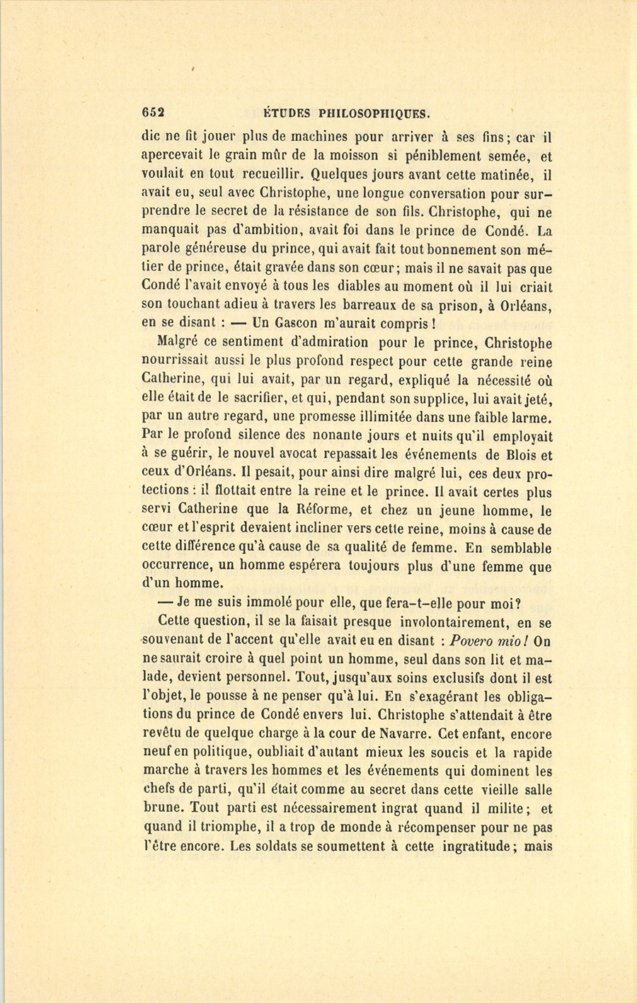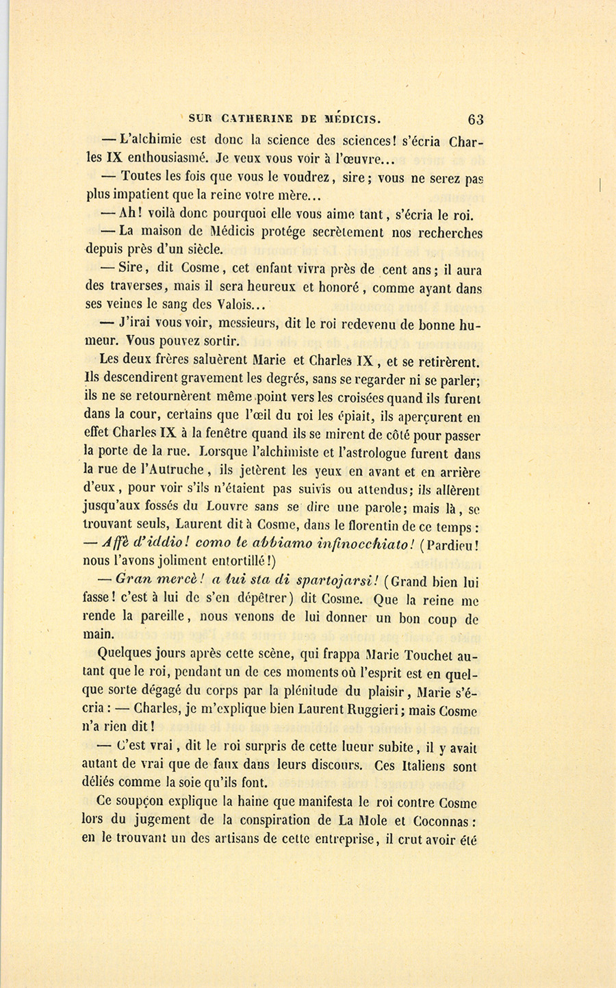 Une autre considération explique la défaveur historique et populaire de Catherine. L’Opposition en France a toujours été protestante, parce qu’elle n’a jamais eu que la négation pour politique ; elle a hérité des théories des Luthériens, des Calvinistes et des Protestants sur les mots terribles de liberté, de tolérance, de progrès et de philosophie. Deux siècles ont été employés par les opposants au pouvoir à établir la douteuse doctrine du libre arbitre. Deux autres siècles ont été employés à développer le premier corollaire du libre arbitre, la liberté de conscience. Notre siècle essaye d’établir le second, la liberté politique.