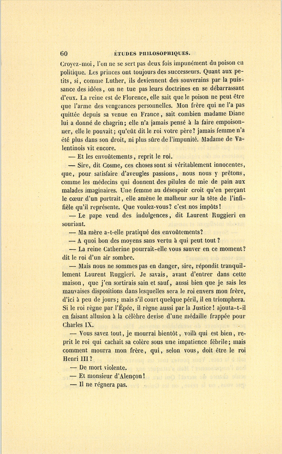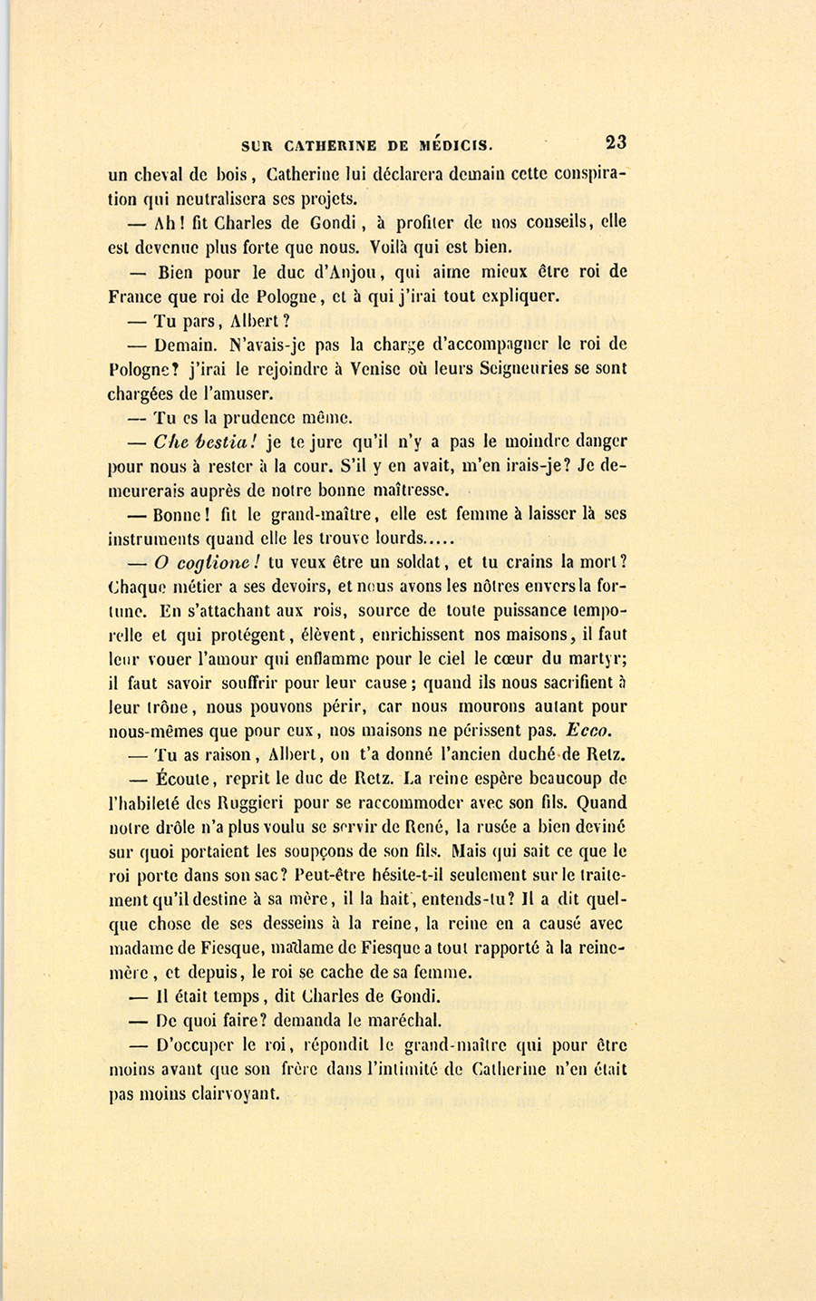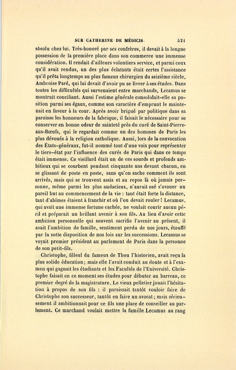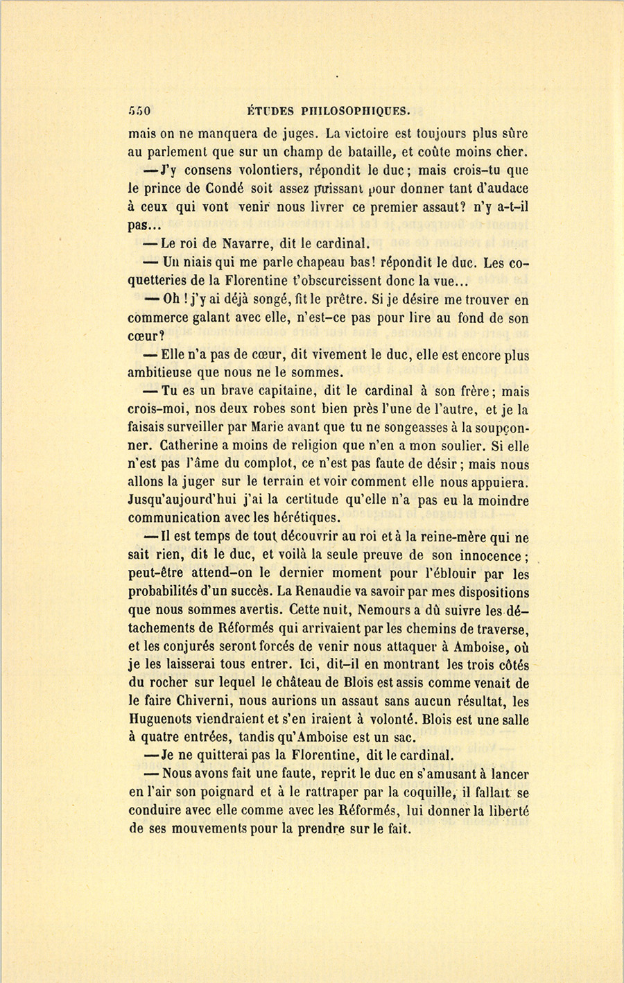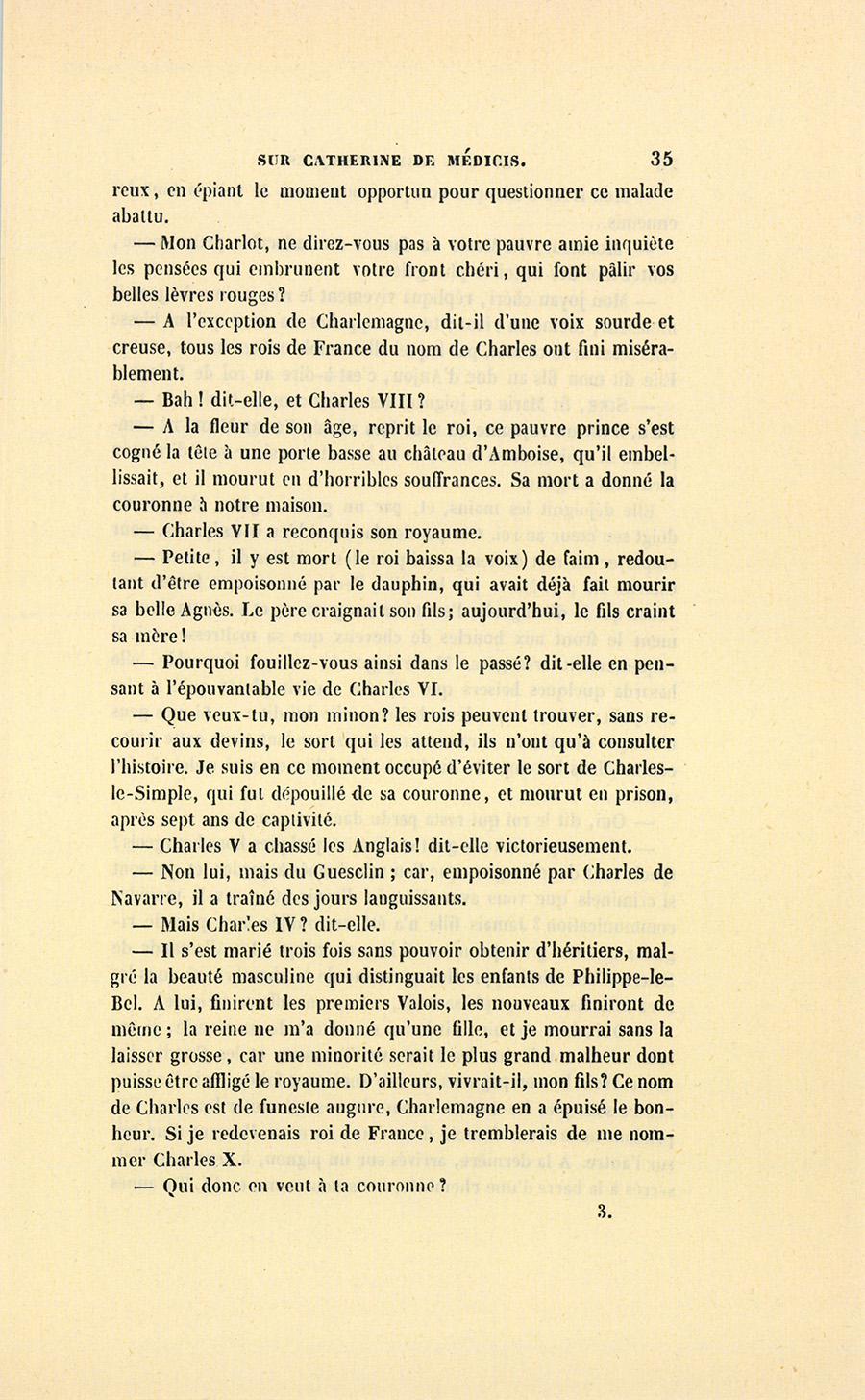 Une autre considération explique la défaveur historique et populaire de Catherine. L’Opposition en France a toujours été protestante, parce qu’elle n’a jamais eu que la négation pour politique ; elle a hérité des théories des Luthériens, des Calvinistes et des Protestants sur les mots terribles de liberté, de tolérance, de progrès et de philosophie. Deux siècles ont été employés par les opposants au pouvoir à établir la douteuse doctrine du libre arbitre. Deux autres siècles ont été employés à développer le premier corollaire du libre arbitre, la liberté de conscience. Notre siècle essaye d’établir le second, la liberté politique.