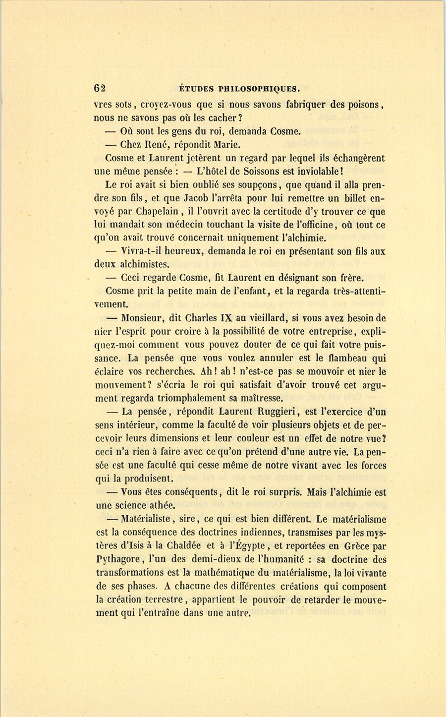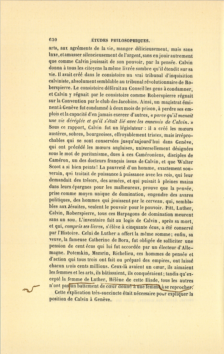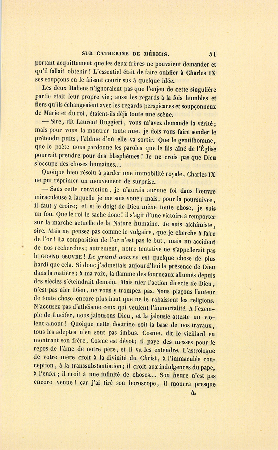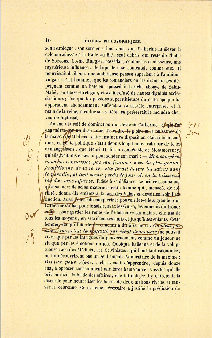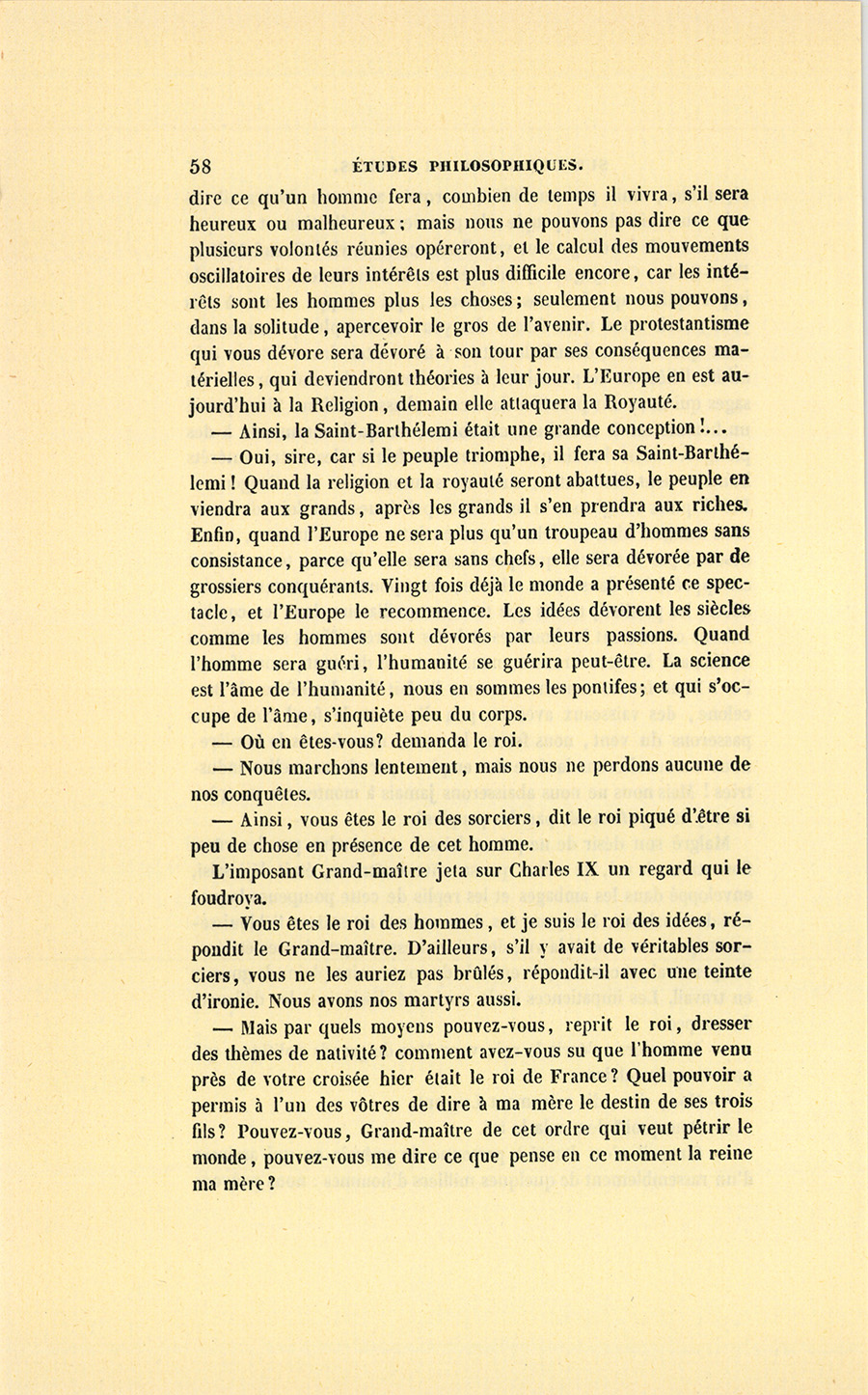 Une autre considération explique la défaveur historique et populaire de Catherine. L’Opposition en France a toujours été protestante, parce qu’elle n’a jamais eu que la négation pour politique ; elle a hérité des théories des Luthériens, des Calvinistes et des Protestants sur les mots terribles de liberté, de tolérance, de progrès et de philosophie. Deux siècles ont été employés par les opposants au pouvoir à établir la douteuse doctrine du libre arbitre. Deux autres siècles ont été employés à développer le premier corollaire du libre arbitre, la liberté de conscience. Notre siècle essaye d’établir le second, la liberté politique.