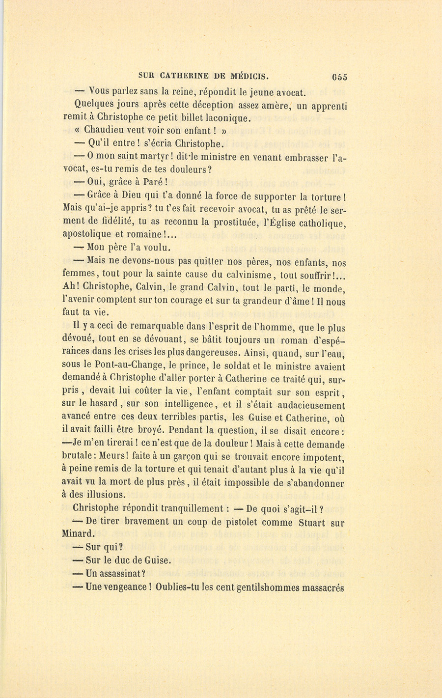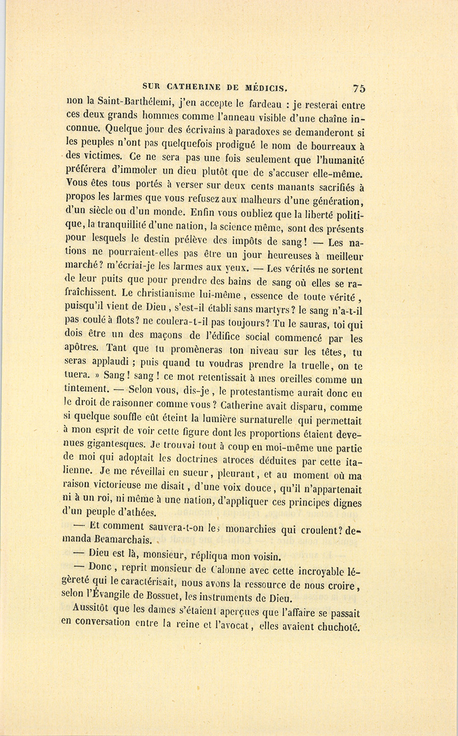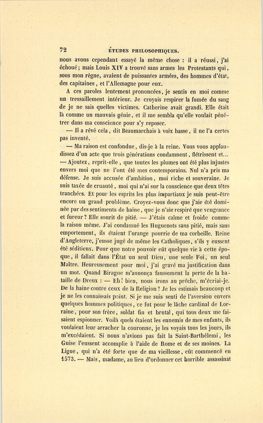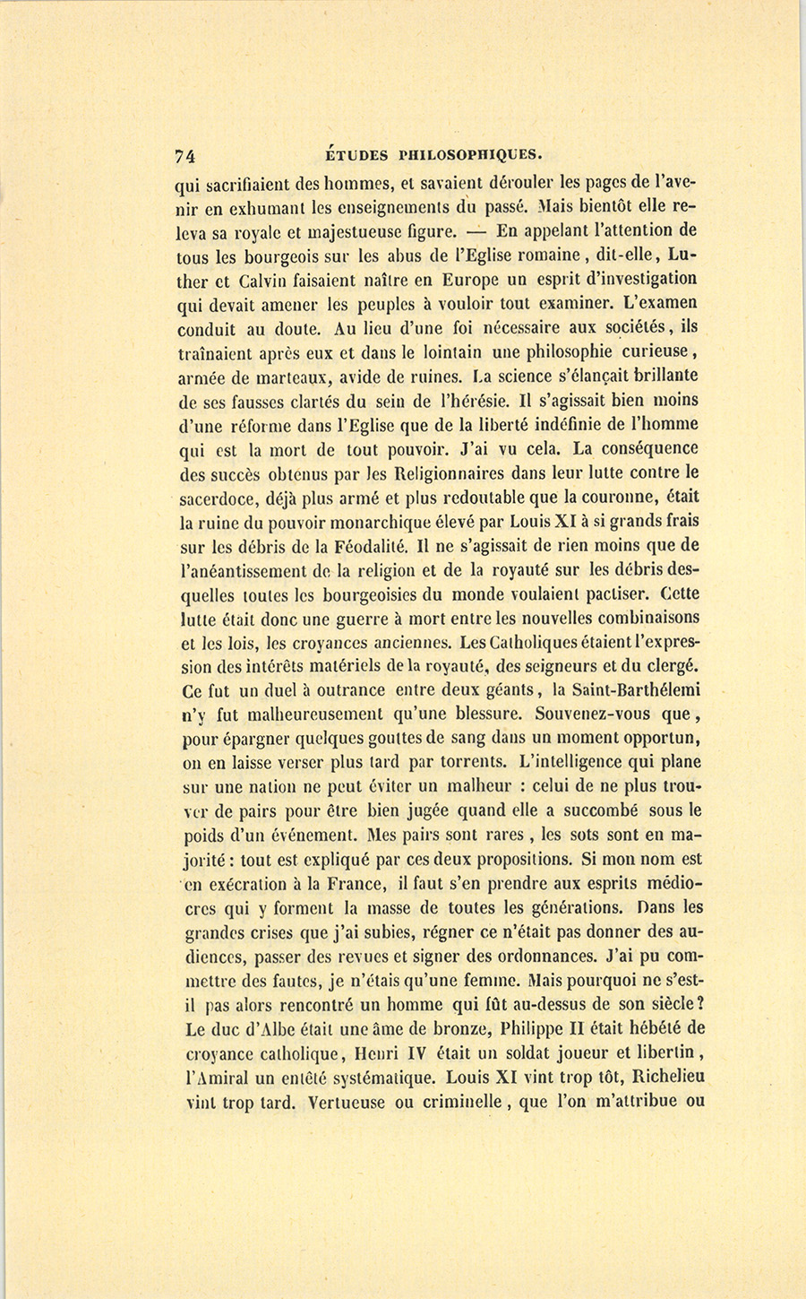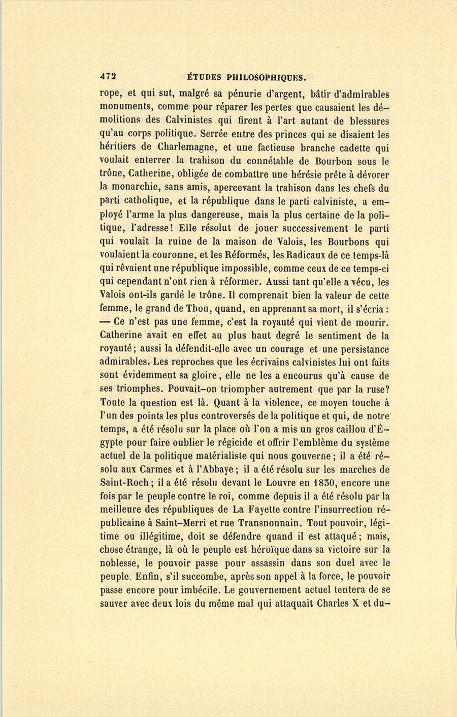 Pourquoi refuser de nos jours à la majestueuse adversaire de la plus inféconde des hérésies la grandeur qu’elle a tirée de sa lutte même ? Les Calvinistes ont beaucoup écrit contre le Stratagème de {p. 474} Charles IX ; mais parcourez la France ? en reconnaissant les ruines de tant de belles églises abattues, en mesurant les énormes blessures faites par les Religionnaires au corps social, en apprenant combien de revanches ils ont prises, en déplorant les malheurs de l’individualisme, la plaie de la France actuelle et dont le germe était dans les questions de liberté de conscience agitées par eux, vous vous demanderez de quel côté sont les bourreaux ? Il y a, comme le dit Catherine dans la troisième partie de cette Étude, « malheureusement à toutes les époques des écrivains hypocrites prêts à pleurer deux cents coquins tués à propos. » César, qui tâchait d’apitoyer le sénat sur le parti de Catilina, eût peut-être vaincu Cicéron, s’il avait eu des journaux et une Opposition à ses ordres.