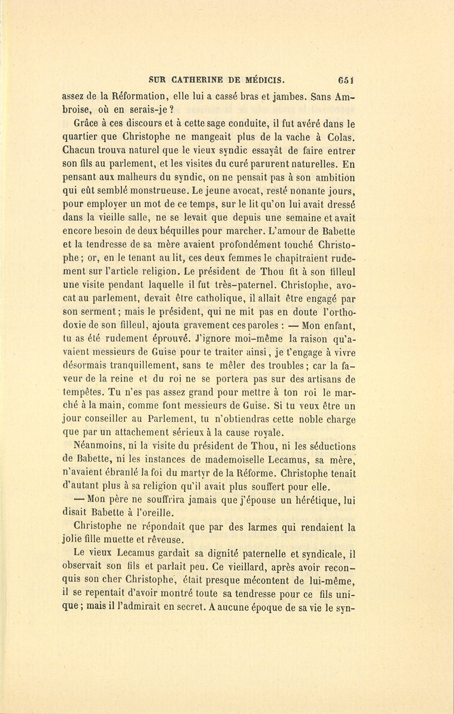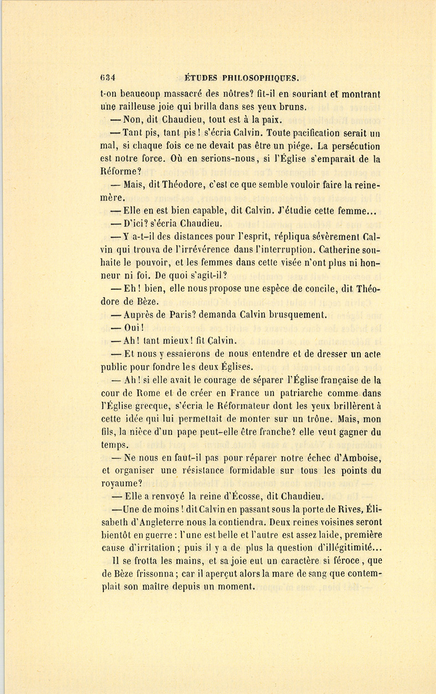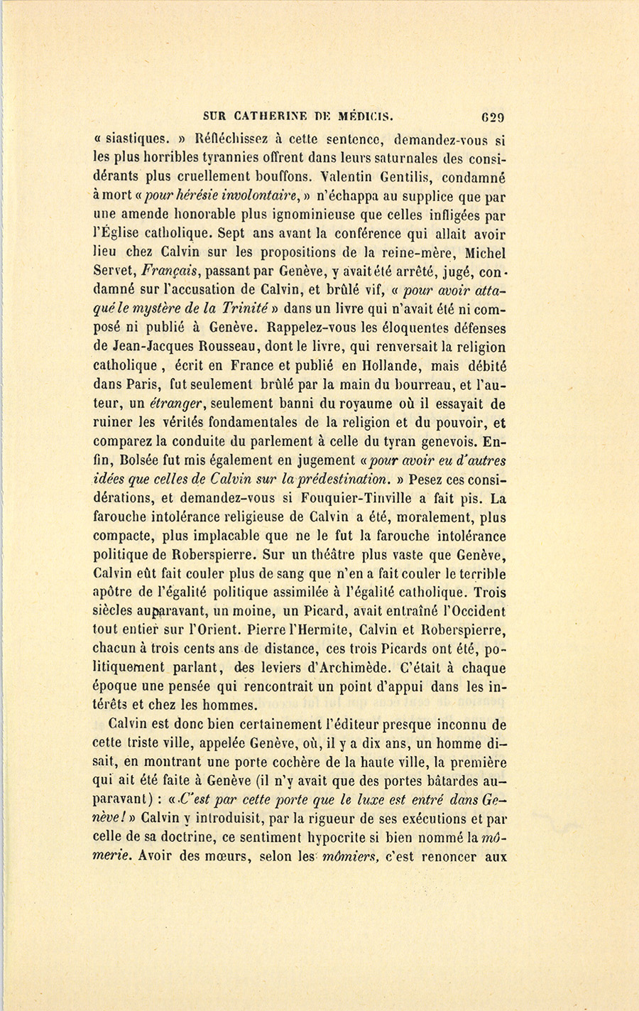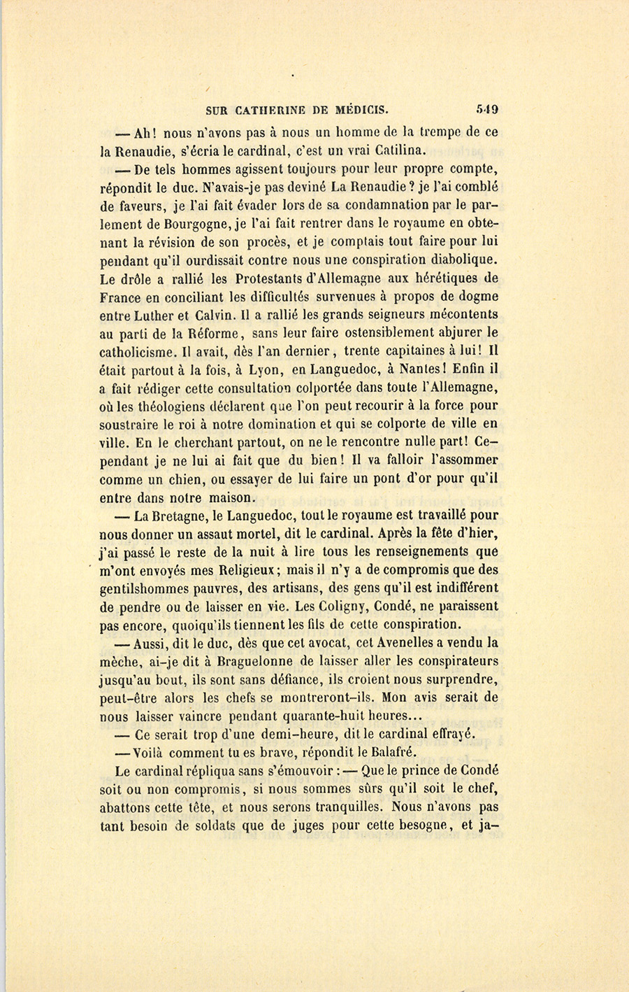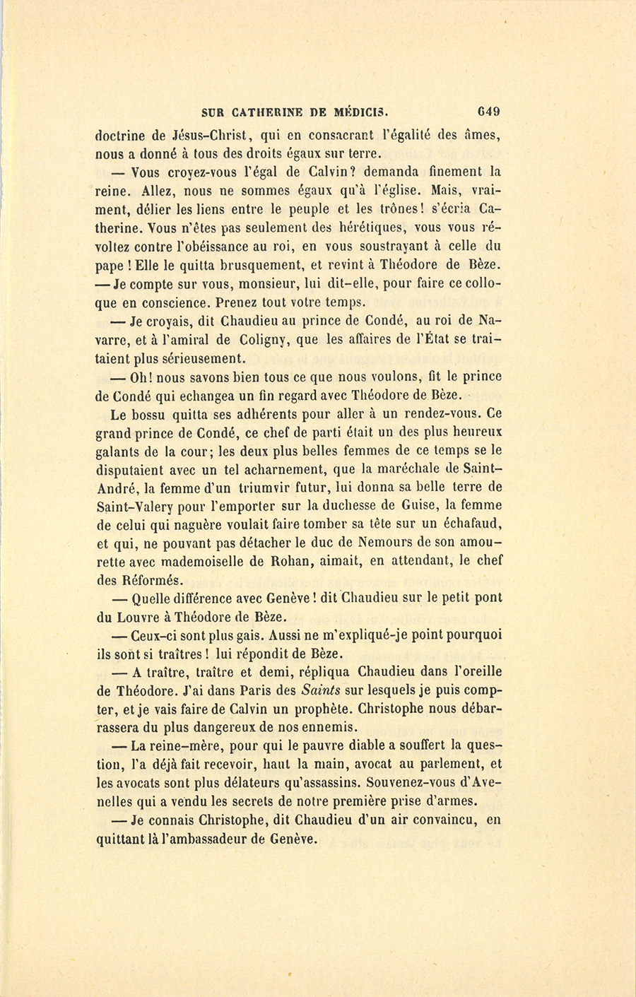 Pourquoi refuser de nos jours à la majestueuse adversaire de la plus inféconde des hérésies la grandeur qu’elle a tirée de sa lutte même ? Les Calvinistes ont beaucoup écrit contre le Stratagème de {p. 474} Charles IX ; mais parcourez la France ? en reconnaissant les ruines de tant de belles églises abattues, en mesurant les énormes blessures faites par les Religionnaires au corps social, en apprenant combien de revanches ils ont prises, en déplorant les malheurs de l’individualisme, la plaie de la France actuelle et dont le germe était dans les questions de liberté de conscience agitées par eux, vous vous demanderez de quel côté sont les bourreaux ? Il y a, comme le dit Catherine dans la troisième partie de cette Étude, « malheureusement à toutes les époques des écrivains hypocrites prêts à pleurer deux cents coquins tués à propos. » César, qui tâchait d’apitoyer le sénat sur le parti de Catilina, eût peut-être vaincu Cicéron, s’il avait eu des journaux et une Opposition à ses ordres.