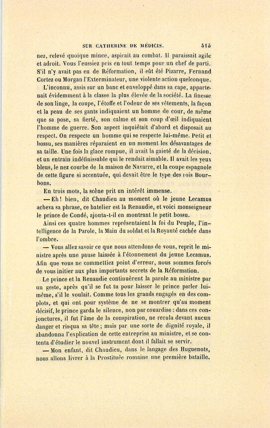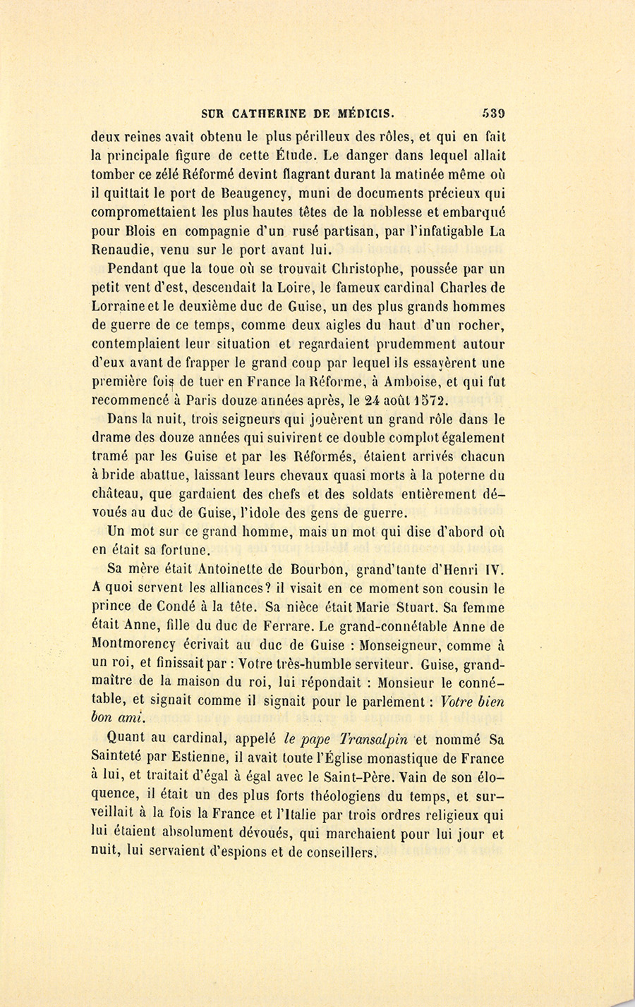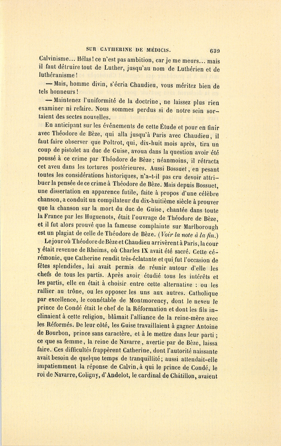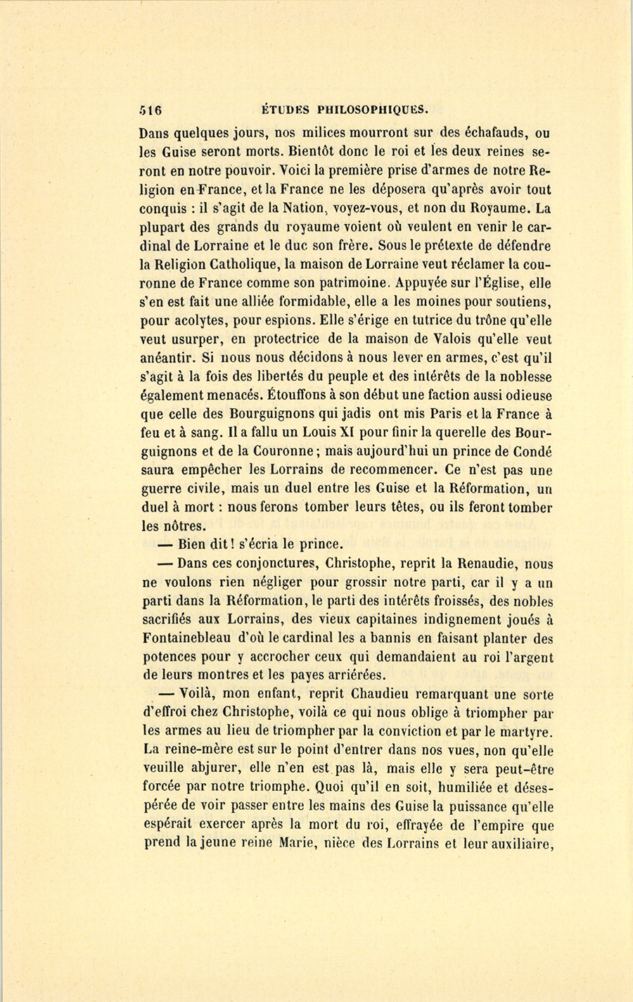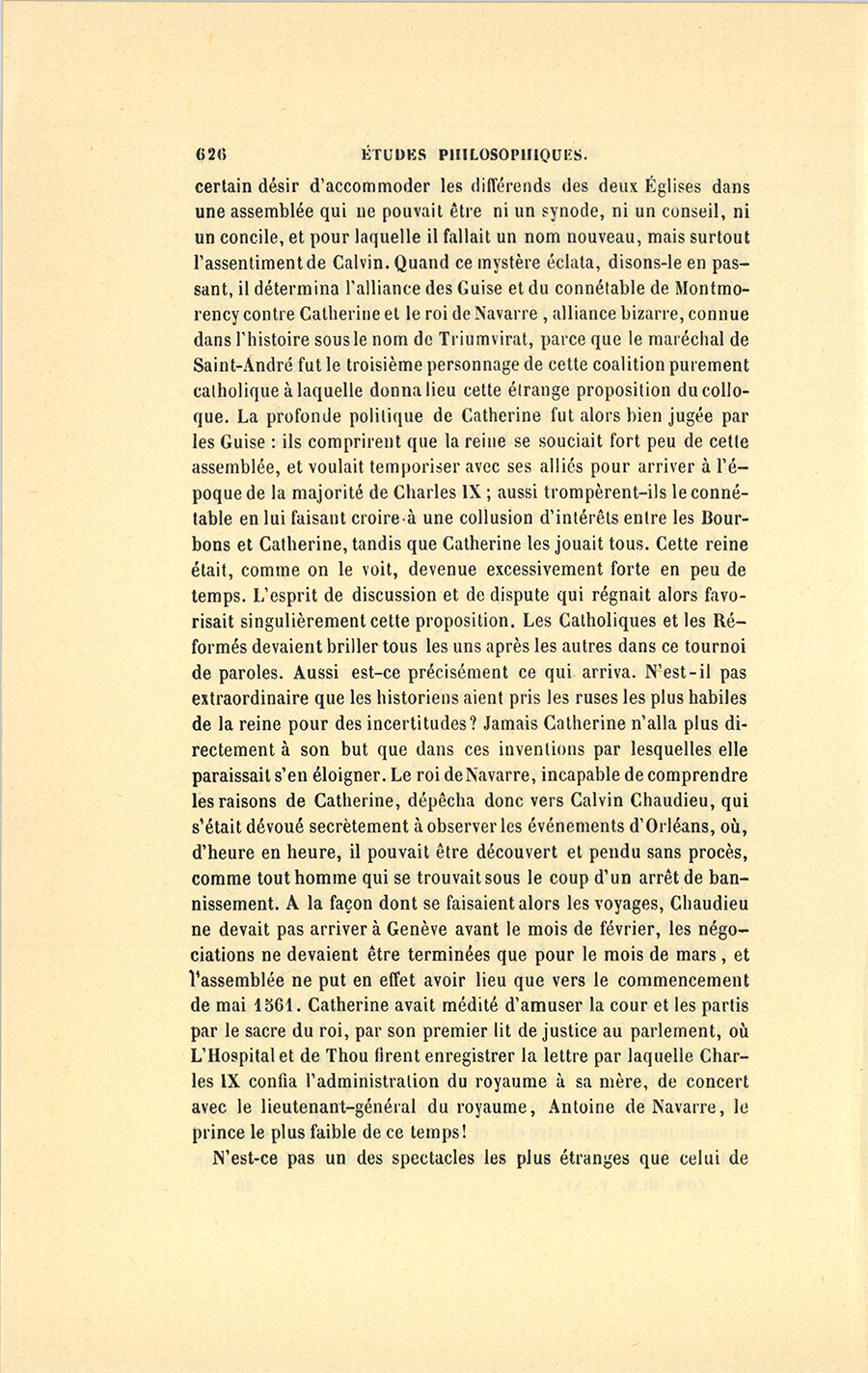 Pourquoi refuser de nos jours à la majestueuse adversaire de la plus inféconde des hérésies la grandeur qu’elle a tirée de sa lutte même ? Les Calvinistes ont beaucoup écrit contre le Stratagème de {p. 474} Charles IX ; mais parcourez la France ? en reconnaissant les ruines de tant de belles églises abattues, en mesurant les énormes blessures faites par les Religionnaires au corps social, en apprenant combien de revanches ils ont prises, en déplorant les malheurs de l’individualisme, la plaie de la France actuelle et dont le germe était dans les questions de liberté de conscience agitées par eux, vous vous demanderez de quel côté sont les bourreaux ? Il y a, comme le dit Catherine dans la troisième partie de cette Étude, « malheureusement à toutes les époques des écrivains hypocrites prêts à pleurer deux cents coquins tués à propos. » César, qui tâchait d’apitoyer le sénat sur le parti de Catilina, eût peut-être vaincu Cicéron, s’il avait eu des journaux et une Opposition à ses ordres.