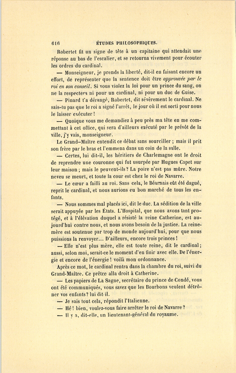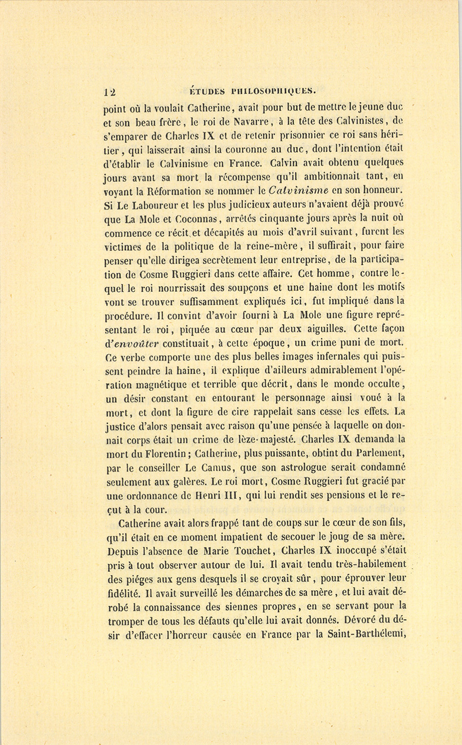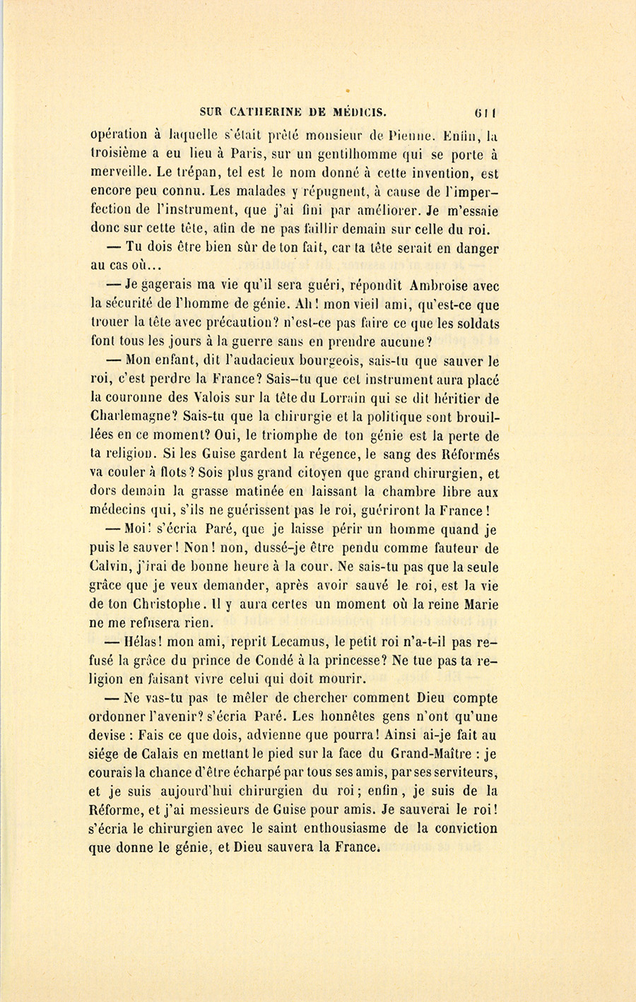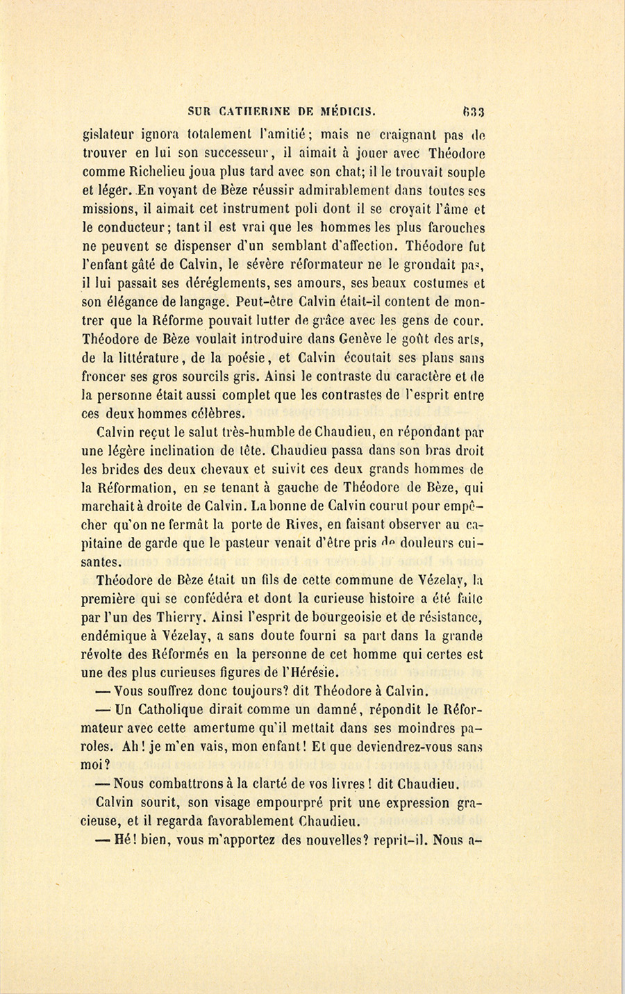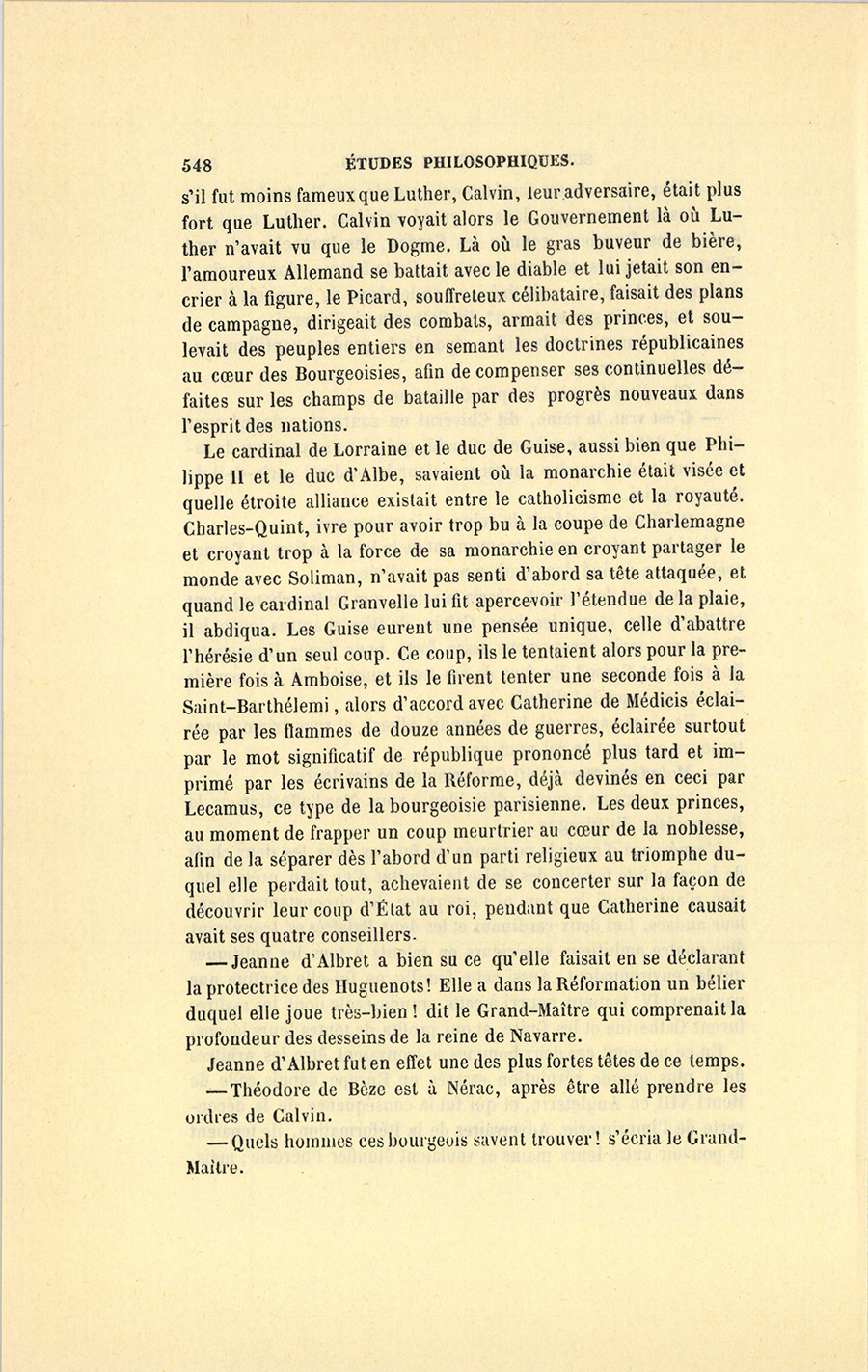 Pourquoi refuser de nos jours à la majestueuse adversaire de la plus inféconde des hérésies la grandeur qu’elle a tirée de sa lutte même ? Les Calvinistes ont beaucoup écrit contre le Stratagème de {p. 474} Charles IX ; mais parcourez la France ? en reconnaissant les ruines de tant de belles églises abattues, en mesurant les énormes blessures faites par les Religionnaires au corps social, en apprenant combien de revanches ils ont prises, en déplorant les malheurs de l’individualisme, la plaie de la France actuelle et dont le germe était dans les questions de liberté de conscience agitées par eux, vous vous demanderez de quel côté sont les bourreaux ? Il y a, comme le dit Catherine dans la troisième partie de cette Étude, « malheureusement à toutes les époques des écrivains hypocrites prêts à pleurer deux cents coquins tués à propos. » César, qui tâchait d’apitoyer le sénat sur le parti de Catilina, eût peut-être vaincu Cicéron, s’il avait eu des journaux et une Opposition à ses ordres.