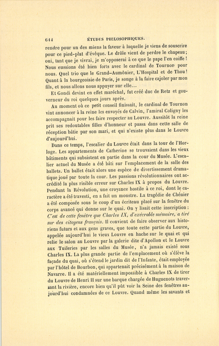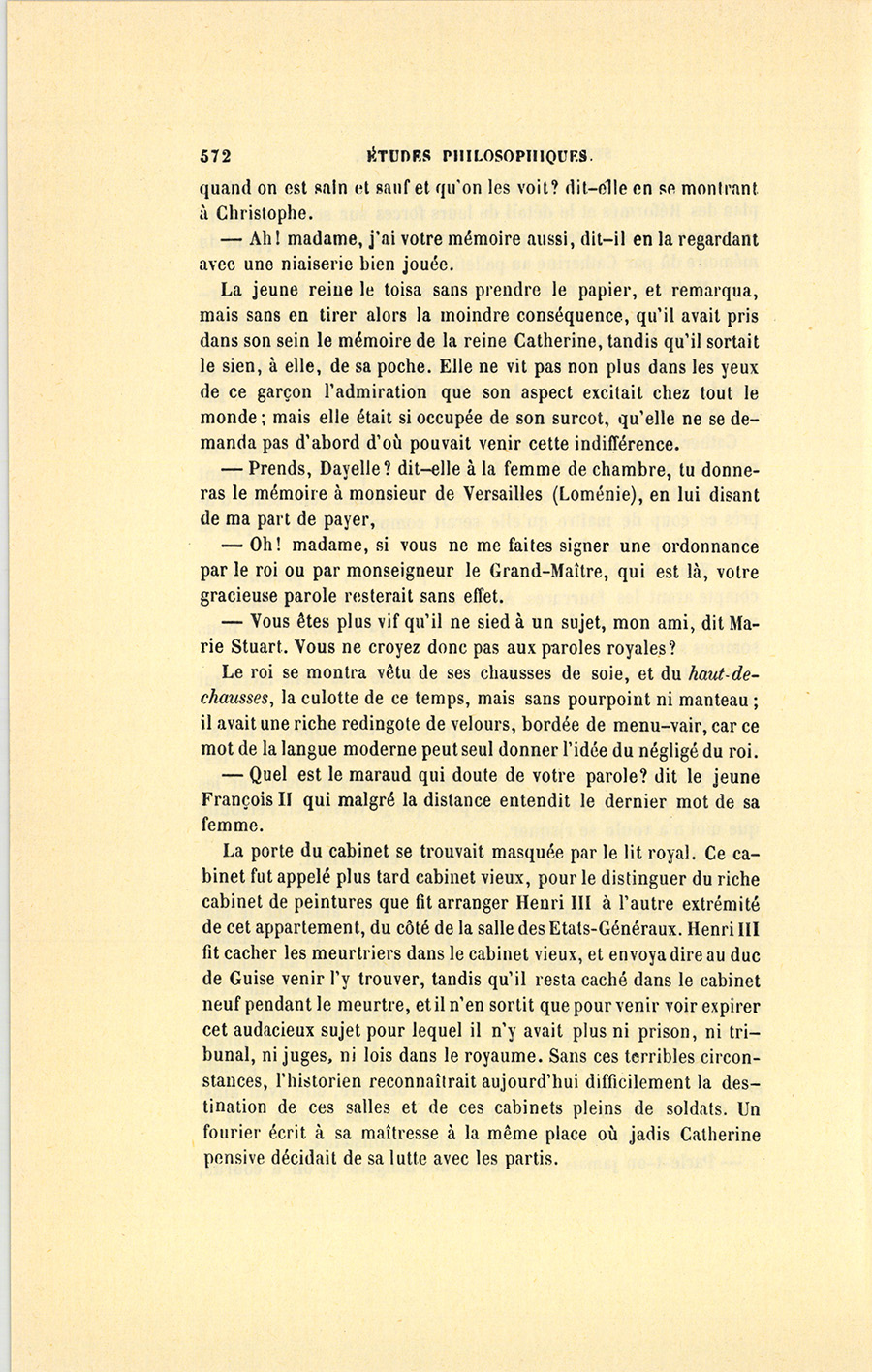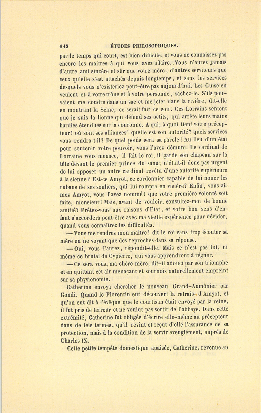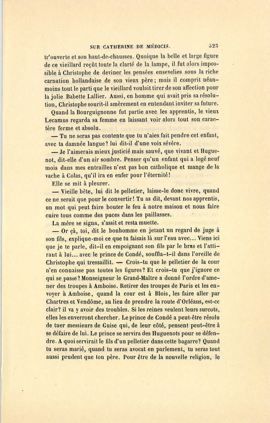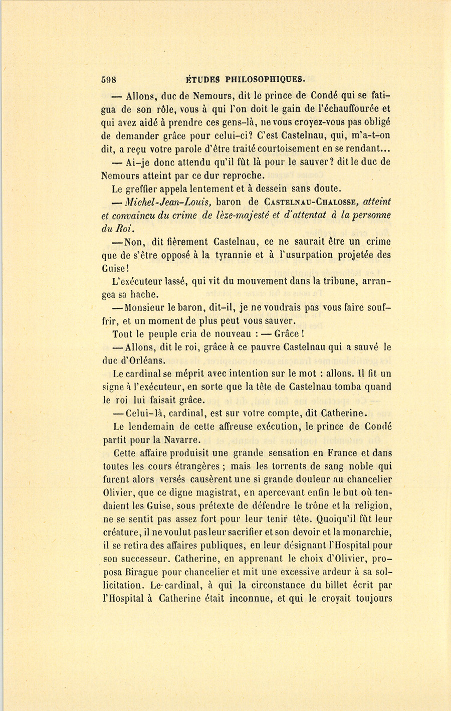 Pourquoi refuser de nos jours à la majestueuse adversaire de la plus inféconde des hérésies la grandeur qu’elle a tirée de sa lutte même ? Les Calvinistes ont beaucoup écrit contre le Stratagème de {p. 474} Charles IX ; mais parcourez la France ? en reconnaissant les ruines de tant de belles églises abattues, en mesurant les énormes blessures faites par les Religionnaires au corps social, en apprenant combien de revanches ils ont prises, en déplorant les malheurs de l’individualisme, la plaie de la France actuelle et dont le germe était dans les questions de liberté de conscience agitées par eux, vous vous demanderez de quel côté sont les bourreaux ? Il y a, comme le dit Catherine dans la troisième partie de cette Étude, « malheureusement à toutes les époques des écrivains hypocrites prêts à pleurer deux cents coquins tués à propos. » César, qui tâchait d’apitoyer le sénat sur le parti de Catilina, eût peut-être vaincu Cicéron, s’il avait eu des journaux et une Opposition à ses ordres.