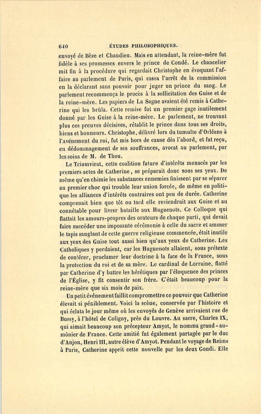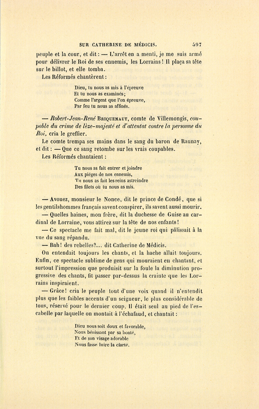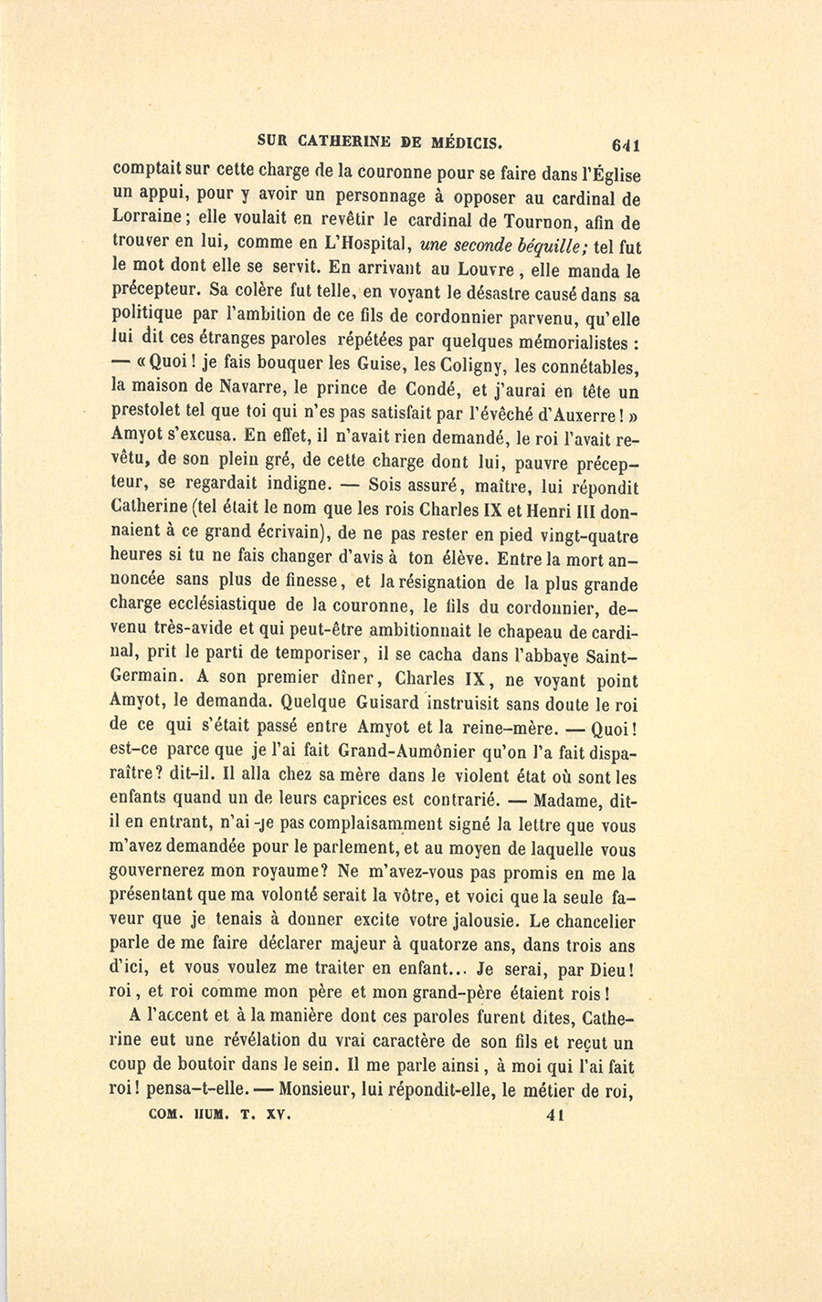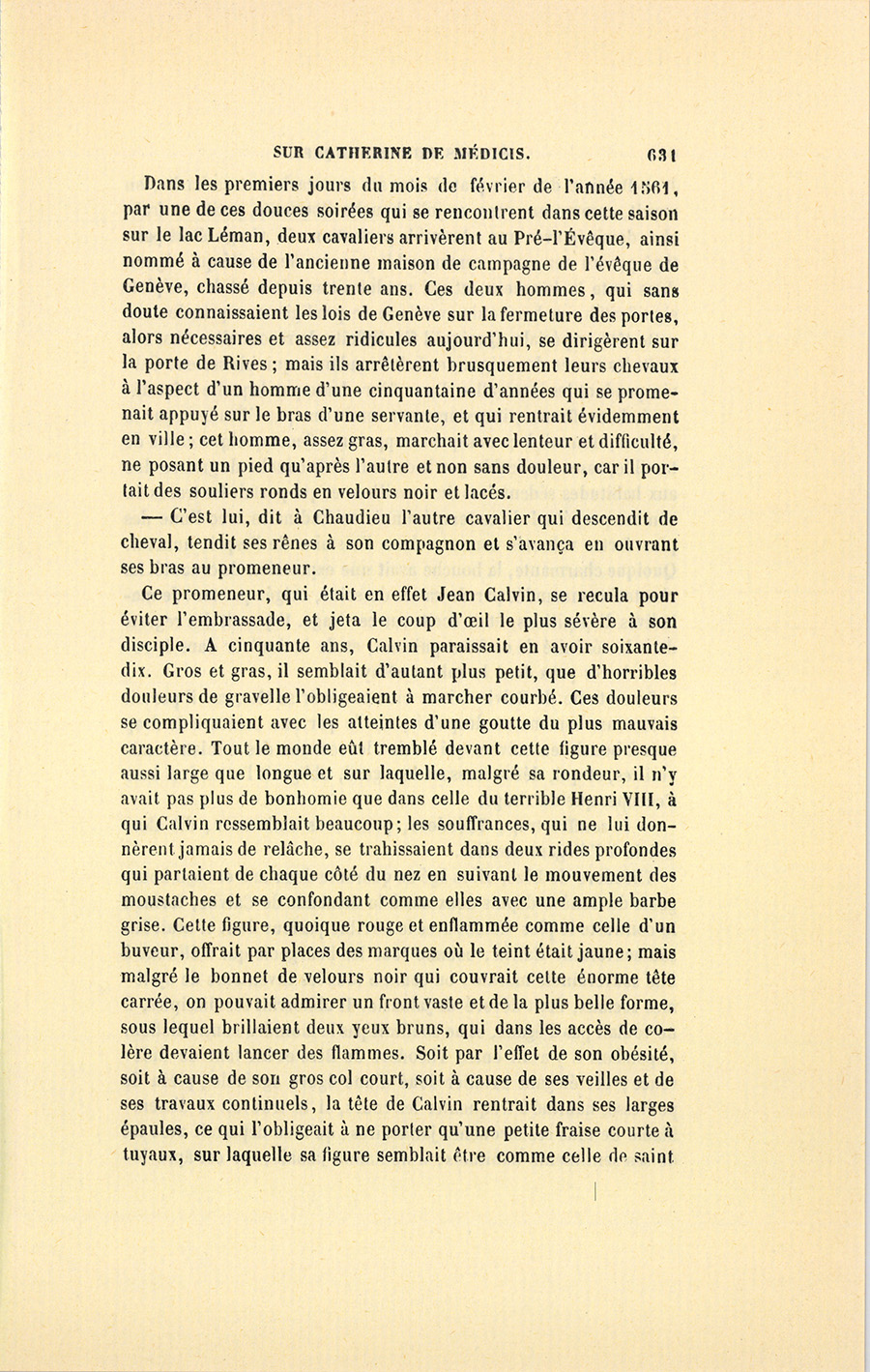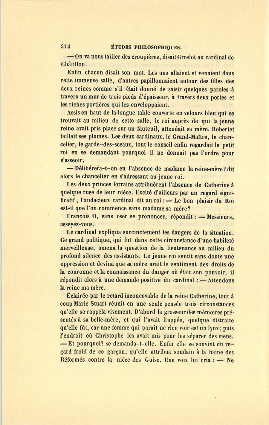 Pourquoi refuser de nos jours à la majestueuse adversaire de la plus inféconde des hérésies la grandeur qu’elle a tirée de sa lutte même ? Les Calvinistes ont beaucoup écrit contre le Stratagème de {p. 474} Charles IX ; mais parcourez la France ? en reconnaissant les ruines de tant de belles églises abattues, en mesurant les énormes blessures faites par les Religionnaires au corps social, en apprenant combien de revanches ils ont prises, en déplorant les malheurs de l’individualisme, la plaie de la France actuelle et dont le germe était dans les questions de liberté de conscience agitées par eux, vous vous demanderez de quel côté sont les bourreaux ? Il y a, comme le dit Catherine dans la troisième partie de cette Étude, « malheureusement à toutes les époques des écrivains hypocrites prêts à pleurer deux cents coquins tués à propos. » César, qui tâchait d’apitoyer le sénat sur le parti de Catilina, eût peut-être vaincu Cicéron, s’il avait eu des journaux et une Opposition à ses ordres.