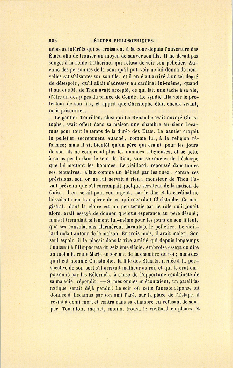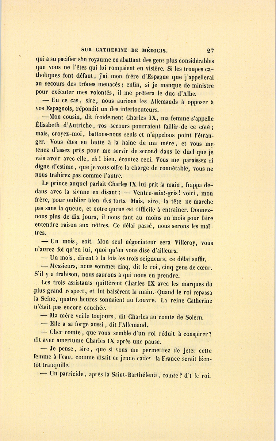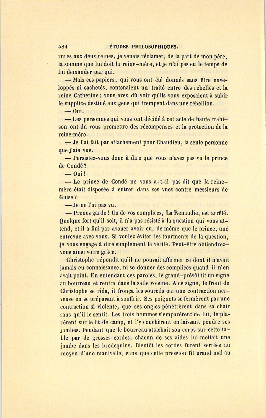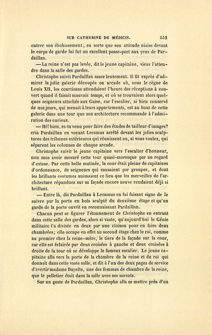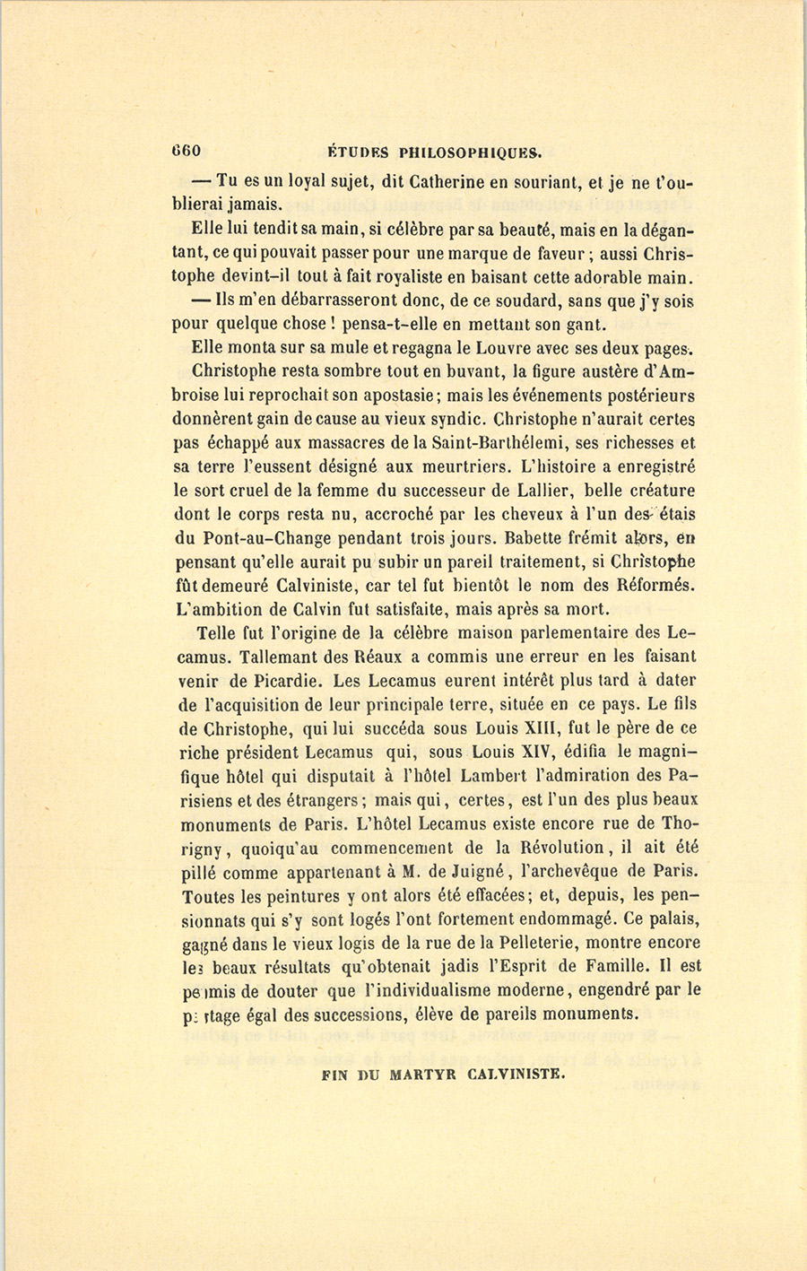 Pourquoi refuser de nos jours à la majestueuse adversaire de la plus inféconde des hérésies la grandeur qu’elle a tirée de sa lutte même ? Les Calvinistes ont beaucoup écrit contre le Stratagème de {p. 474} Charles IX ; mais parcourez la France ? en reconnaissant les ruines de tant de belles églises abattues, en mesurant les énormes blessures faites par les Religionnaires au corps social, en apprenant combien de revanches ils ont prises, en déplorant les malheurs de l’individualisme, la plaie de la France actuelle et dont le germe était dans les questions de liberté de conscience agitées par eux, vous vous demanderez de quel côté sont les bourreaux ? Il y a, comme le dit Catherine dans la troisième partie de cette Étude, « malheureusement à toutes les époques des écrivains hypocrites prêts à pleurer deux cents coquins tués à propos. » César, qui tâchait d’apitoyer le sénat sur le parti de Catilina, eût peut-être vaincu Cicéron, s’il avait eu des journaux et une Opposition à ses ordres.