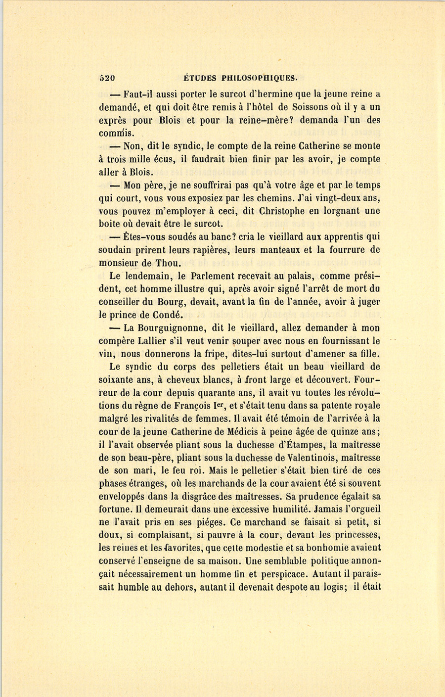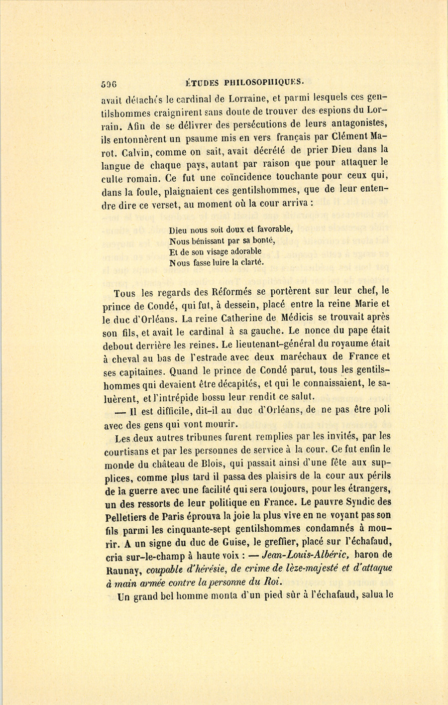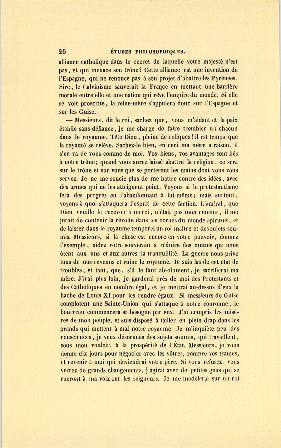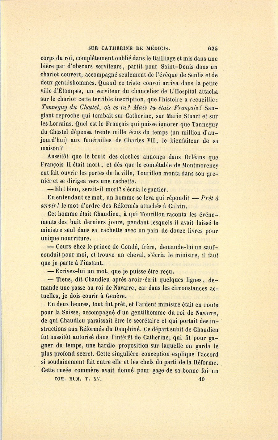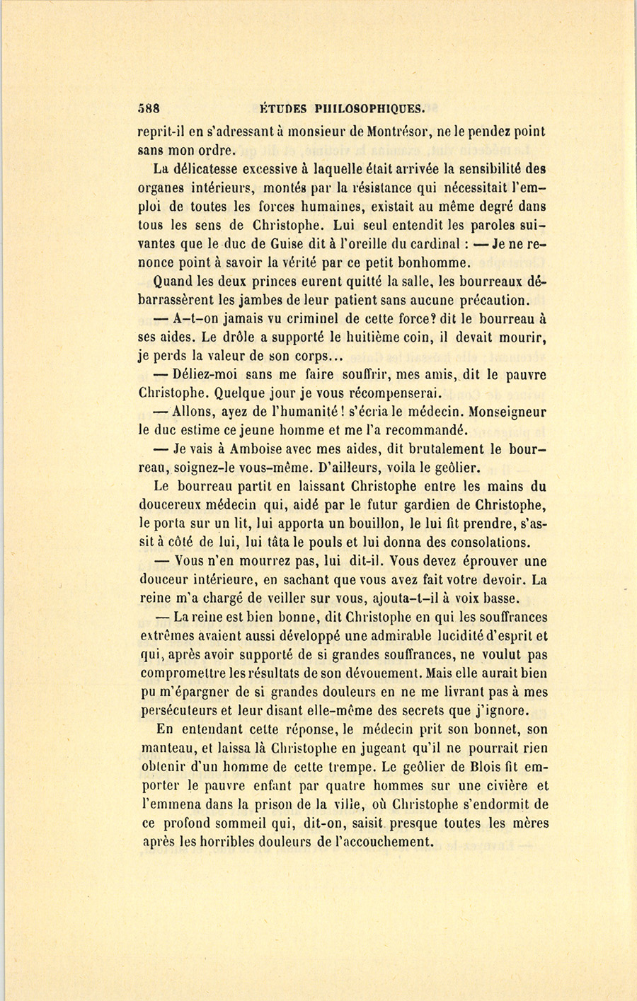 Pourquoi refuser de nos jours à la majestueuse adversaire de la plus inféconde des hérésies la grandeur qu’elle a tirée de sa lutte même ? Les Calvinistes ont beaucoup écrit contre le Stratagème de {p. 474} Charles IX ; mais parcourez la France ? en reconnaissant les ruines de tant de belles églises abattues, en mesurant les énormes blessures faites par les Religionnaires au corps social, en apprenant combien de revanches ils ont prises, en déplorant les malheurs de l’individualisme, la plaie de la France actuelle et dont le germe était dans les questions de liberté de conscience agitées par eux, vous vous demanderez de quel côté sont les bourreaux ? Il y a, comme le dit Catherine dans la troisième partie de cette Étude, « malheureusement à toutes les époques des écrivains hypocrites prêts à pleurer deux cents coquins tués à propos. » César, qui tâchait d’apitoyer le sénat sur le parti de Catilina, eût peut-être vaincu Cicéron, s’il avait eu des journaux et une Opposition à ses ordres.