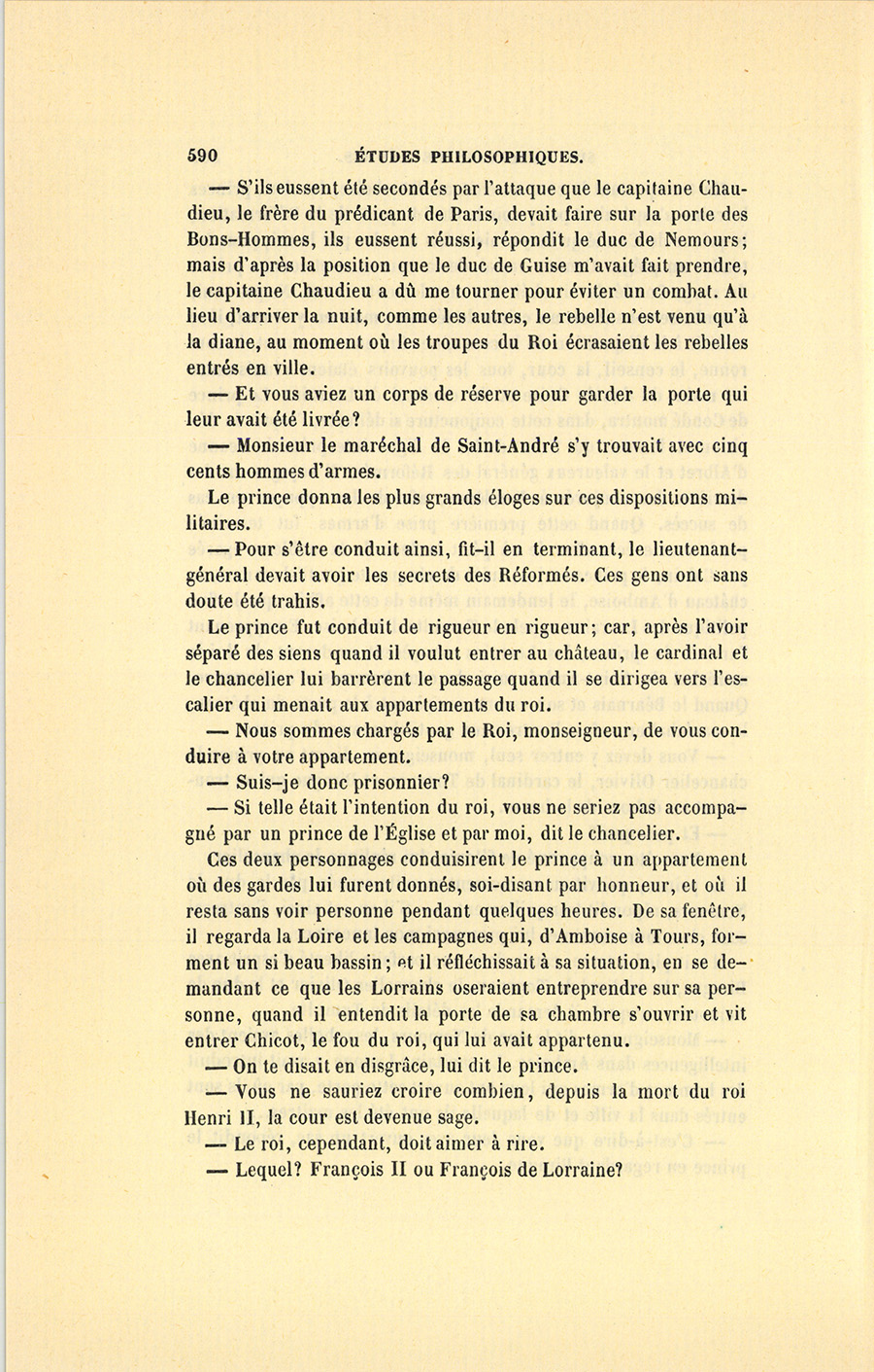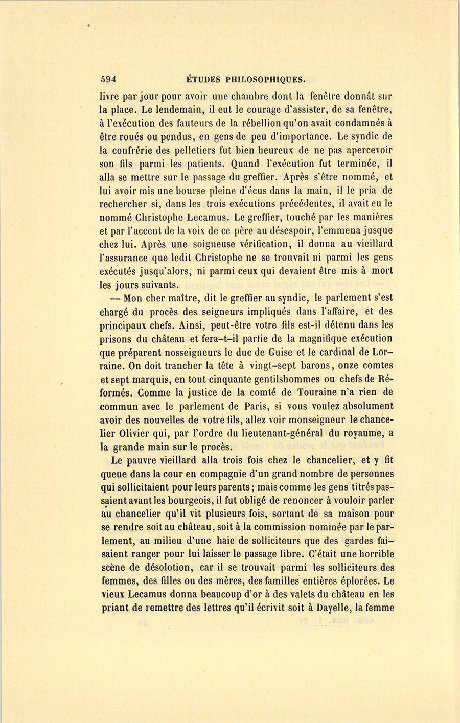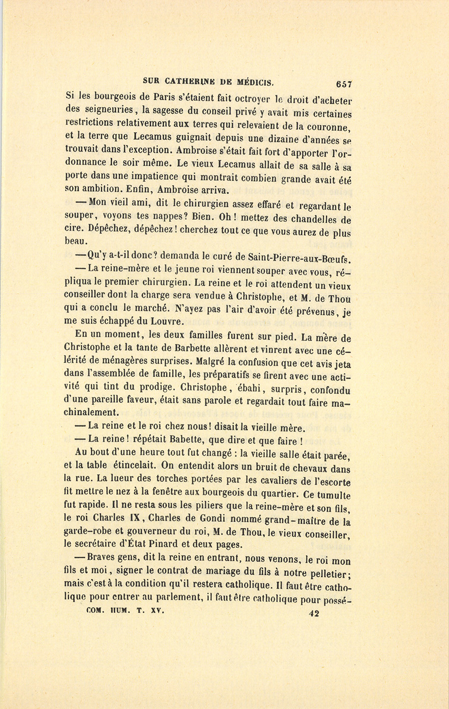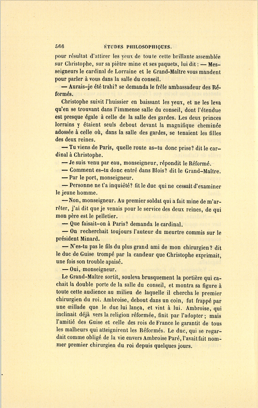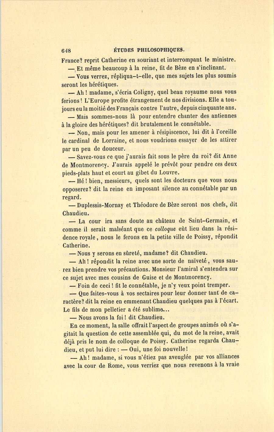 Pourquoi refuser de nos jours à la majestueuse adversaire de la plus inféconde des hérésies la grandeur qu’elle a tirée de sa lutte même ? Les Calvinistes ont beaucoup écrit contre le Stratagème de {p. 474} Charles IX ; mais parcourez la France ? en reconnaissant les ruines de tant de belles églises abattues, en mesurant les énormes blessures faites par les Religionnaires au corps social, en apprenant combien de revanches ils ont prises, en déplorant les malheurs de l’individualisme, la plaie de la France actuelle et dont le germe était dans les questions de liberté de conscience agitées par eux, vous vous demanderez de quel côté sont les bourreaux ? Il y a, comme le dit Catherine dans la troisième partie de cette Étude, « malheureusement à toutes les époques des écrivains hypocrites prêts à pleurer deux cents coquins tués à propos. » César, qui tâchait d’apitoyer le sénat sur le parti de Catilina, eût peut-être vaincu Cicéron, s’il avait eu des journaux et une Opposition à ses ordres.