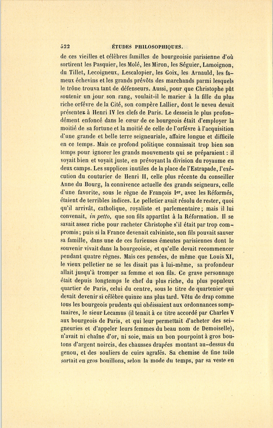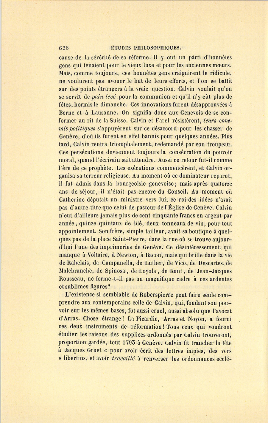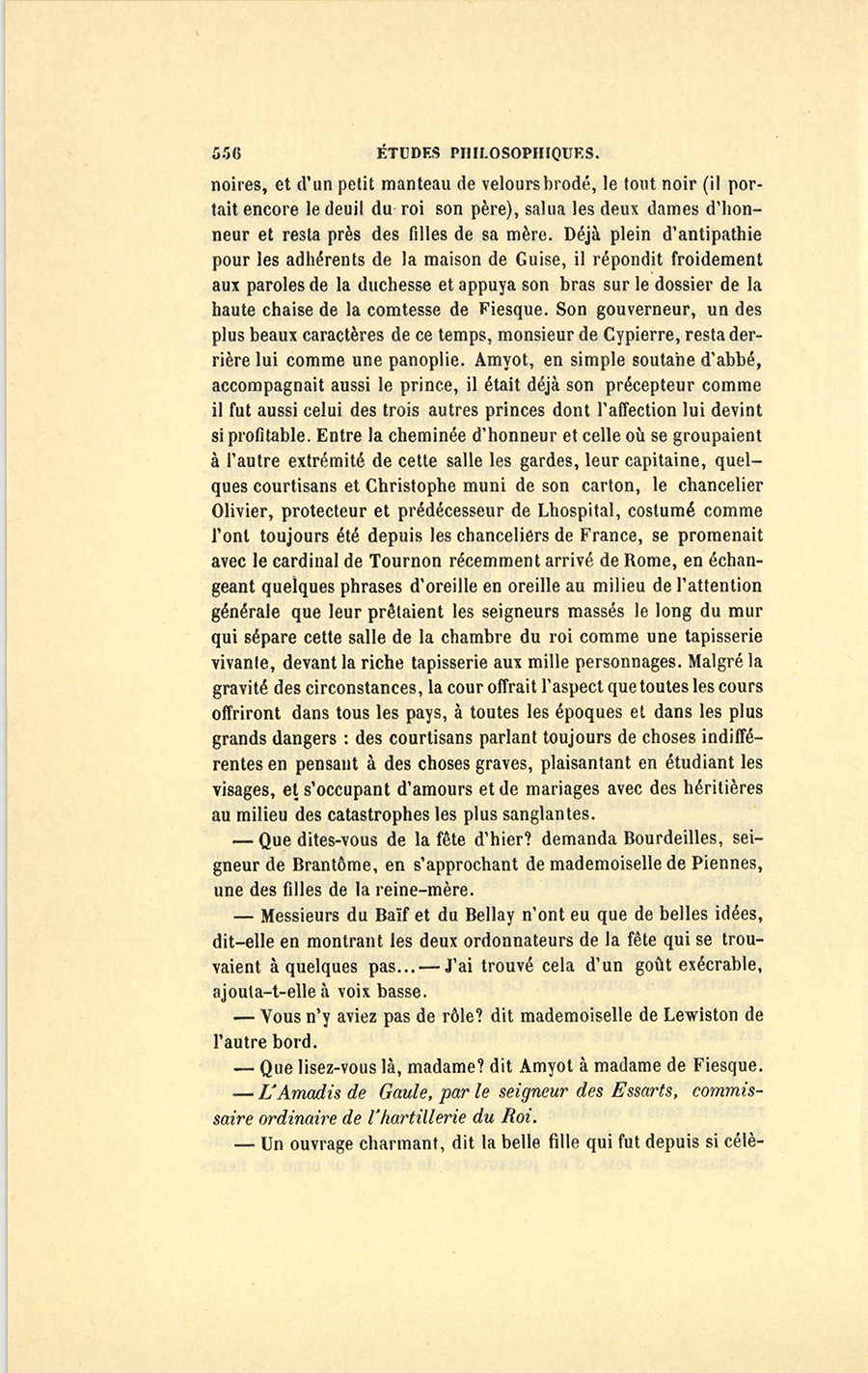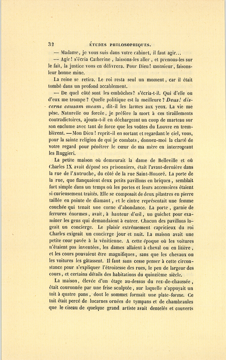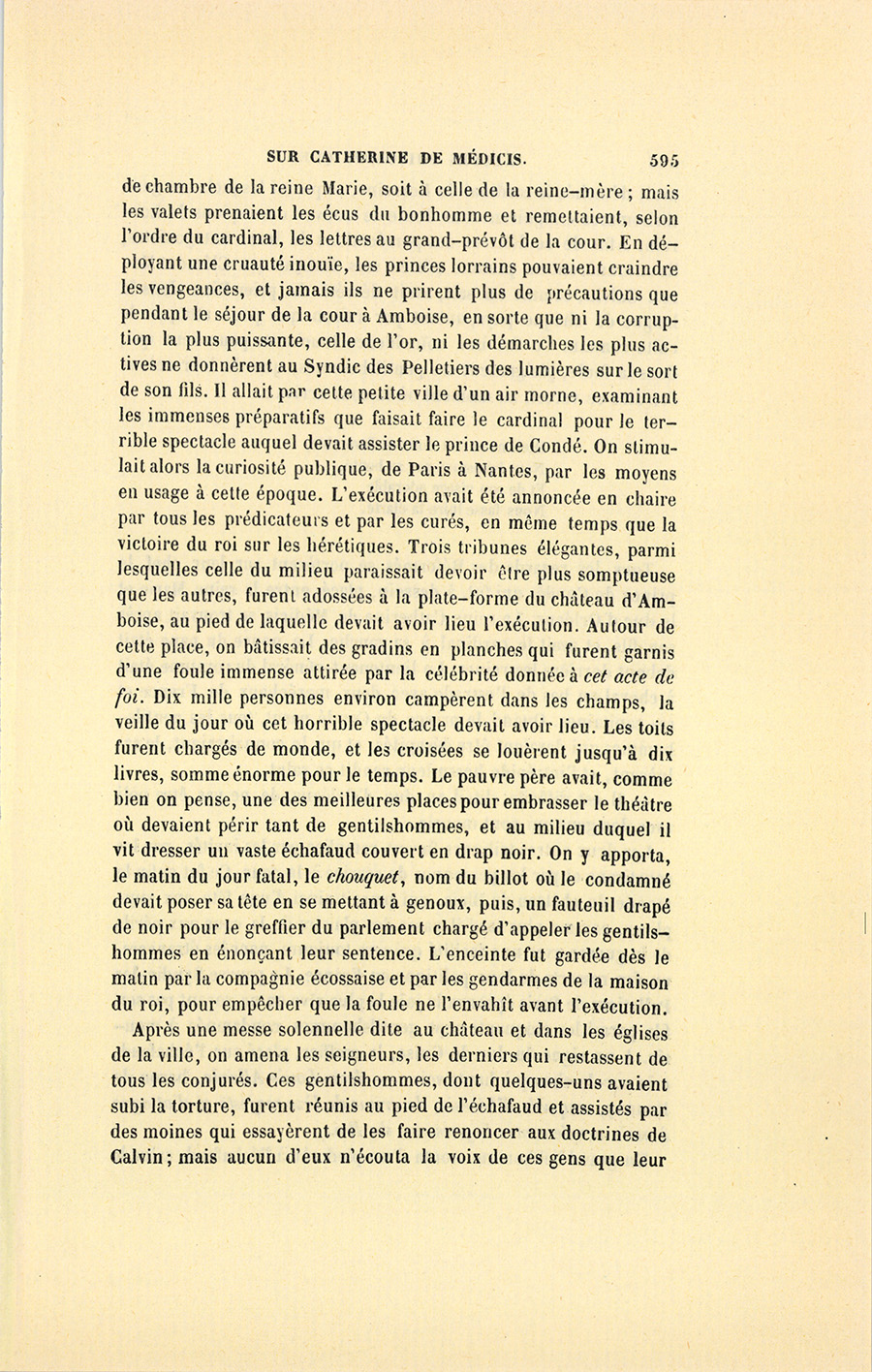 Pourquoi refuser de nos jours à la majestueuse adversaire de la plus inféconde des hérésies la grandeur qu’elle a tirée de sa lutte même ? Les Calvinistes ont beaucoup écrit contre le Stratagème de {p. 474} Charles IX ; mais parcourez la France ? en reconnaissant les ruines de tant de belles églises abattues, en mesurant les énormes blessures faites par les Religionnaires au corps social, en apprenant combien de revanches ils ont prises, en déplorant les malheurs de l’individualisme, la plaie de la France actuelle et dont le germe était dans les questions de liberté de conscience agitées par eux, vous vous demanderez de quel côté sont les bourreaux ? Il y a, comme le dit Catherine dans la troisième partie de cette Étude, « malheureusement à toutes les époques des écrivains hypocrites prêts à pleurer deux cents coquins tués à propos. » César, qui tâchait d’apitoyer le sénat sur le parti de Catilina, eût peut-être vaincu Cicéron, s’il avait eu des journaux et une Opposition à ses ordres.