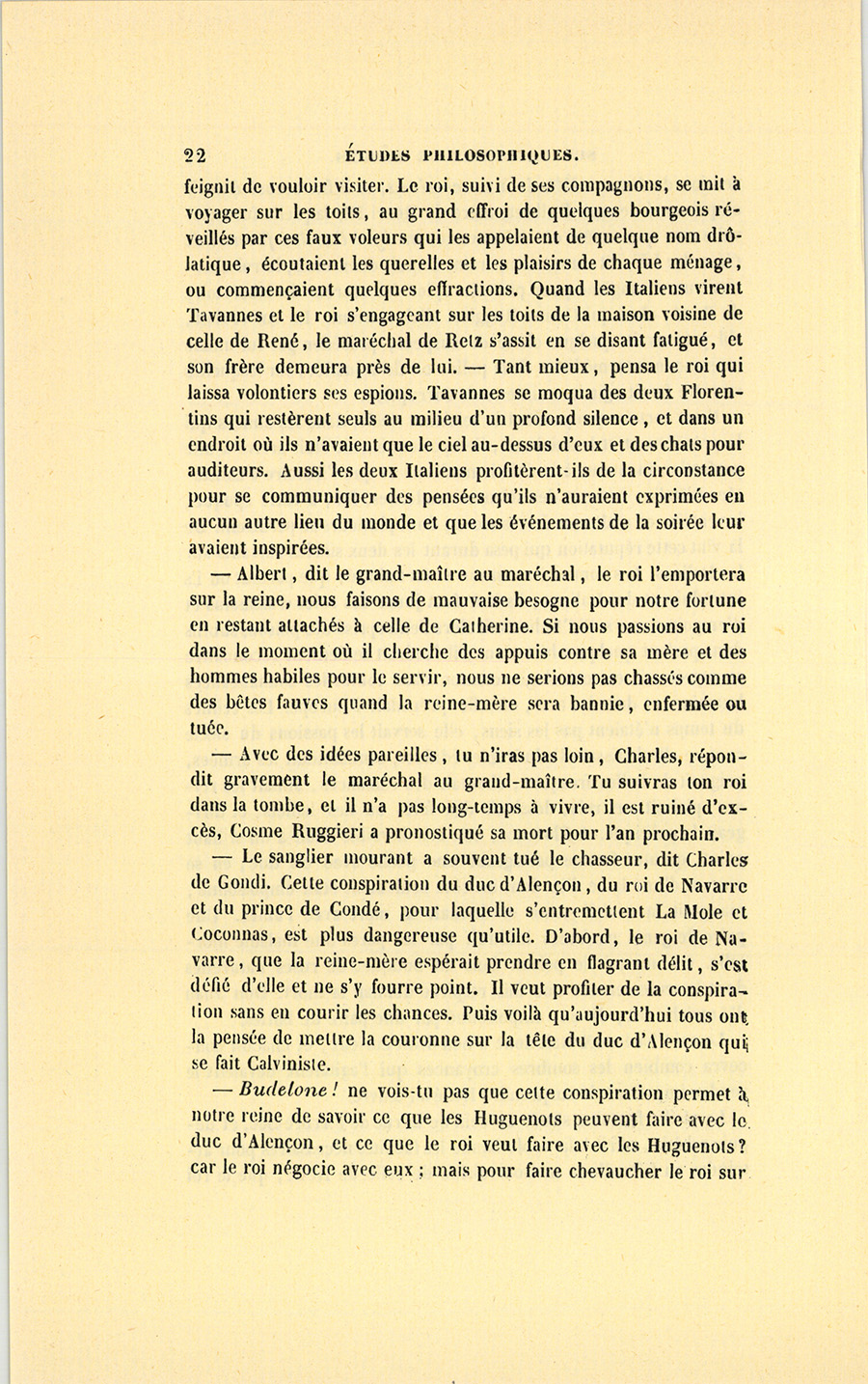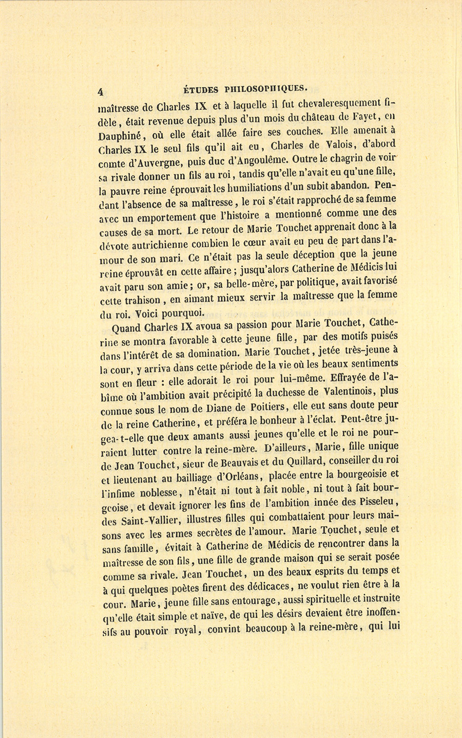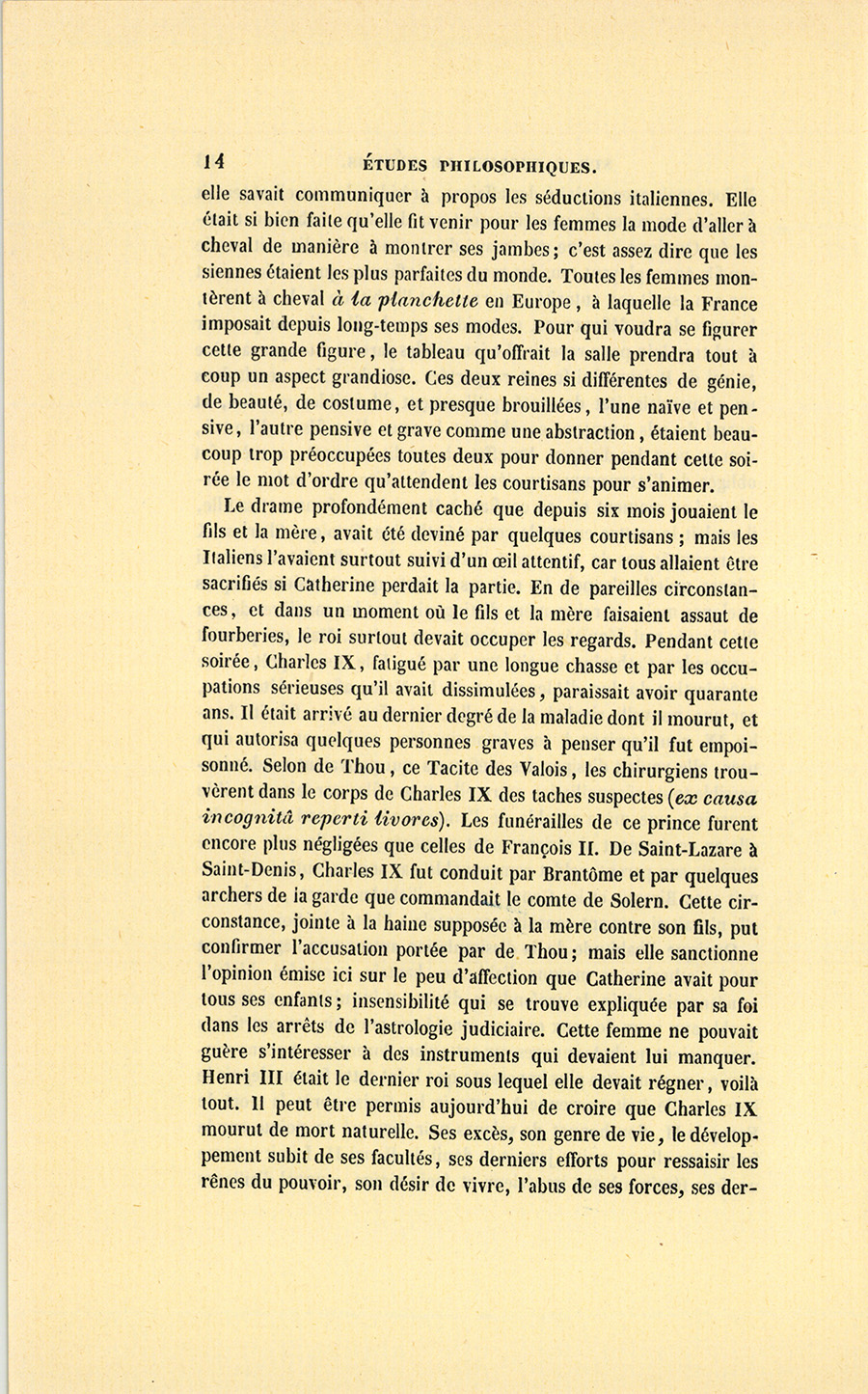 Avant d’entreprendre d’écrire l’histoire des mœurs en action, l’auteur de cette Étude avait patiemment et minutieusement étudié les principaux règnes de l’histoire de France, la querelle des Bourguignons et des Armagnacs, celle des Guise et des Valois, qui, chacune, tiennent un siècle. Son intention fut d’écrire une histoire de France pittoresque. Isabelle de Bavière, Catherine et Marie de Médicis, ces trois femmes y tiennent une place énorme, dominent du quatorzième au dix-septième siècle, et aboutissent à Louis XIV. De ces trois reines, Catherine est la plus intéressante et la plus belle. Ce fut une domination virile que ne déshonorèrent ni les amours terribles d’Isabelle, ni les plus terribles encore, quoique moins connues, de Marie de Médicis. Isabelle appela les Anglais en France contre son fils, aima le duc d’Orléans, son beau-frère, et {p. 478} Boisbourdon. Le compte de Marie de Médicis est encore plus lourd. Ni l’une ni l’autre, elles n’eurent de génie politique. Dans ces études et dans ces parallèles, l’auteur acquit la conviction de la grandeur de Catherine : en s’initiant aux difficultés renaissantes de sa position, il reconnut combien les historiens, influencés tous par les protestants, avaient été injustes pour cette reine ; et il lui en est resté les trois esquisses que voici, où sont combattues quelques opinions erronées sur elle, sur les personnages qui l’entouraient et sur les choses de son temps. Si ce travail se trouve parmi les Études philosophiques, c’est qu’il montre l’esprit d’un temps et qu’on y voit clairement l’influence de la pensée. Mais avant d’entrer dans l’arène politique où Catherine se voit aux prises avec les deux grandes difficultés de sa carrière, il est nécessaire de présenter un précis de sa vie antérieure, fait au point de vue d’une critique impartiale, afin qu’on embrasse le cours presque entier de cette vaste et royale existence, jusqu’au moment où commence la première partie de cette Étude.
