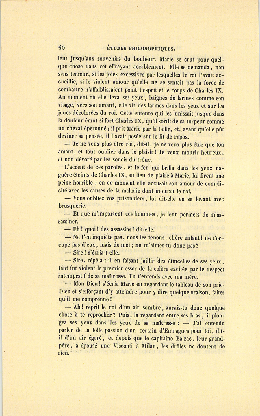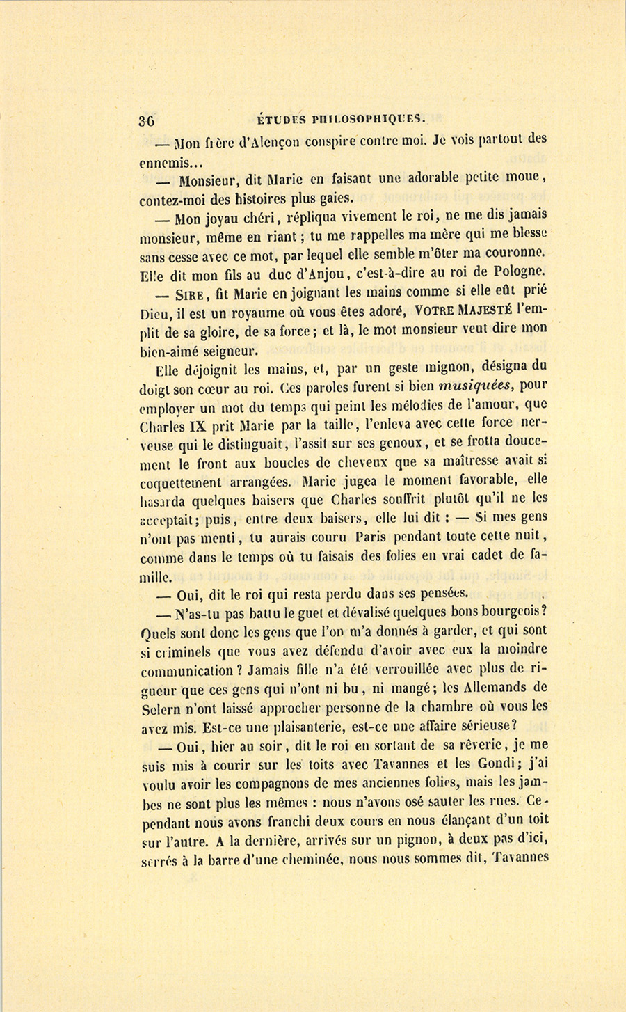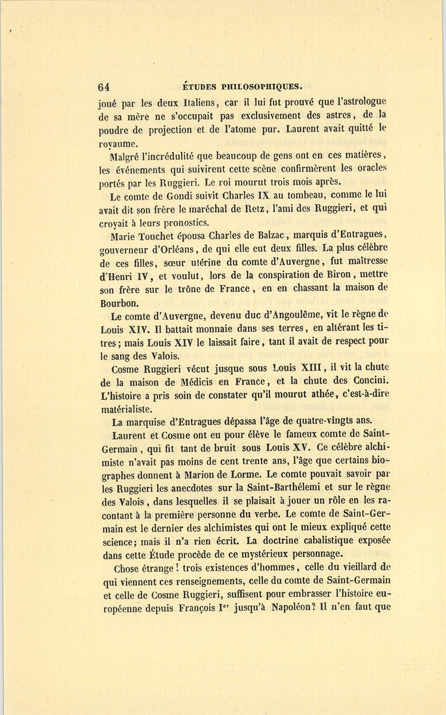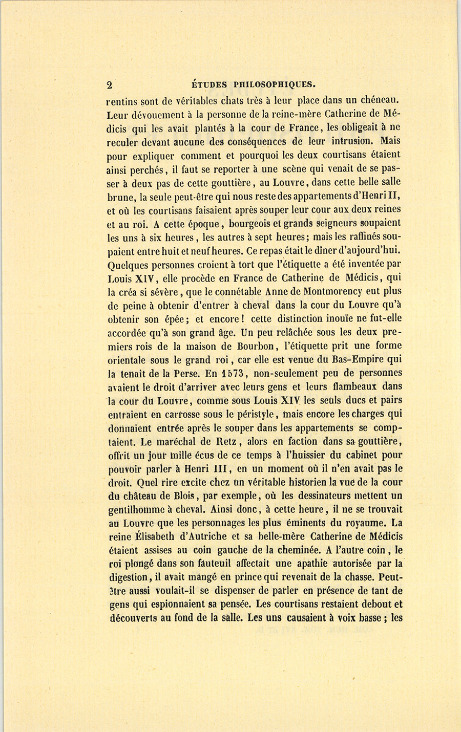 Avant d’entreprendre d’écrire l’histoire des mœurs en action, l’auteur de cette Étude avait patiemment et minutieusement étudié les principaux règnes de l’histoire de France, la querelle des Bourguignons et des Armagnacs, celle des Guise et des Valois, qui, chacune, tiennent un siècle. Son intention fut d’écrire une histoire de France pittoresque. Isabelle de Bavière, Catherine et Marie de Médicis, ces trois femmes y tiennent une place énorme, dominent du quatorzième au dix-septième siècle, et aboutissent à Louis XIV. De ces trois reines, Catherine est la plus intéressante et la plus belle. Ce fut une domination virile que ne déshonorèrent ni les amours terribles d’Isabelle, ni les plus terribles encore, quoique moins connues, de Marie de Médicis. Isabelle appela les Anglais en France contre son fils, aima le duc d’Orléans, son beau-frère, et {p. 478} Boisbourdon. Le compte de Marie de Médicis est encore plus lourd. Ni l’une ni l’autre, elles n’eurent de génie politique. Dans ces études et dans ces parallèles, l’auteur acquit la conviction de la grandeur de Catherine : en s’initiant aux difficultés renaissantes de sa position, il reconnut combien les historiens, influencés tous par les protestants, avaient été injustes pour cette reine ; et il lui en est resté les trois esquisses que voici, où sont combattues quelques opinions erronées sur elle, sur les personnages qui l’entouraient et sur les choses de son temps. Si ce travail se trouve parmi les Études philosophiques, c’est qu’il montre l’esprit d’un temps et qu’on y voit clairement l’influence de la pensée. Mais avant d’entrer dans l’arène politique où Catherine se voit aux prises avec les deux grandes difficultés de sa carrière, il est nécessaire de présenter un précis de sa vie antérieure, fait au point de vue d’une critique impartiale, afin qu’on embrasse le cours presque entier de cette vaste et royale existence, jusqu’au moment où commence la première partie de cette Étude.