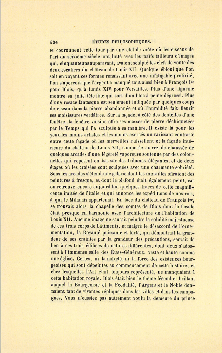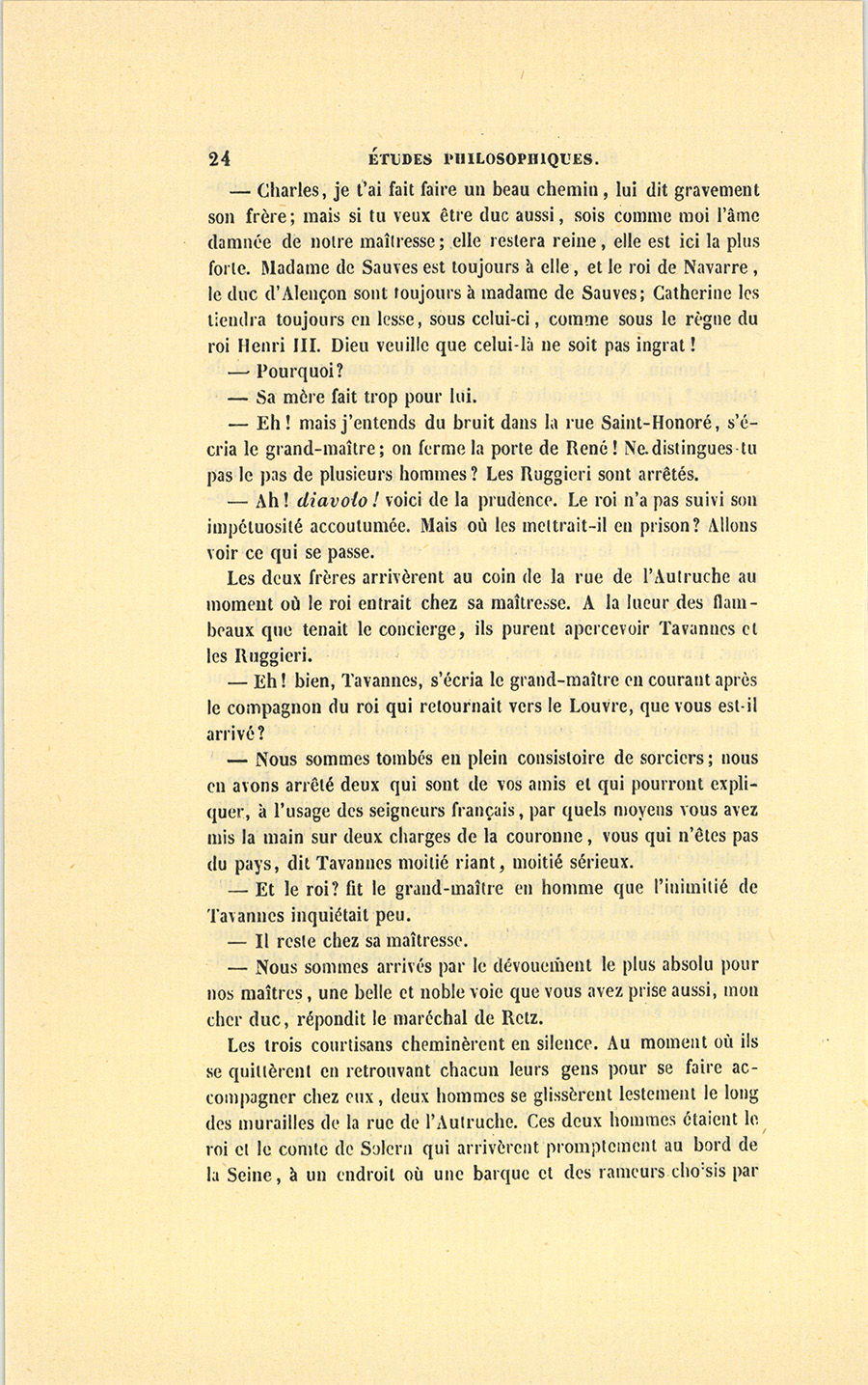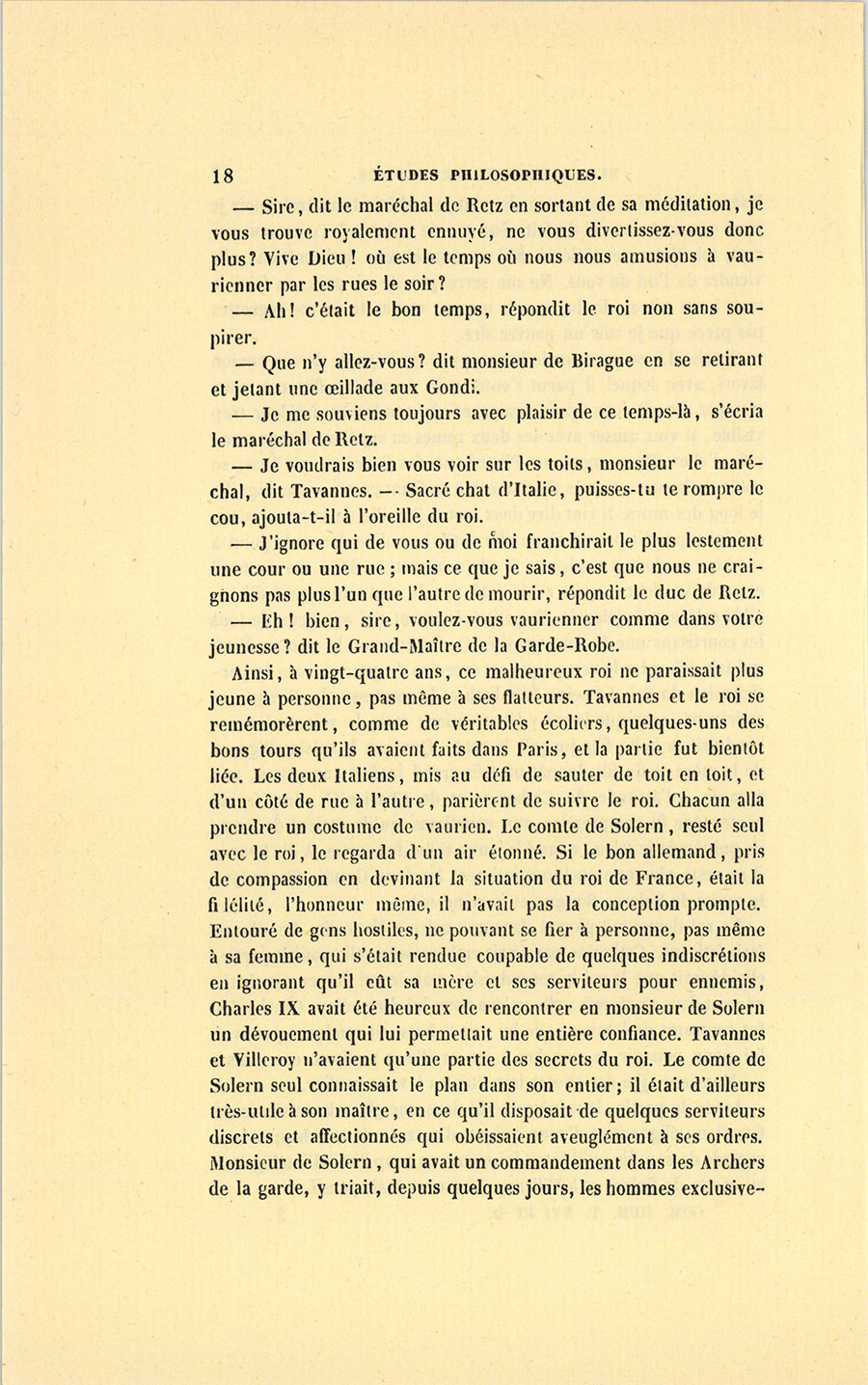 Cet entassement des familles, des17 serviteurs et des apprentis, le peu d’espace que chacun tenait à l’intérieur où les apprentis couchaient tous dans une grande chambre sous les toits, explique et l’énorme population de Paris alors agglomérée sur le dixième du terrain de la ville actuelle, et tous les détails bizarres de la vie privée au Moyen-âge, et les ruses d’amour qui, n’en déplaise aux historiens sérieux, ne se retrouvent que dans les conteurs, et qui sans eux eussent été perdus. À cette époque, un très-grand seigneur, comme l’amiral de Coligny, par exemple, occupait trois chambres dans Paris, et sa suite était dans une hôtellerie voisine. Il n’y avait pas alors cinquante hôtels dans Paris, c’est-à-dire, cinquante palais appartenant à des princes souverains ou à de grands vassaux dont l’existence était supérieure à celle des plus grands souverains allemands, tels que le duc de Bavière ou l’Électeur de Saxe.