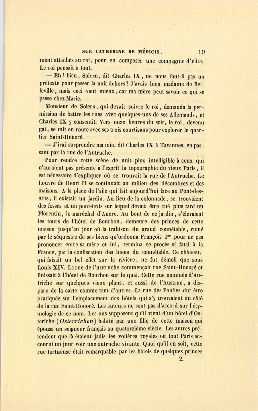Les reines de France, devenues veuves, devaient rester dans la chambre du roi pendant quarante jours, sans voir d’autre clarté que celle des cierges ; elles n’en sortaient qu’après l’enterrement du roi. Cette coutume inviolable contrariait fort Catherine qui craignit les brigues, elle trouva moyen de s’en dispenser13. Voici comment. Le cardinal de Lorraine sortant un jour (dans ce temps-là ! dans ce moment !) de grand matin de chez la Belle Romaine, une célèbre courtisane du temps de Henri II, qui demeurait rue Culture-Sainte-Catherine, fut maltraité par une troupe de libertins. « De quoi Sa Sainteté très-étonnée, » dit Henri Estienne, fit entendre que les hérétiques lui dressaient des embûches ; et pour ce fait, la cour alla de Paris à Saint-Germain. La reine ne voulut pas abandonner le roi son fils, et s’y transporta.