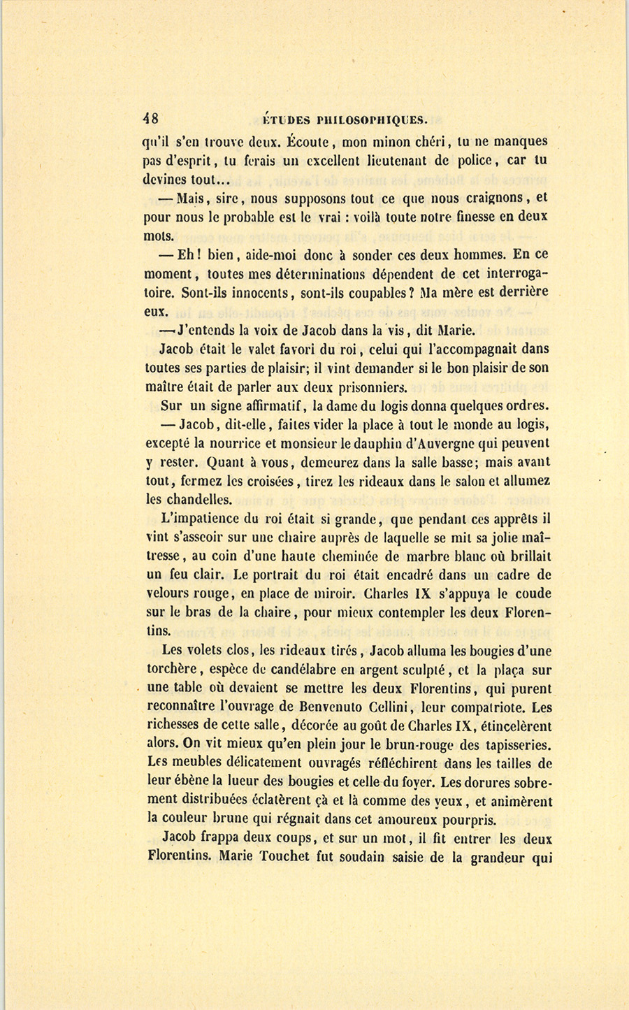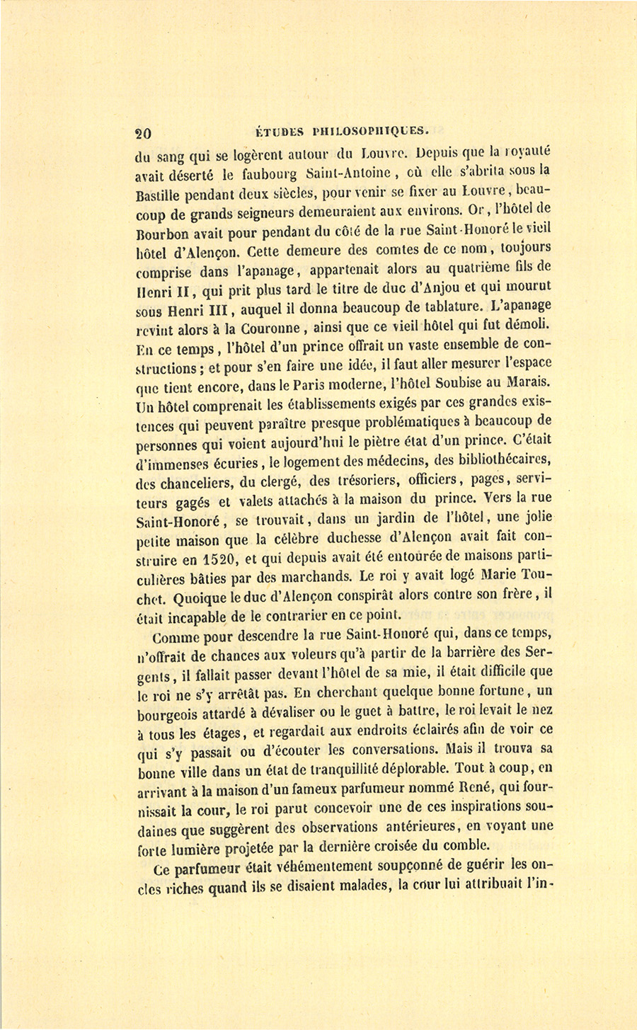 Peu de personnes aujourd’hui savent combien étaient naïves les habitations des bourgeois de Paris au quatorzième siècle, et combien simple était leur vie. Peut-être cette simplicité d’action et de pensée a-t-elle été la cause des grandeurs de cette vieille bourgeoisie, qui fut, certes, grande, libre et noble, plus peut-être que la bourgeoisie d’aujourd’hui ; son histoire est à faire, elle demande et attend un homme de génie. Inspirée par l’incident peu connu qui forme le fond de cette Étude et qui sera l’un des plus remarquables de l’histoire de la bourgeoisie, cette réflexion arrivera sans doute sur les lèvres de tout le monde, après ce récit. Est-ce la première fois qu’en histoire la conclusion aura précédé les faits ?