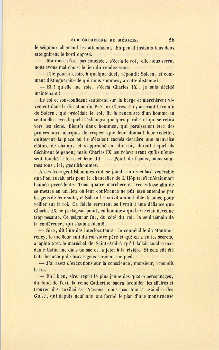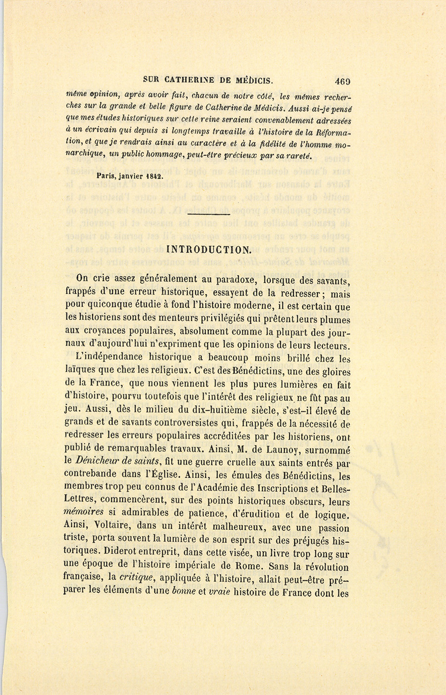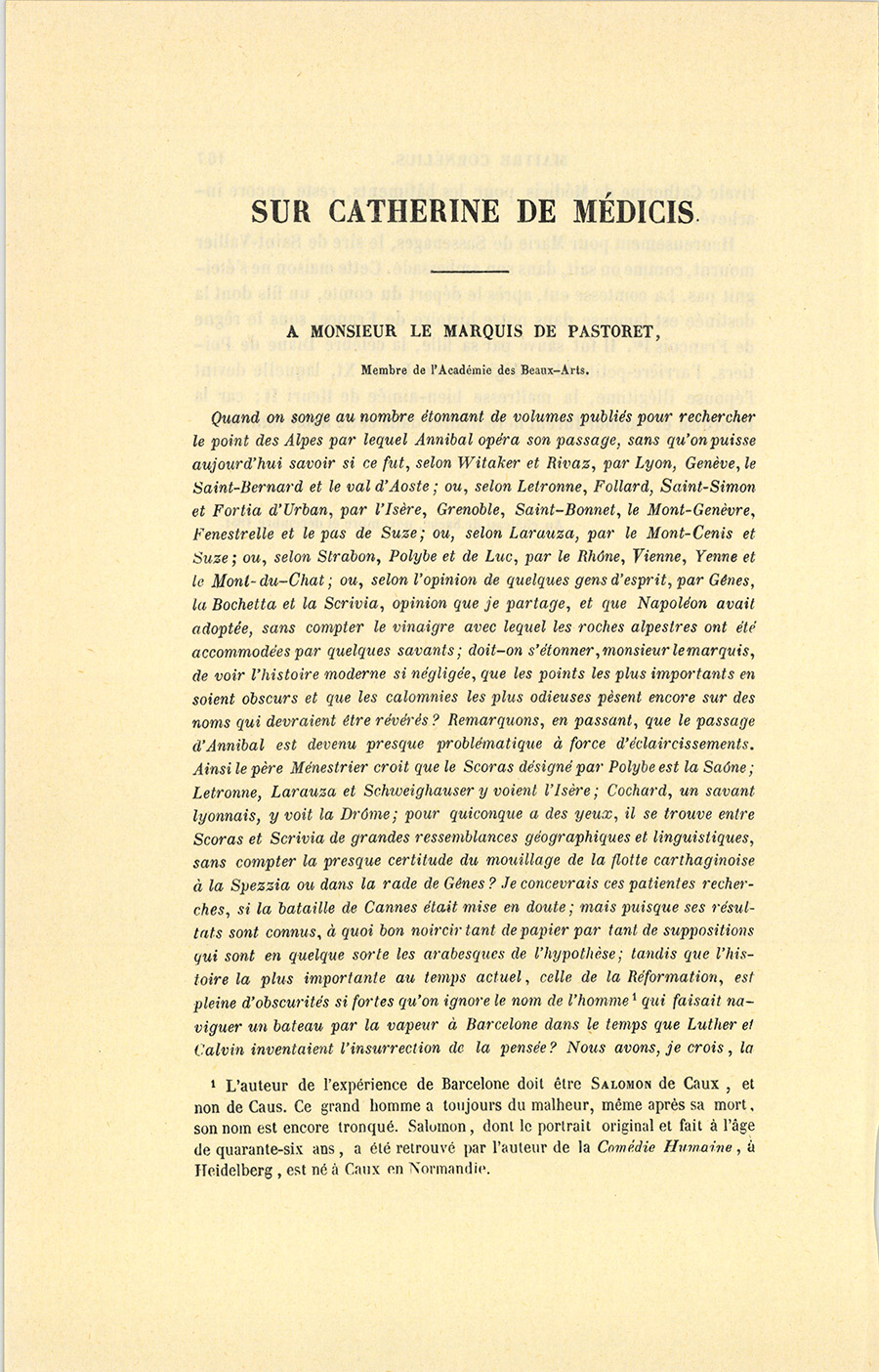 Quand on songe au nombre étonnant de volumes publiés pour rechercher le point des Alpes par lequel Annibal opéra son passage, sans qu’on puisse aujourd’hui savoir si ce fut, selon Witaker et Rivaz, par Lyon, Genève, le Saint-Bernard et le val d’Aoste ; ou, selon Letronne, Follard, Saint-Simon et Fortia d’Urban, par l’Isère, Grenoble, Saint-Bonnet, le Mont-Genèvre, Fenestrelle et le pas de Suze ; ou, selon Larauza, par le Mont-Cenis et Suze ; ou, selon Strabon, Polybe et de Luc, par le Rhône, Vienne, Yenne et le Mont-du-Chat ; ou, selon l’opinion de quelques gens d’esprit, par Gênes, la Bochetta et la Scrivia, opinion que je partage, et que Napoléon avait adoptée, sans compter le vinaigre avec lequel les roches alpestres ont été accommodées par quelques savants ; doit-on s’étonner, monsieur le marquis, de voir l’histoire moderne si négligée, que les points les plus importants en soient obscurs et que les calomnies les plus odieuses pèsent encore sur des noms qui devraient être révérés ? Remarquons, en passant, que le passage d’Annibal est devenu presque problématique à force d’éclaircissements. Ainsi le père Ménestrier croit que le Scoras désigné par Polybe est la Saône ; Letronne, Larauza et Schweighauser y voient l’Isère ; Cochard, un savant lyonnais, y voit la Drôme ; pour quiconque a des yeux, il se trouve entre Scoras et Scrivia de grandes ressemblances géographiques et linguistiques, sans compter la presque certitude du mouillage de la flotte carthaginoise à la Spezzia ou dans la rade de Gênes ? Je concevrais ces patientes recherches, si la bataille de Cannes était mise en doute ; mais puisque ses résultats sont connus, à quoi bon noircir tant de papier par tant de suppositions qui sont en quelque sorte les arabesques de l’hypothèse ; tandis que l’histoire la plus importante au temps actuel, celle de la Réformation, est pleine d’obscurités si fortes qu’on ignore le nom de l’homme1 qui faisait naviguer un bateau par la vapeur à Barcelone dans le temps que Luther et Calvin inventaient l’insurrection de la pensée ? Nous avons, je crois, la {p. 469} même opinion, après avoir fait, chacun de notre côté, les mêmes recherches sur la grande et belle figure de Catherine de Médicis. Aussi ai-je pensé que mes études historiques sur cette reine seraient convenablement adressées à un écrivain qui depuis si longtemps travaille à l’histoire de la Réformation, et que je rendrais ainsi au caractère et à la fidélité de l’homme monarchique, un public hommage, peut-être précieux par sa rareté.