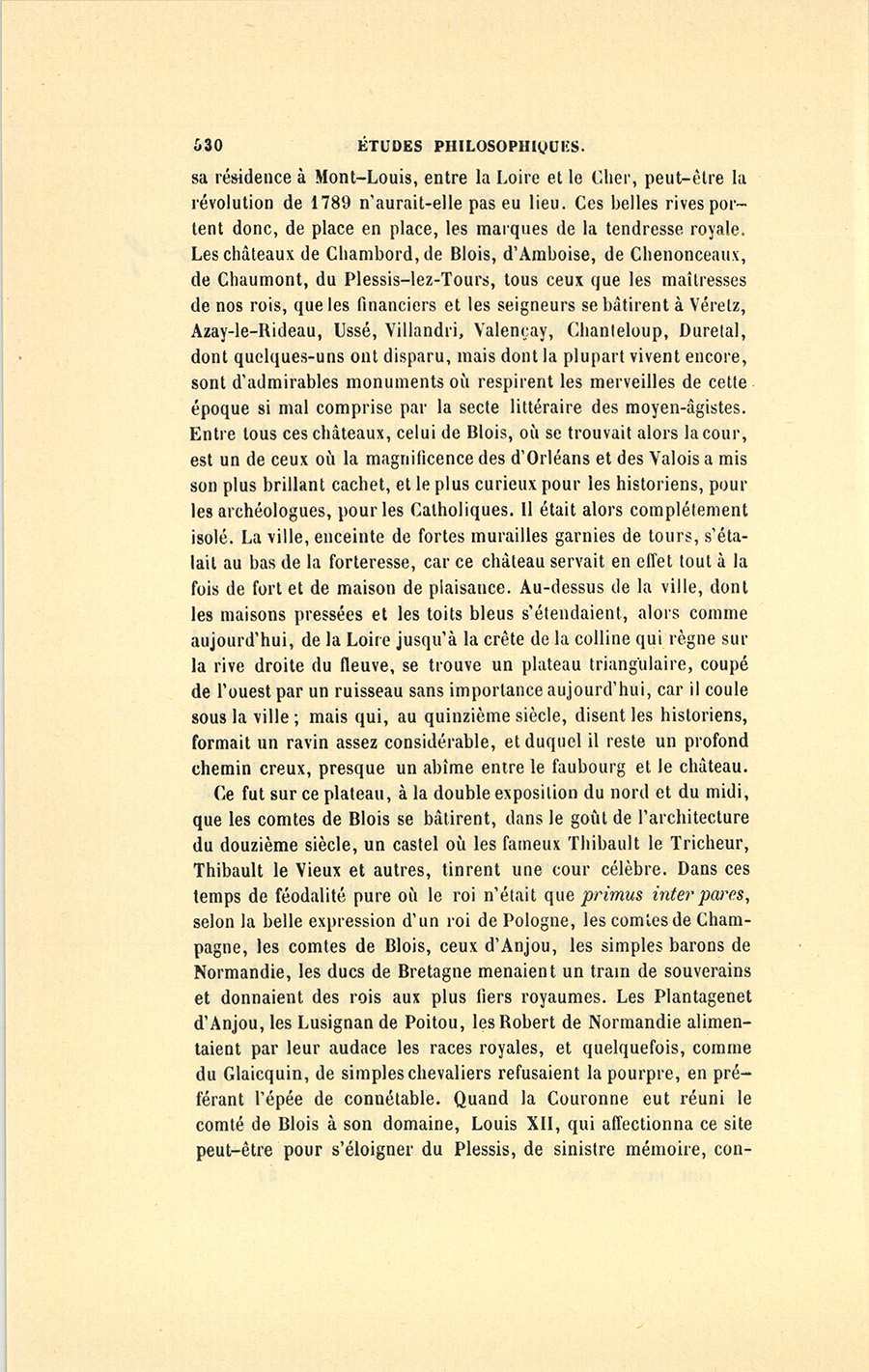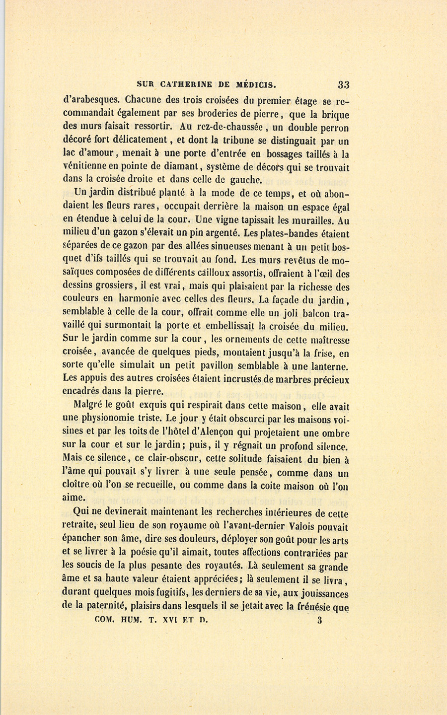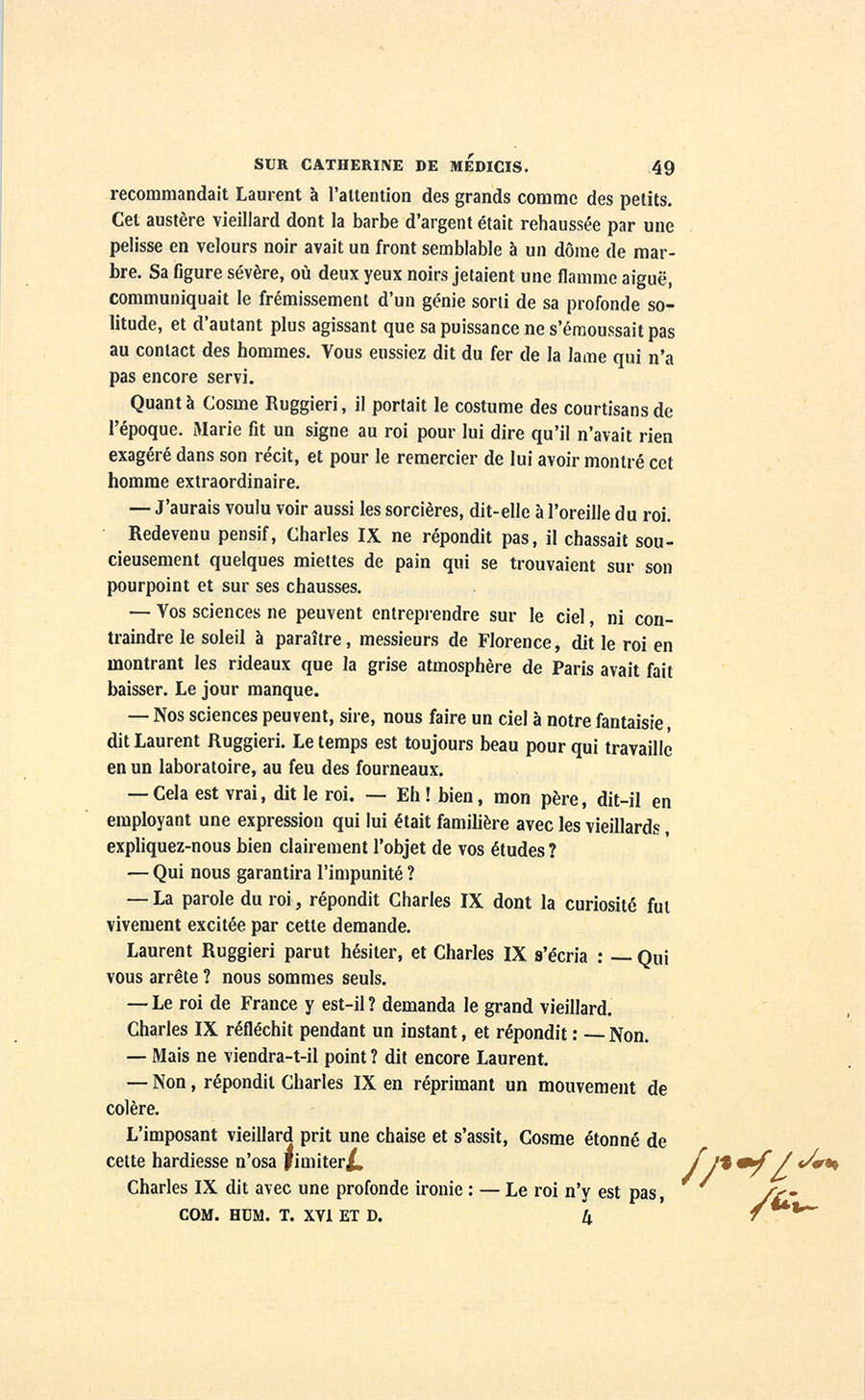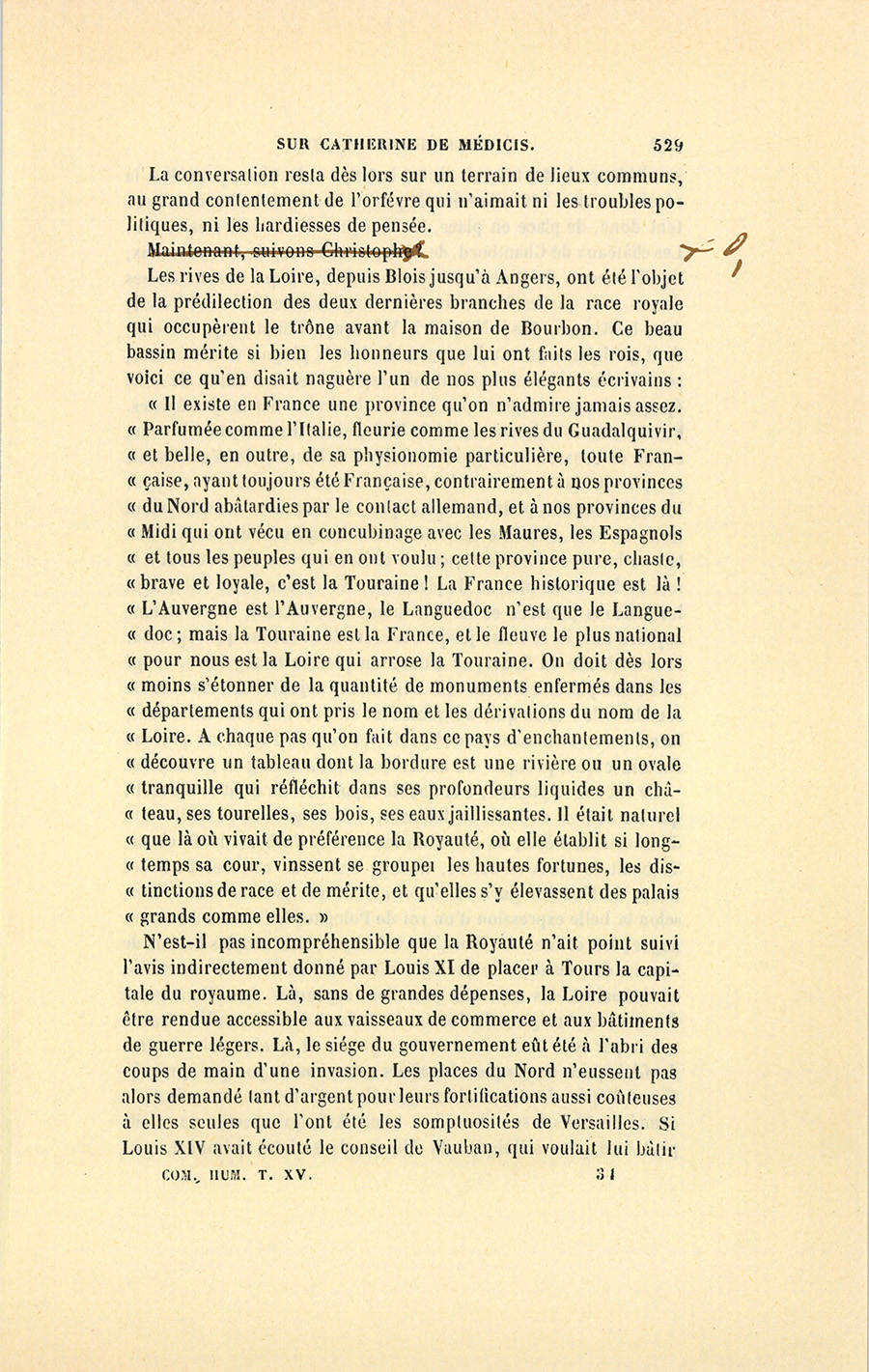 Quand on songe au nombre étonnant de volumes publiés pour rechercher le point des Alpes par lequel Annibal opéra son passage, sans qu’on puisse aujourd’hui savoir si ce fut, selon Witaker et Rivaz, par Lyon, Genève, le Saint-Bernard et le val d’Aoste ; ou, selon Letronne, Follard, Saint-Simon et Fortia d’Urban, par l’Isère, Grenoble, Saint-Bonnet, le Mont-Genèvre, Fenestrelle et le pas de Suze ; ou, selon Larauza, par le Mont-Cenis et Suze ; ou, selon Strabon, Polybe et de Luc, par le Rhône, Vienne, Yenne et le Mont-du-Chat ; ou, selon l’opinion de quelques gens d’esprit, par Gênes, la Bochetta et la Scrivia, opinion que je partage, et que Napoléon avait adoptée, sans compter le vinaigre avec lequel les roches alpestres ont été accommodées par quelques savants ; doit-on s’étonner, monsieur le marquis, de voir l’histoire moderne si négligée, que les points les plus importants en soient obscurs et que les calomnies les plus odieuses pèsent encore sur des noms qui devraient être révérés ? Remarquons, en passant, que le passage d’Annibal est devenu presque problématique à force d’éclaircissements. Ainsi le père Ménestrier croit que le Scoras désigné par Polybe est la Saône ; Letronne, Larauza et Schweighauser y voient l’Isère ; Cochard, un savant lyonnais, y voit la Drôme ; pour quiconque a des yeux, il se trouve entre Scoras et Scrivia de grandes ressemblances géographiques et linguistiques, sans compter la presque certitude du mouillage de la flotte carthaginoise à la Spezzia ou dans la rade de Gênes ? Je concevrais ces patientes recherches, si la bataille de Cannes était mise en doute ; mais puisque ses résultats sont connus, à quoi bon noircir tant de papier par tant de suppositions qui sont en quelque sorte les arabesques de l’hypothèse ; tandis que l’histoire la plus importante au temps actuel, celle de la Réformation, est pleine d’obscurités si fortes qu’on ignore le nom de l’homme1 qui faisait naviguer un bateau par la vapeur à Barcelone dans le temps que Luther et Calvin inventaient l’insurrection de la pensée ? Nous avons, je crois, la {p. 469} même opinion, après avoir fait, chacun de notre côté, les mêmes recherches sur la grande et belle figure de Catherine de Médicis. Aussi ai-je pensé que mes études historiques sur cette reine seraient convenablement adressées à un écrivain qui depuis si longtemps travaille à l’histoire de la Réformation, et que je rendrais ainsi au caractère et à la fidélité de l’homme monarchique, un public hommage, peut-être précieux par sa rareté.