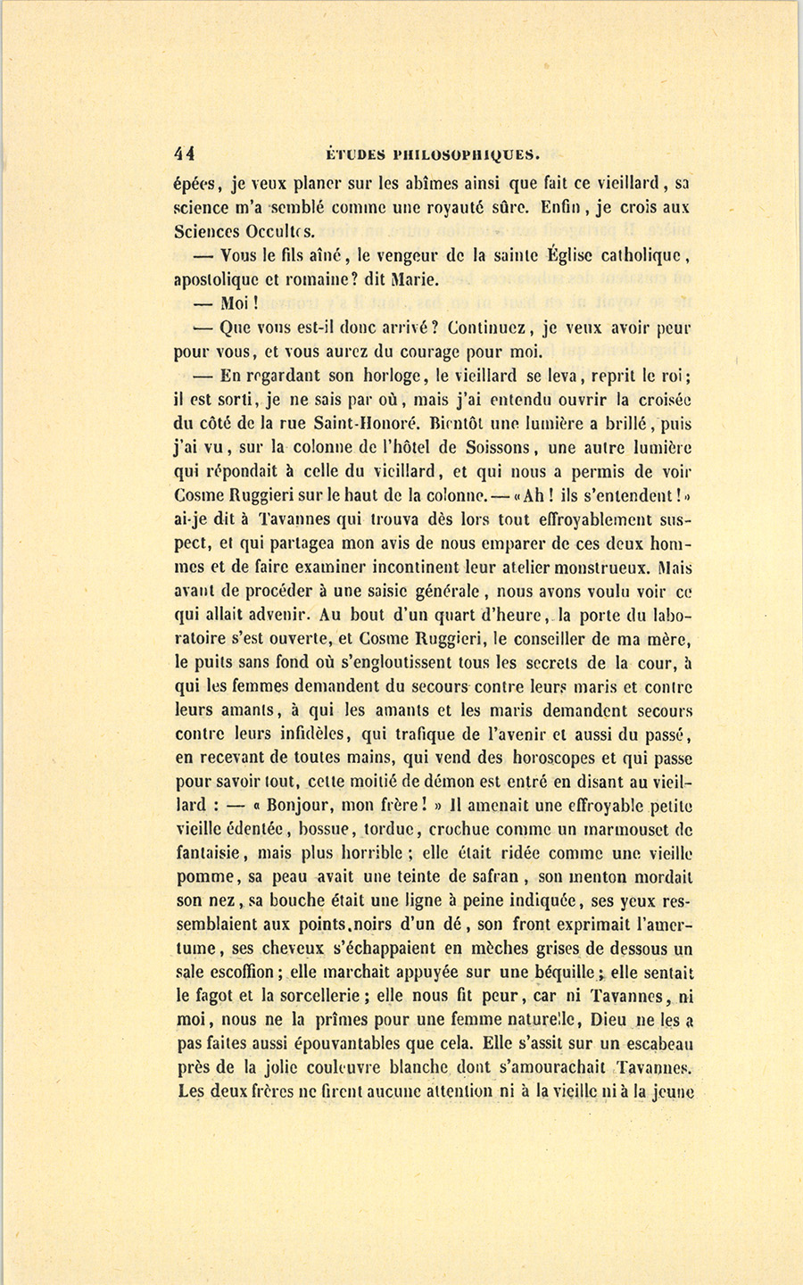 – Je ne sais, reprit-il, si la figure évoquée me suivit en se rendant invisible ; mais aussitôt que ma tête reposa sur mon lit, je vis la grande ombre de Catherine se lever devant moi. Je me sentis, instinctivement, dans une sphère lumineuse, car mes yeux attachés sur la reine par une insupportable fixité ne virent qu’elle. Tout à coup elle se pencha vers moi…