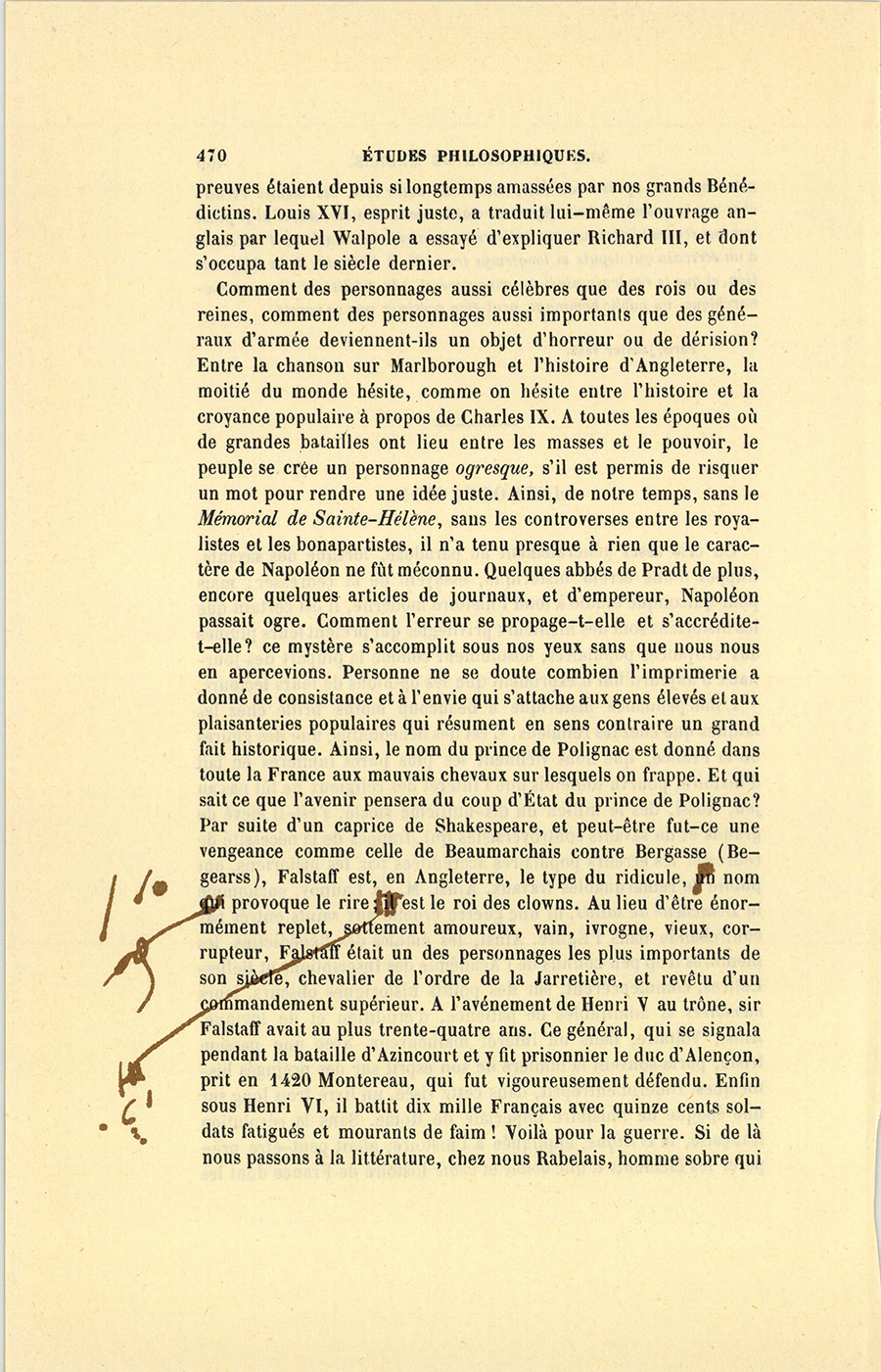 Comment des personnages aussi célèbres que des rois ou des reines, comment des personnages aussi importants que des généraux d’armée deviennent-ils un objet d’horreur ou de dérision ? Entre la chanson sur Marlborough et l’histoire d’Angleterre, la moitié du monde hésite, comme on hésite entre l’histoire et la croyance populaire à propos de Charles IX. À toutes les époques où de grandes batailles ont lieu entre les masses et le pouvoir, le peuple se crée un personnage ogresque, s’il est permis de risquer un mot pour rendre une idée juste. Ainsi, de notre temps, sans le Mémorial de Sainte-Hélène, sans les controverses entre les royalistes et les bonapartistes, il n’a tenu presque à rien que le caractère de Napoléon ne fût méconnu. Quelques abbés de Pradt de plus, encore quelques articles de journaux, et d’empereur, Napoléon passait ogre. Comment l’erreur se propage-t-elle et s’accrédite-t-elle ? ce mystère s’accomplit sous nos yeux sans que nous nous en apercevions. Personne ne se doute combien l’imprimerie a donné de consistance et à l’envie qui s’attache aux gens élevés et aux plaisanteries populaires qui résument en sens contraire un grand fait historique. Ainsi, le nom du prince de Polignac est donné dans toute la France aux mauvais chevaux sur lesquels on frappe. Et qui sait ce que l’avenir pensera du coup d’État du prince de Polignac ? Par suite d’un caprice de Shakespeare, et peut-être fut-ce une vengeance comme celle de Beaumarchais contre Bergasse (Begearss), Falstaff est, en Angleterre, le type du ridicule, son nom provoque le rire. C’est le roi des clowns. Au lieu d’être énormément replet, sottement amoureux, vain, ivrogne, vieux, corrupteur, Falstaff était un des personnages les plus importants de son siècle, chevalier de l’ordre de la Jarretière, et revêtu d’un commandement supérieur. À l’avénement de Henri V au trône, sir Falstaff avait au plus trente-quatre ans. Ce général, qui se signala pendant la bataille d’Azincourt et y fit prisonnier le duc d’Alençon, prit en 1420 Montereau, qui fut vigoureusement défendu. Enfin sous Henri VI, il battit dix mille Français avec quinze cents soldats fatigués et mourants de faim ! Voilà pour la guerre. Si de là nous passons à la littérature, chez nous Rabelais, homme sobre qui {p. 471} ne buvait que de l’eau, passe pour un amateur de bonne chère, pour un buveur déterminé. Mille contes ridicules ont été faits sur l’auteur d’un des plus beaux livres de la littérature française, le Pantagruel. L’Arétin, l’ami de Titien et le Voltaire de son siècle, a, de nos jours, un renom en complète opposition avec ses œuvres, avec son caractère, et que lui vaut une débauche d’esprit en harmonie avec les écrits de ce siècle, où le drôlatique était en honneur, où les reines et les cardinaux écrivaient des contes, dits aujourd’hui licencieux. On pourrait multiplier à l’infini les exemples de ce genre. En France, et dans la partie la plus grave de l’histoire moderne, aucune femme, si ce n’est Brunehault ou Frédégonde, n’a plus souffert des erreurs populaires que Catherine de Médicis ; tandis que Marie de Médicis, dont toutes les actions ont été préjudiciables à la France, échappe à la honte qui devrait couvrir son nom. Marie a dissipé les trésors amassés par Henri IV, elle ne s’est jamais lavée du reproche d’avoir connu l’assassinat du roi, elle a eu pour intime d’Épernon qui n’a point paré le coup de Ravaillac et qui connaissait cet homme de longue main ; elle a forcé son fils de la bannir de France, où elle encourageait les révoltes de son autre fils Gaston ; enfin, la victoire de Richelieu sur elle, à la journée des Dupes, ne fut due qu’à la découverte que le cardinal fit à Louis XIII des documents tenus secrets sur la mort d’Henri IV. Catherine de Médicis, au contraire, a sauvé la couronne de France ; elle a maintenu l’autorité royale dans des circonstances au milieu desquelles plus d’un grand prince aurait succombé. Ayant en tête des factieux et des ambitions comme celles des Guise et de la maison de Bourbon, des hommes comme les deux cardinaux de Lorraine et comme les deux Balafré, les deux princes de Condé, la reine Jeanne d’Albret, Henri IV, le connétable de Montmorency, Calvin, les Coligny, Théodore de Bèze, il lui a fallu déployer les plus rares qualités, les plus précieux dons de l’homme d’État, sous le feu des railleries de la presse calviniste. Voilà des faits qui, certes, sont incontestables. Aussi, pour qui creuse l’histoire du seizième siècle en France, la figure de Catherine de Médicis apparaît-elle comme celle d’un grand roi. Les calomnies une fois dissipées par les faits péniblement retrouvés à travers les contradictions des pamphlets et les fausses anecdotes, tout s’explique à la gloire de cette femme extraordinaire, qui n’eut aucune des faiblesses de son sexe, qui vécut chaste au milieu des amours de la cour la plus galante de {p. 472} l’Europe, et qui sut, malgré sa pénurie d’argent, bâtir d’admirables monuments, comme pour réparer les pertes que causaient les démolitions des Calvinistes qui firent à l’art autant de blessures qu’au corps politique. Serrée entre des princes qui se disaient les héritiers de Charlemagne, et une factieuse branche cadette qui voulait enterrer la trahison du connétable de Bourbon sous le trône, Catherine, obligée de combattre une hérésie prête à dévorer la monarchie, sans amis, apercevant la trahison dans les chefs du parti catholique, et la république dans le parti calviniste, a employé l’arme la plus dangereuse, mais la plus certaine de la politique, l’adresse ! Elle résolut de jouer successivement le parti qui voulait la ruine de la maison de Valois, les Bourbons qui voulaient la couronne, et les Réformés, les Radicaux de ce temps-là qui rêvaient