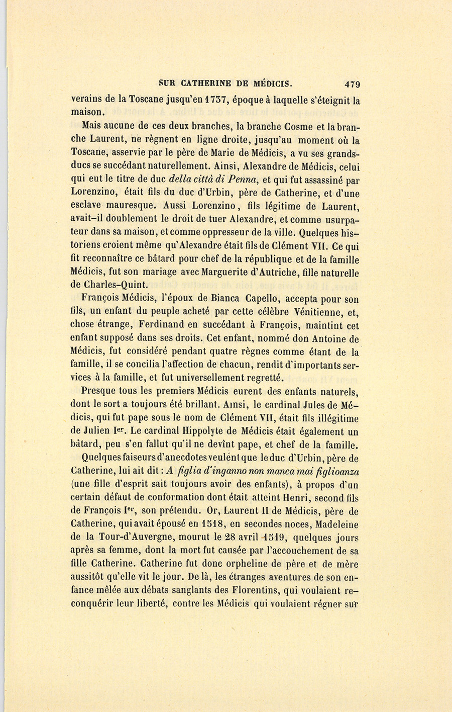 Quelques faiseurs d’anecdotes veulent que le duc d’Urbin, père de Catherine, lui ait dit : A figlia d’inganno non manca mai figliolanza5 (une fille d’esprit sait toujours avoir des enfants), à propos d’un certain défaut de conformation dont était atteint Henri, second fils de François Ier, son prétendu. Or, Laurent II de Médicis, père de Catherine, qui avait épousé en 1518, en secondes noces, Madeleine de la Tour-d’Auvergne, mourut le 28 avril 1519, quelques jours après sa femme, dont la mort fut causée par l’accouchement de sa fille Catherine. Catherine fut donc orpheline de père et de mère aussitôt qu’elle vit le jour. De là, les étranges aventures de son enfance mêlée aux débats sanglants des Florentins, qui voulaient reconquérir leur liberté, contre les Médicis qui voulaient régner sur {p. 480} Florence et se conduisaient avec tant de circonspection, que le père de Catherine portait le titre de duc d’Urbin. À la mort de Laurent, père de Catherine, le chef légitime de la maison de Médicis, était le pape Léon X, qui fit gouverner Florence par ce fils illégitime de Julien, Jules de Médicis, alors cardinal. Léon X était le grand-oncle de Catherine, et ce cardinal Jules, qui fut Clément VII, n’était son oncle que de la main gauche. C’est ce qui fit si plaisamment nommer ce pape par Brantôme, un oncle en Notre-Dame. Ce fut pendant le siége de Florence, entrepris par les Médicis pour y rentrer, que le parti républicain, non content d’avoir enfermé Catherine, âgée de neuf ans, dans un couvent après l’avoir dépouillée de tous ses biens, voulut l’exposer entre deux créneaux au feu de l’artillerie, sur la proposition d’un nommé Baptiste Cei. Bernard Castiglione6 alla plus loin dans un conseil tenu pour aviser à terminer les affaires, il fut d’avis que, loin de remettre Catherine au pape qui la redemandait, il fallait la livrer aux soldats pour la déshonorer. On voit que toutes les révolutions populaires se ressemblent. La politique de Catherine qui favorisait tant le pouvoir royal, pouvait avoir été conseillée par de telles scènes, qu’une Italienne de neuf ans ne pouvait pas ignorer.
