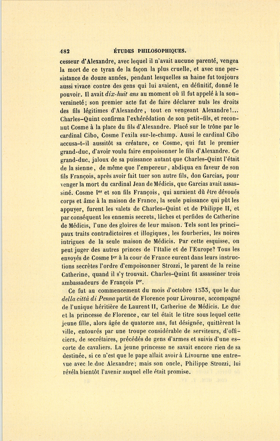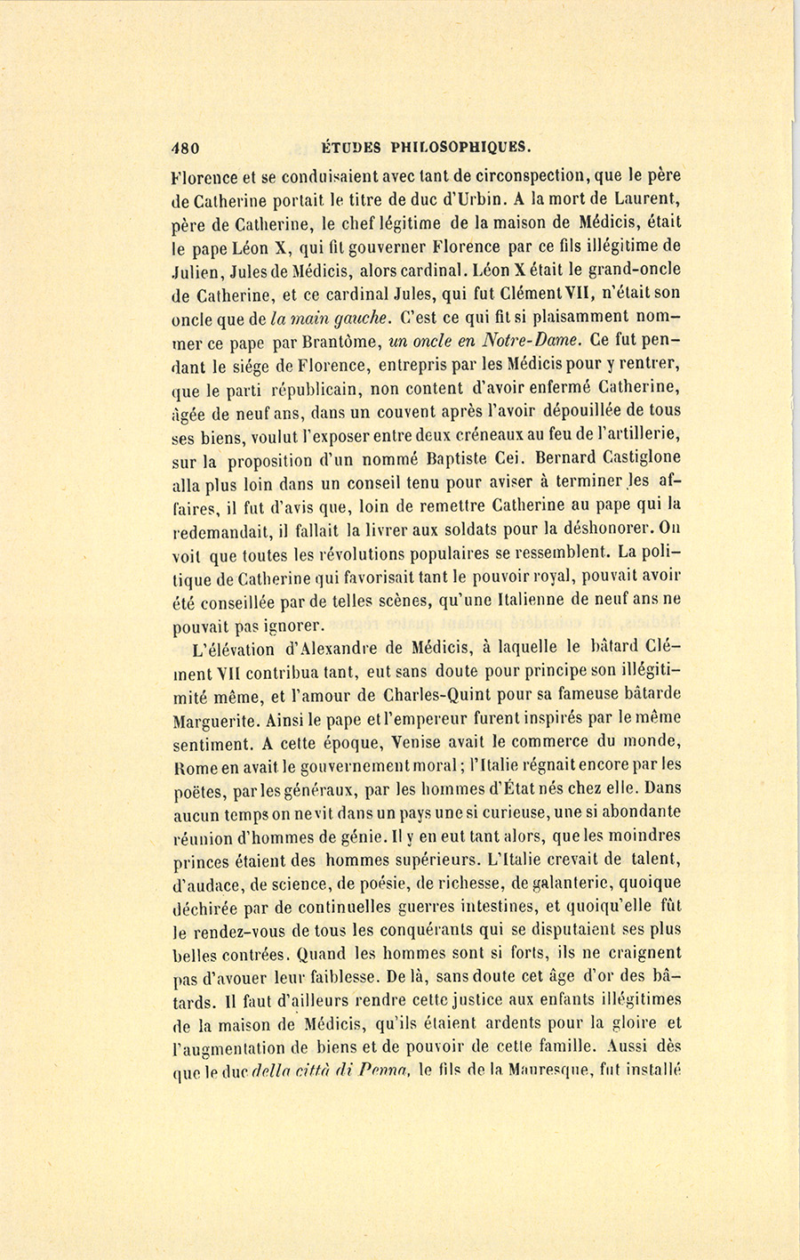 Mais aucune de ces deux branches, la branche Cosme et la branche Laurent, ne règnent en ligne droite, jusqu’au moment où la Toscane, asservie par le père de Marie de Médicis, a vu ses grands-ducs se succédant naturellement. Ainsi, Alexandre de Médicis, celui qui eut le titre de duc della città di Penna, et qui fut assassiné par Lorenzino, était fils du duc d’Urbin, père de Catherine, et d’une esclave mauresque. Aussi Lorenzino, fils légitime de Laurent, avait-il doublement le droit de tuer Alexandre, et comme usurpateur dans sa maison, et comme oppresseur de la ville. Quelques historiens croient même qu’Alexandre était fils de Clément VII. Ce qui fit reconnaître ce bâtard pour chef de la république et de la famille Médicis, fut son mariage avec Marguerite d’Autriche, fille naturelle de Charles-Quint.