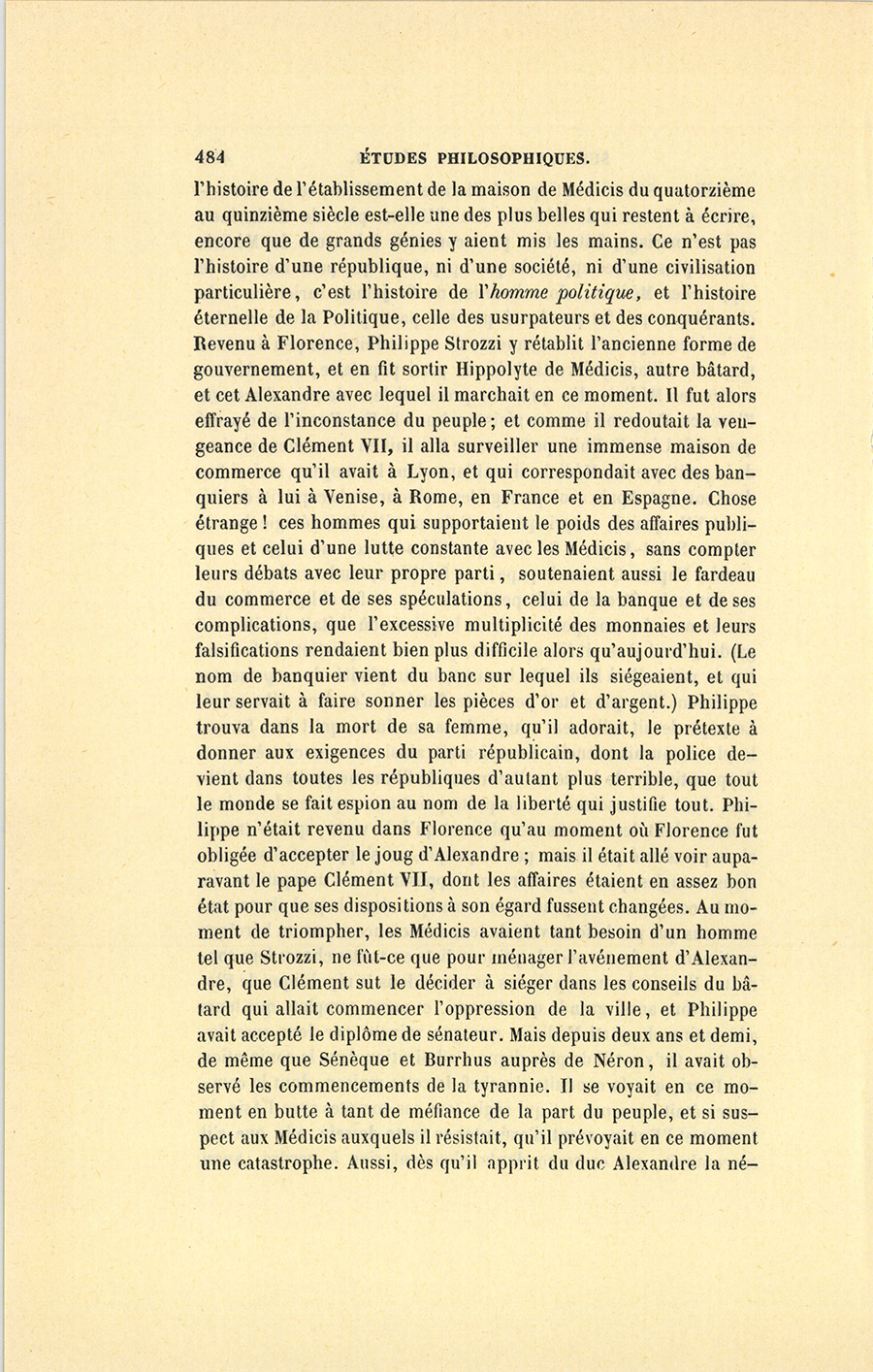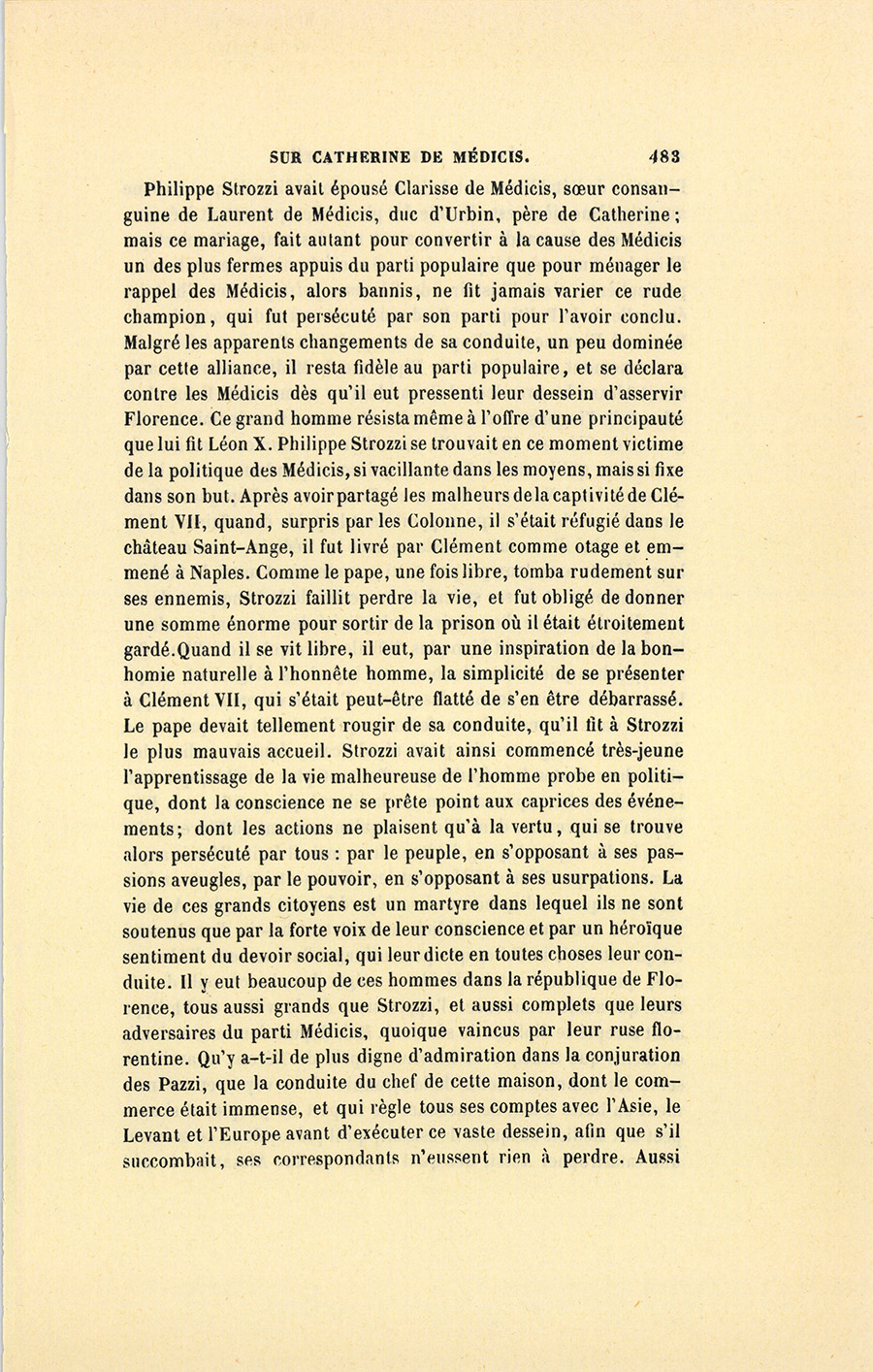 {p. 483} Philippe Strozzi avait épousé Clarisse de Médicis, sœur consanguine de Laurent de Médicis, duc d’Urbin, père de Catherine ; mais ce mariage, fait autant pour convertir à la cause des Médicis un des plus fermes appuis du parti populaire que pour ménager le rappel des Médicis, alors bannis, ne fit jamais varier ce rude champion, qui fut persécuté par son parti pour l’avoir conclu. Malgré les apparents changements de sa conduite, un peu dominée par cette alliance, il resta fidèle au parti populaire, et se déclara contre les Médicis dès qu’il eut pressenti leur dessein d’asservir Florence. Ce grand homme résista même à l’offre d’une principauté que lui fit Léon X. Philippe Strozzi se trouvait en ce moment victime de la politique des Médicis, si vacillante dans les moyens, mais si fixe dans son but. Après avoir partagé les malheurs de la captivité de Clément VII, quand, surpris par les Colonne, il s’était réfugié dans le château Saint-Ange, il fut livré par Clément comme otage et emmené à Naples. Comme le pape, une fois libre, tomba rudement sur ses ennemis, Strozzi faillit perdre la vie, et fut obligé de donner une somme énorme pour sortir de la prison où il était étroitement gardé. Quand il se vit libre, il eut, par une inspiration de la bonhomie naturelle à l’honnête homme, la simplicité de se présenter à Clément VII, qui s’était peut-être flatté de s’en être débarrassé. Le pape devait tellement rougir de sa conduite, qu’il fit à Strozzi le plus mauvais accueil. Strozzi avait ainsi commencé très-jeune l’apprentissage de la vie malheureuse de l’homme probe en politique, dont la conscience ne se prête point aux caprices des événements ; dont les actions ne plaisent qu’à la vertu, qui se trouve alors persécuté par tous : par le peuple, en s’opposant à ses passions aveugles, par le pouvoir, en s’opposant à ses usurpations. La vie de ces grands citoyens est un martyre dans lequel ils ne sont soutenus que par la forte voix de leur conscience et par un héroïque sentiment du devoir social, qui leur dicte en toutes choses leur conduite. Il y eut beaucoup de ces hommes dans la république de Florence, tous aussi grands que Strozzi, et aussi complets que leurs adversaires du parti Médicis, quoique vaincus par leur ruse florentine. Qu’y a-t-il de plus digne d’admiration dans la conjuration des Pazzi, que la conduite du chef de cette maison, dont le commerce était immense, et qui règle tous ses comptes avec l’Asie, le Levant et l’Europe avant d’exécuter ce vaste dessein, afin que s’il succombait, ses correspondants n’eussent rien à perdre. Aussi {p. 484} l’histoire de l’établissement de la maison de Médicis du quatorzième au quinzième siècle est-elle une des plus belles qui restent à écrire, encore que de grands génies y aient mis les mains. Ce n’est pas l’histoire d’une république, ni d’une société, ni d’une civilisation particulière, c’est l’histoire de l’homme politique, et l’histoire éternelle de la Politique, celle des usurpateurs et des conquérants. Revenu à Florence, Philippe Strozzi y rétablit l’ancienne forme de gouvernement, et en fit sortir Hippolyte de Médicis, autre bâtard, et cet Alexandre avec lequel il marchait en ce moment. Il fut alors effrayé de l’inconstance du peuple ; et comme il redoutait la vengeance de Clément VII, il alla surveiller une immense maison de commerce qu’il avait à Lyon, et qui correspondait avec des banquiers à lui à Venise, à Rome, en France et en Espagne. Chose étrange ! ces hommes qui supportaient le poids des affaires publiques et celui d’une lutte constante avec les Médicis, sans compter leurs débats avec leur propre parti, soutenaient aussi le fardeau du commerce et de ses spéculations, celui de la banque et de ses complications, que l’excessive multiplicité des monnaies et leurs falsifications rendaient bien plus difficile alors qu’aujourd’hui. (Le nom de banquier vient du banc sur lequel ils siégeaient, et qui leur servait à faire sonner les pièces d’or et d’argent.) Philippe trouva dans la mort de sa femme, qu’il adorait, le prétexte à donner aux exigences du parti républicain, dont la police devient dans toutes les républiques d’autant plus terrible, que tout le monde se fait espion au nom de la liberté qui justifie tout. Philippe n’était revenu dans Florence qu’au moment où Florence fut obligée d’accepter le joug d’Alexandre ; mais il était allé voir auparavant le pape Clément VII, dont les affaires étaient en assez bon état pour que ses dispositions à son égard fussent changées. Au moment de triompher, les Médicis avaient tant besoin d’un homme tel que Strozzi, ne fût-ce que pour ménager l’avénement d’Alexandre, que Clément sut le décider à siéger dans les conseils du bâtard qui allait commencer l’oppression de la ville, et Philippe avait accepté le diplôme de sénateur. Mais depuis deux ans et demi, de même que Sénèque et Burrhus auprès de Néron, il avait observé les commencements de la tyrannie. Il se voyait en ce moment en butte à tant de méfiance de la part du peuple, et si suspect aux Médicis auxquels il résistait, qu’il prévoyait en ce moment une catastrophe. Aussi, dès qu’il apprit du duc Alexandre la {p. 485} négociation du mariage de Catherine avec un fils de France, dont la conclusion allait peut-être avoir lieu à Livourne, où les négociateurs s’étaient donné rendez-vous, forma-t-il le projet de passer en France et de s’attacher à la fortune de sa nièce, à laquelle il fallait un tuteur. Alexandre, enchanté de se débarrasser d’un homme si peu conciliant dans les affaires de Florence, appuya cette résolution qui lui épargnait un meurtre, et donna le conseil à Strozzi de se mettre à la tête de la maison de Catherine. En effet, pour éblouir la cour de France, les M