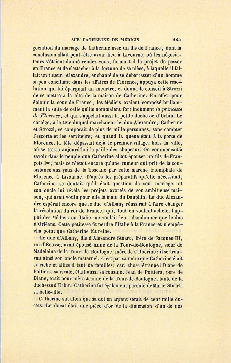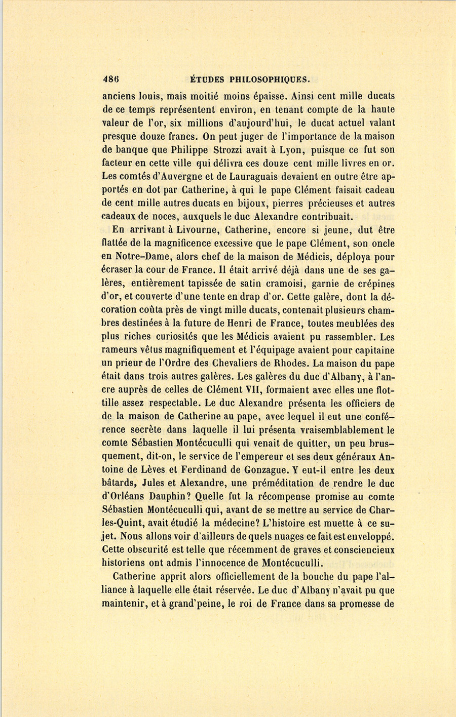 Catherine sut alors que sa dot en argent serait de cent mille ducats. Le ducat était une pièce d’or de la dimension d’un de nos {p. 486} anciens louis, mais moitié moins épaisse. Ainsi cent mille ducats de ce temps représentent environ, en tenant compte de la haute valeur de l’or, six millions d’aujourd’hui, le ducat actuel valant presque douze francs. On peut juger de l’importance de la maison de banque que Philippe Strozzi avait à Lyon, puisque ce fut son facteur en cette ville qui délivra ces douze cent mille livres en or. Les comtés d’Auvergne et de Lauraguais devaient en outre être apportés en dot par Catherine, à qui le pape Clément faisait cadeau de cent mille autres ducats en bijoux, pierres précieuses et autres cadeaux de noces, auxquels le duc Alexandre contribuait.