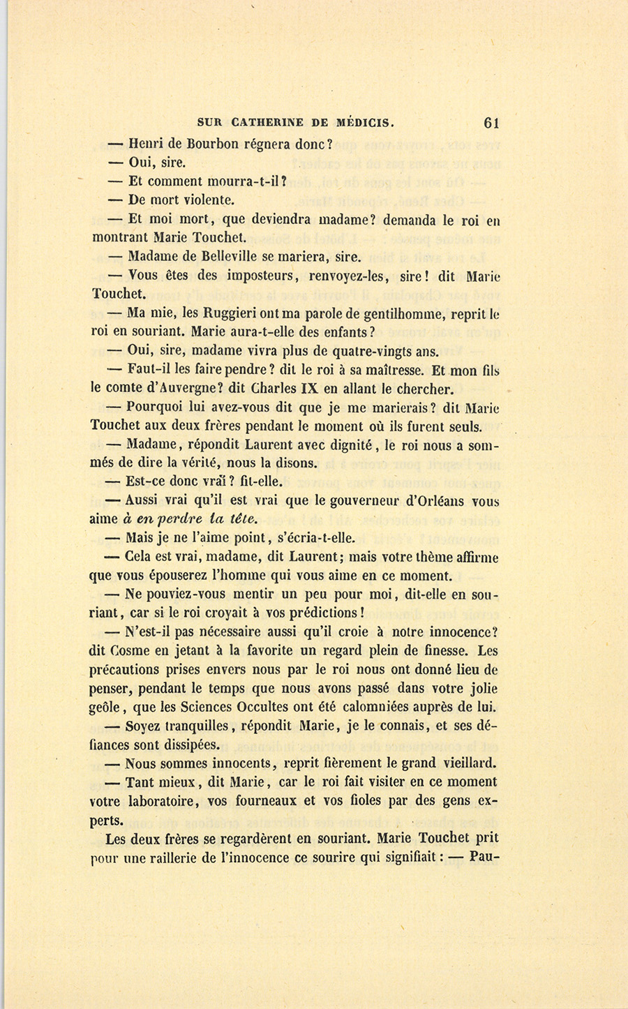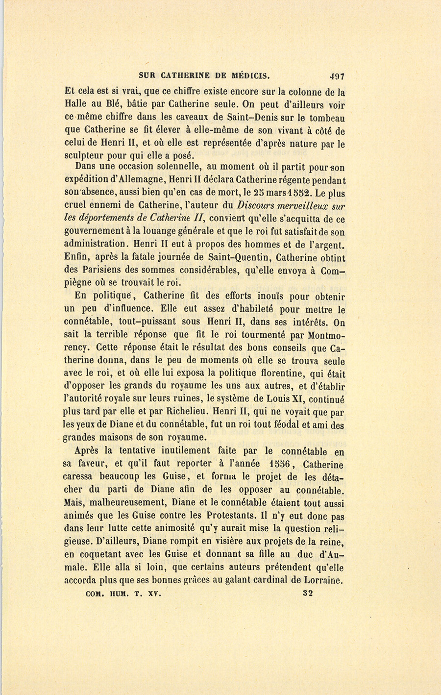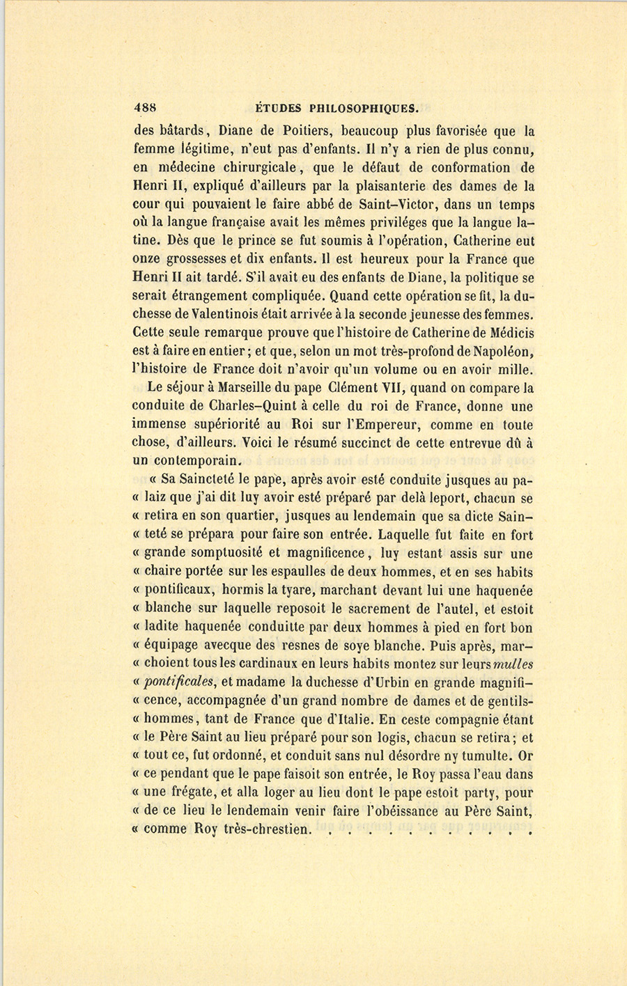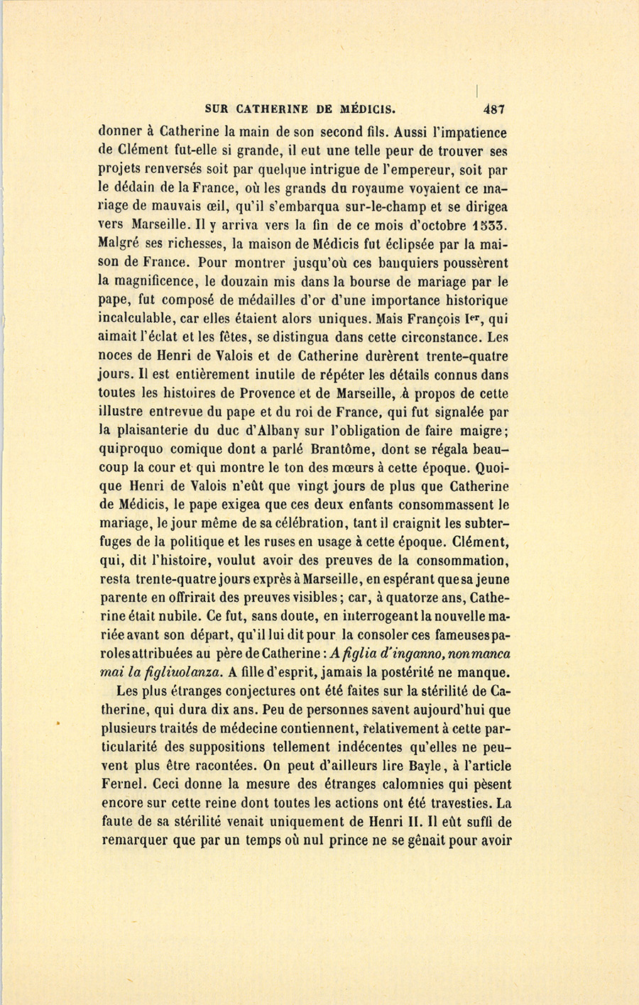 Les plus étranges conjectures ont été faites sur la stérilité de Catherine, qui dura dix ans. Peu de personnes savent aujourd’hui que plusieurs traités de médecine contiennent, relativement à cette particularité des suppositions tellement indécentes qu’elles ne peuvent plus être racontées. On peut d’ailleurs lire Bayle, à l’article Fernel. Ceci donne la mesure des étranges calomnies qui pèsent encore sur cette reine dont toutes les actions ont été travesties. La faute de sa stérilité venait uniquement de Henri II. Il eût suffi de remarquer que par un temps où nul prince ne se gênait pour avoir {p. 488} des bâtards, Diane de Poitiers, beaucoup plus favorisée que la femme légitime, n’eut pas d’enfants. Il n’y a rien de plus connu, en médecine chirurgicale, que le défaut de conformation de Henri II, expliqué d’ailleurs par la plaisanterie des dames de la cour qui pouvaient le faire abbé de Saint-Victor, dans un temps où la langue française avait les mêmes priviléges que la langue latine. Dès que le prince se fut soumis à l’opération, Catherine eut onze grossesses et dix enfants. Il est heureux pour la France que Henri II ait tardé. S’il avait eu des enfants de Diane, la politique se serait étrangement compliquée. Quand cette opération se fit, la duchesse de Valentinois était arrivée à la seconde jeunesse des femmes. Cette seule remarque prouve que l’histoire de Catherine de Médicis est à faire en entier ; et que, selon un mot très-profond de Napoléon, l’histoire de France doit n’avoir qu’un volume ou en avoir mille.