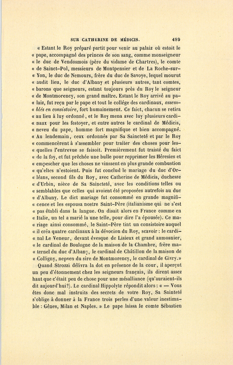 {p. 489} Estant le Roy préparé partit pour venir au palaiz où estoit le pape, accompagné des princes de son sang, comme monseigneur le duc de Vendosmois (père du vidame de Chartres), le comte de Sainct-Pol, messieurs de Montpensier et de La Roche-sur-Yon, le duc de Nemours, frère du duc de Savoye, lequel mourut audit lieu, le duc d’Albany et plusieurs autres, tant comtes, barons que seigneurs, estant toujours près du Roy le seigneur de Montmorency, son grand maître. Estant le Roy arrivé au palaiz, fut reçu par le pape et tout le collége des cardinaux, assemblés en consistoire, fort humainement. Ce faict, chacun se retira au lieu à luy ordonné, et le Roy mena avec luy plusieurs cardinaux pour les festoyer, et entre autres le cardinal de Médicis, neveu du pape, homme fort magnifique et bien accompagné. Au lendemain, ceux ordonnés par Sa Saincteté et par le Roy commencèrent à s’assembler pour traiter des choses pour lesquelles l’entrevue se faisoit. Premièrement fut traisté du faict de la foy, et fut prêchée une bulle pour repprimer les Héresies et empescher que les choses ne vinssent en plus grande combustion qu’elles n’estoient. Puis fut conclud le mariage du duc d’Orléans, second fils du Roy, avec Catherine de Médicis, duchesse d’Urbin, nièce de Sa Saincteté, avec les conditions telles ou semblables que celles qui avoient été proposées autrefois au duc d’Albany. Le dict mariage fut consommé en grande magnificence et les espousa nostre Saint-Père (italianisme qui ne s’est pas établi dans la langue. On disait alors en France comme en Italie, un tel a marié la une telle, pour dire l’a épousée). Ce mariage ainsi consommé, le Saint-Père tint un consistoire auquel il créa quatre cardinaux à la dévocion du Roy, scavoir : le cardinal Le Veneur, devant évesque de Lisieux et grand aumosnier, le cardinal de Boulogne de la maison de la Chambre, frère maternel du duc d’Albany, le cardinal de Châtillon de la maison de Colligny, nepveu du sire de Montmorency, le cardinal de Givry.