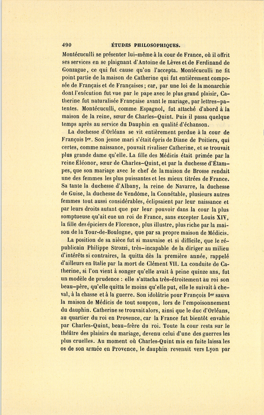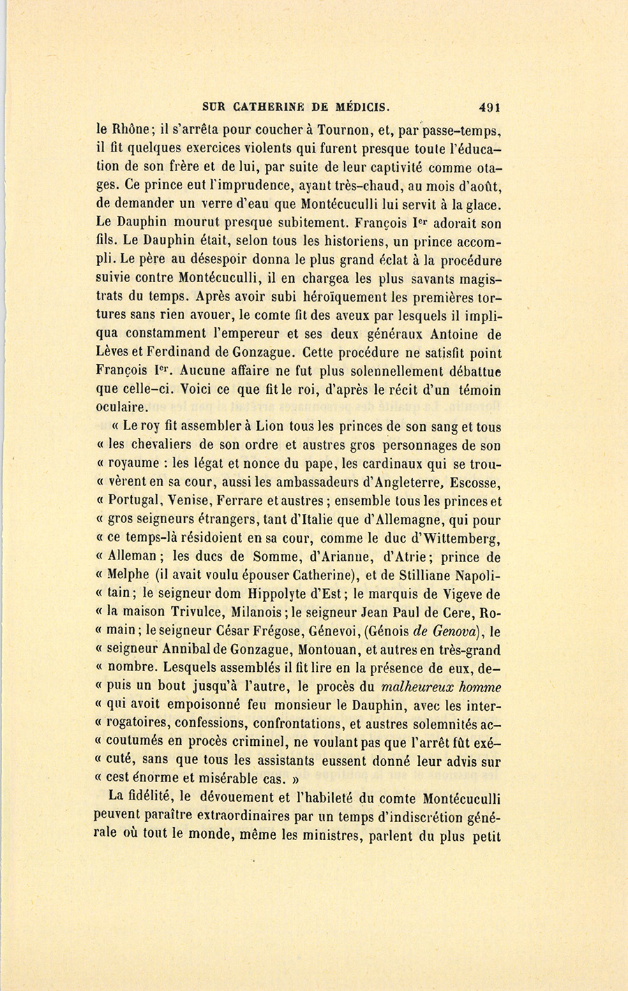 La position de sa nièce fut si mauvaise et si difficile, que le républicain Philippe Strozzi, très-incapable de la diriger au milieu d’intérêts si contraires, la quitta dès la première année, rappelé d’ailleurs en Italie par la mort de Clément VII. La conduite de Catherine, si l’on vient à songer qu’elle avait à peine quinze ans, fut un modèle de prudence : elle s’attacha très-étroitement au roi son beau-père, qu’elle quitta le moins qu’elle put, elle le suivait à cheval, à la chasse et à la guerre. Son idolâtrie pour François Ier sauva la maison de Médicis de tout soupçon, lors de l’empoisonnement du dauphin. Catherine se trouvait alors, ainsi que le duc d’Orléans, au quartier du roi en Provence, car la France fut bientôt envahie par Charles-Quint, beau-frère du roi. Toute la cour resta sur le théâtre des plaisirs du mariage, devenu celui d’une des guerres les plus cruelles. Au moment où Charles-Quint mis en fuite laissa les os de son armée en Provence, le dauphin revenait vers Lyon par {p. 491} le Rhône ; il s’arrêta pour coucher à Tournon, et, par passe-temps, il fit quelques exercices violents qui furent presque toute l’éducation de son frère et de lui, par suite de leur captivité comme otages. Ce prince eut l’imprudence, ayant très-chaud, au mois d’août, de demander un verre d’eau que Montécuculli lui servit à la glace. Le Dauphin mourut presque subitement. François Ier adorait son fils. Le Dauphin était, selon tous les historiens, un prince accompli. Le père au désespoir donna le plus grand éclat à la procédure suivie contre Montécuculli, il en chargea les plus savants magistrats du temps. Après avoir subi héroïquement les premières tortures sans rien avouer, le comte fit des aveux par lesquels il impliqua constamment l’empereur et ses deux généraux Antoine de Lèves et Ferdinand de Gonzague. Cette procédure ne satisfit point François Ier. Aucune affaire ne fut plus solennellement débattue que celle-ci. Voici ce que fit le roi, d’après le récit d’un témoin oculaire.
