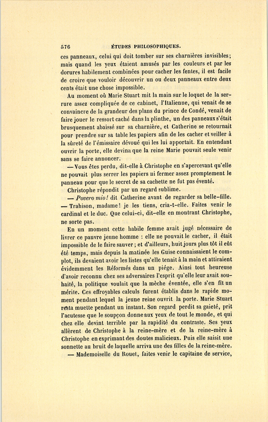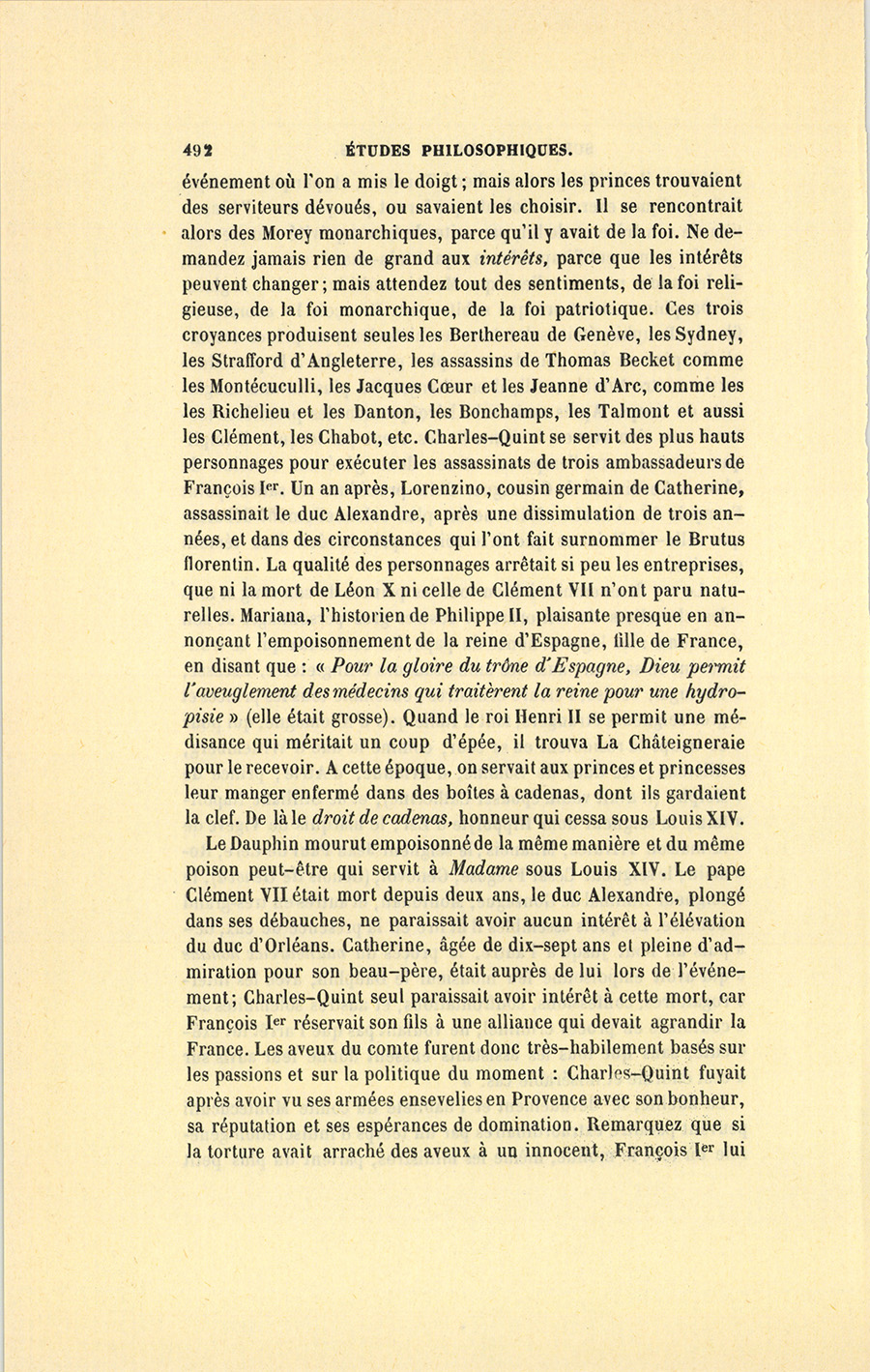 La fidélité, le dévouement et l’habileté du comte Montécuculli peuvent paraître extraordinaires par un temps d’indiscrétion générale où tout le monde, même les ministres, parlent du plus petit {p. 492} événement où l’on a mis le doigt ; mais alors les princes trouvaient des serviteurs dévoués, ou savaient les choisir. Il se rencontrait alors des Morey monarchiques, parce qu’il y avait de la foi. Ne demandez jamais rien de grand aux intérêts, parce que les intérêts peuvent changer ; mais attendez tout des sentiments, de la foi religieuse, de la foi monarchique, de la foi patriotique. Ces trois croyances produisent seules les Berthereau de Genève, les Sydney, les Strafford d’Angleterre, les assassins de Thomas Becket comme les Montécuculli, les Jacques Cœur et les Jeanne d’Arc, comme les Richelieu et les Danton, les Bonchamps, les Talmont et aussi les Clément, les Chabot, etc. Charles-Quint se servit des plus hauts personnages pour exécuter les assassinats de trois ambassadeurs de François Ier. Un an après, Lorenzino, cousin germain de Catherine, assassinait le duc Alexandre, après une dissimulation de trois années, et dans des circonstances qui l’ont fait surnommer le Brutus florentin. La qualité des personnages arrêtait si peu les entreprises, que ni la mort de Léon X ni celle de Clément VII n’ont paru naturelles. Mariana, l’historien de Philippe II, plaisante presque en annonçant l’empoisonnement de la reine d’Espagne, fille de France, en disant que : « Pour la gloire du trône d’Espagne, Dieu permit l’aveuglement des médecins qui traitèrent la reine pour une hydropisie » (elle était grosse). Quand le roi Henri II se permit une médisance qui méritait un coup d’épée, il trouva La Châteigneraie pour le recevoir. À cette époque, on servait aux princes et princesses leur manger enfermé dans des boîtes à cadenas, dont ils gardaient la clef. De là le droit de cadenas, honneur qui cessa sous Louis XIV.