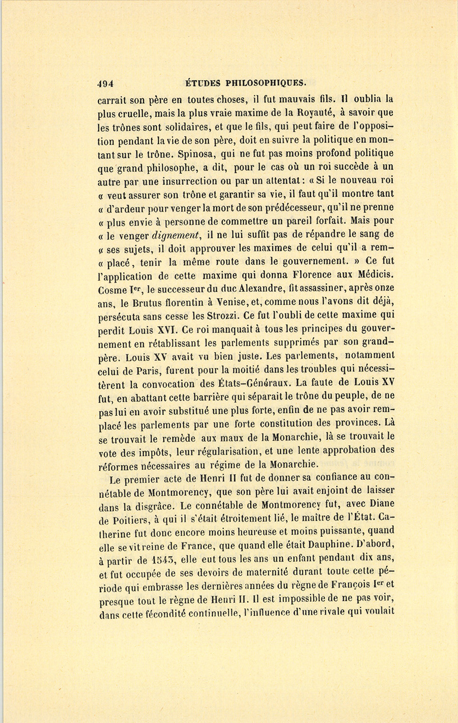Catherine, perdue au milieu du parti de madame d’Étampes et du parti de la sénéchale (tel fut pendant le règne de François Ier le titre de Diane) qui divisaient la cour et la politique entre ces deux ennemies mortelles, essaya d’être à la fois l’amie de la duchesse d’Étampes et l’amie de Diane de Poitiers. Celle qui devait être une si grande reine joua le rôle de servante. Elle fit ainsi l’apprentissage de cette politique à deux visages qui fut le secret de sa vie. La reine se trouva plus tard entre les Catholiques et les Calvinistes, comme la femme avait été pendant dix ans entre madame d’Étampes et madame de Poitiers. Elle étudia les contradictions de la politique française : François Ier soutenait Calvin et les Luthériens pour embarrasser Charles-Quint. Puis, après avoir sourdement et patiemment protégé la Réformation en Allemagne, après avoir toléré le séjour de Calvin à la cour de Navarre, il sévit contre elle avec une rigueur démesurée. Catherine vit donc cette cour et les femmes de cette cour jouant avec le feu de l’hérésie, Diane à la tête du parti catholique avec les Guise, uniquement parce que la duchesse d’Étampes soutenait Calvin et les Protestants. Telle fut l’éducation politique de cette reine qui remarqua dans le cabinet du roi de France les errements de la maison de Médicis. Le Dauphin {p. 494} contre-carrait son père en toutes choses, il fut mauvais fils. Il oublia la plus cruelle, mais la plus vraie maxime de la Royauté, à savoir que les trônes sont solidaires, et que le fils, qui peut faire de l’opposition pendant la vie de son père, doit en suivre la politique en montant sur le trône. Spinosa, qui ne fut pas moins profond politique que grand philosophe, a dit, pour le cas où un roi succède à un autre par une insurrection ou par un attentat : « Si le nouveau roi veut assurer son trône et garantir sa vie, il faut qu’il montre tant d’ardeur pour venger la mort de son prédécesseur, qu’il ne prenne plus envie à personne de commettre un pareil forfait. Mais pour le venger dignement, il ne lui suffit pas de répandre le sang de ses sujets, il doit approuver les maximes de celui qu’il a remplacé, tenir la même route dans le gouvernement. » Ce fut l’application de cette maxime qui donna Florence aux Médicis. Cosme Ier, le successeur du duc Alexandre, fit assassiner, après onze ans, le Brutus florentin à Venise, et, comme nous l’avons dit déjà, persécuta sans cesse les Strozzi. Ce fut l’oubli de cette maxime qui perdit Louis XVI. Ce roi manquait à tous les principes du gouvernement en rétablissant les parlements supprimés par son grand-père. Louis XV avait vu bien juste. Les parlements, notamment celui de Paris, furent pour la moitié dans les troubles qui nécessitèrent la convocation des États-Généraux. La faute de Louis XV fut, en abattant cette barrière qui séparait le trône du peuple, de ne pas lui en avoir substitué une plus forte, enfin de ne pas avoir remplacé les parlements par une forte constitution des provinces. Là se trouvait le remède aux maux de la Monarchie, là se trouvait le vote des impôts, leur régularisation, et une lente approbation des réformes nécessaires au régime de la Monarchie.